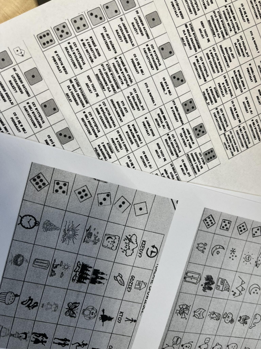 Po ćwiczeniu graficznym przyszedł czas na zadania redakcyjne. Uczniowie z wykorzystaniem gotowych diagramów tworzyli w grze turlane opowieści (rolled stories). Każdy wers wykresów odpowiada innej