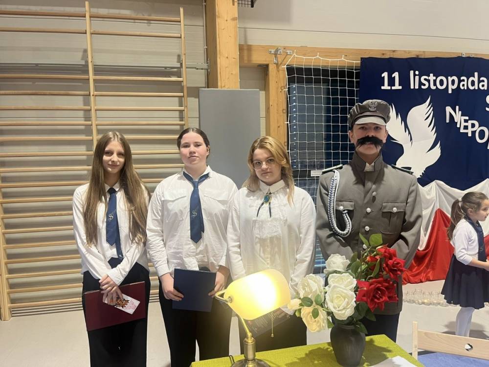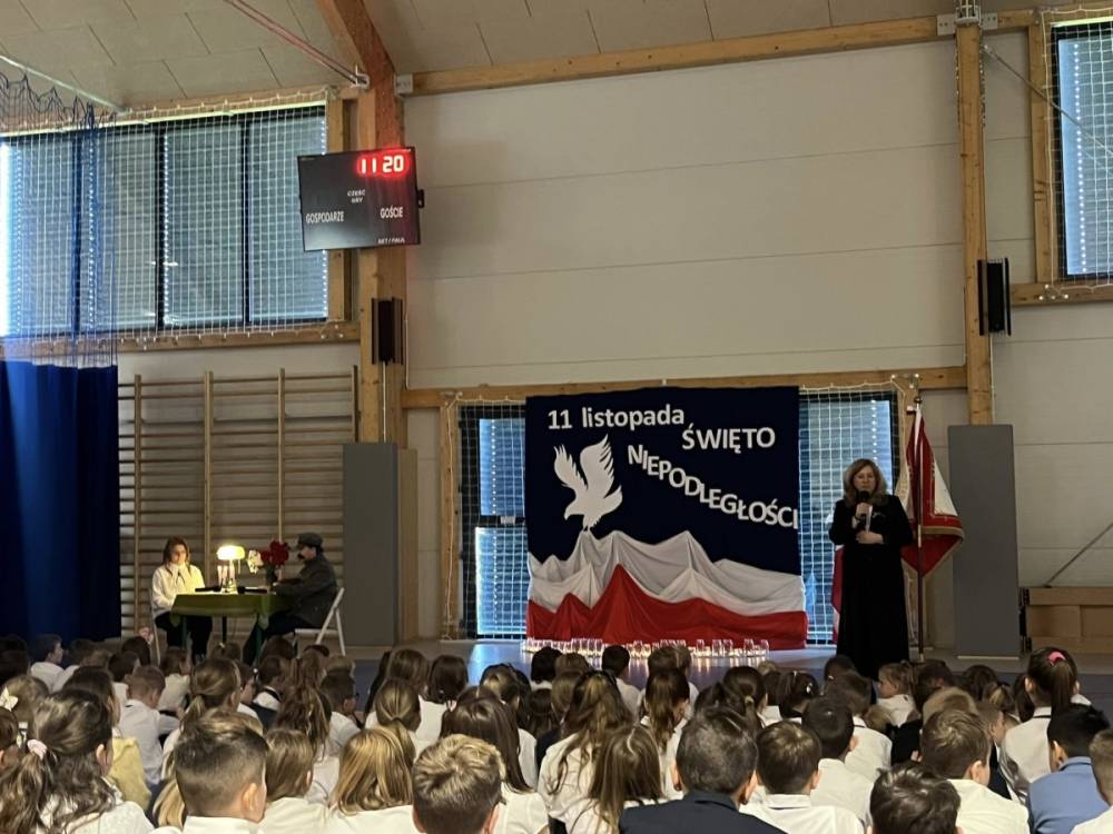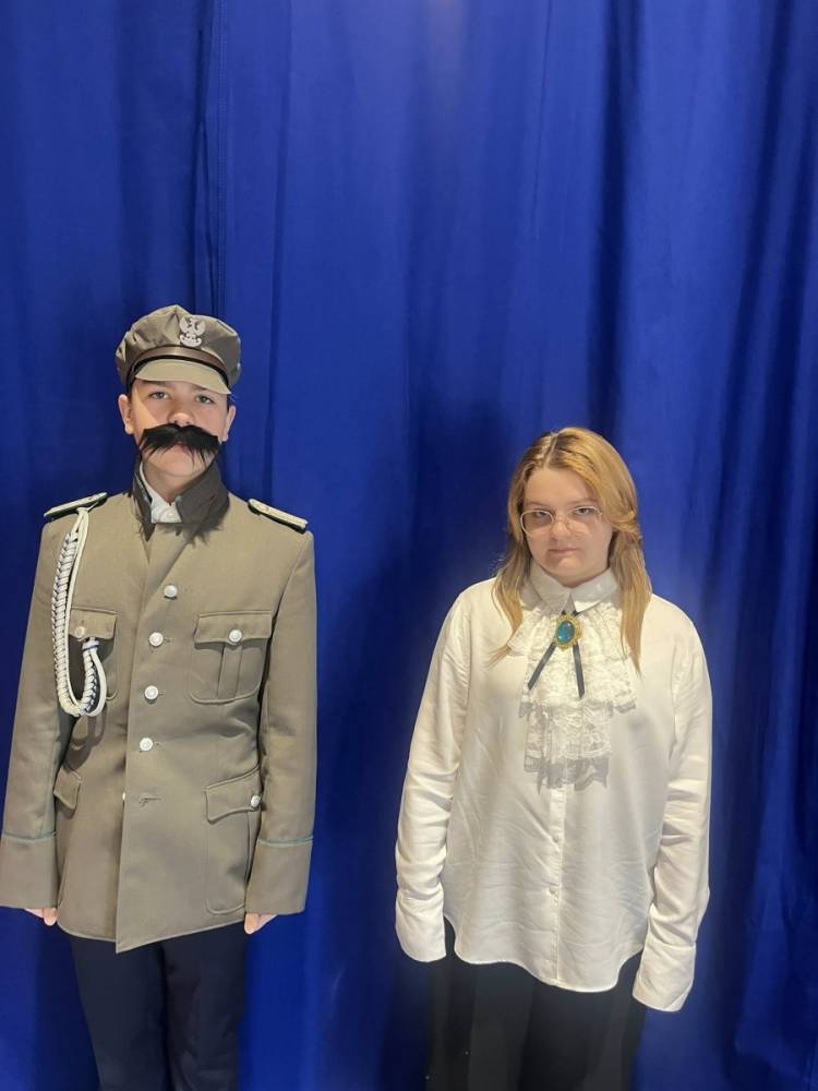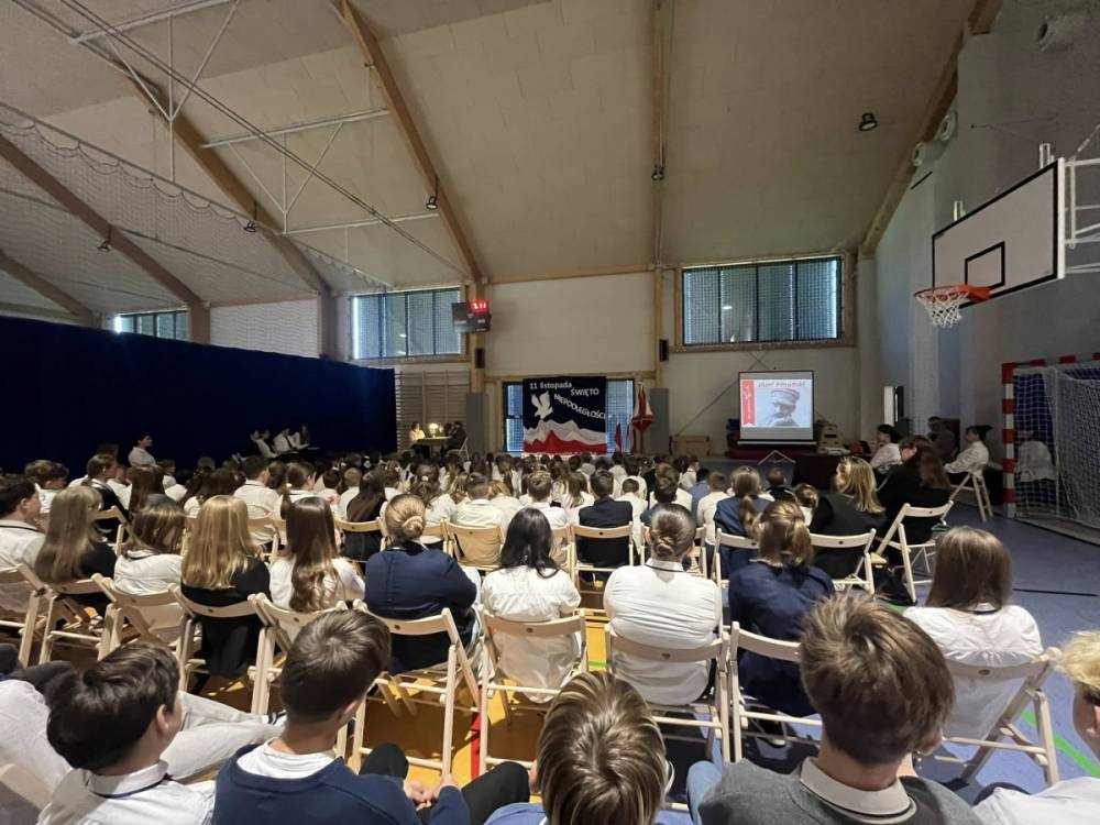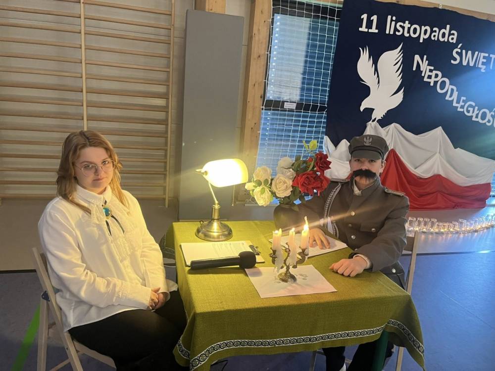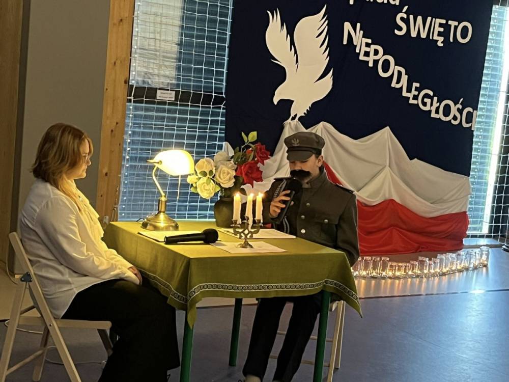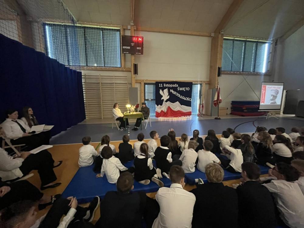 Podczas apelu uczniowie z klasy VII i VIII przybliżyli nam okoliczności towarzyszące procesowi odzyskiwania niepodległości. Odegrana została scenka wywiadu z marszałkiem Józefem Piłsudskim, podczas którego nasz Bohater opowiadał o walce o niepodległość i o zadaniach stojących przed Polakami. Większość wypowiadanych kwestii stanowiły autentyczne słowa Józefa Piłsudskiego.