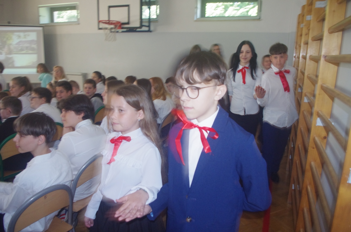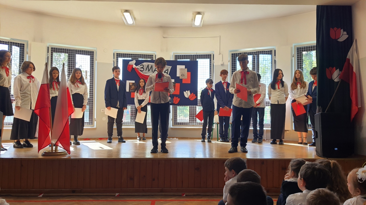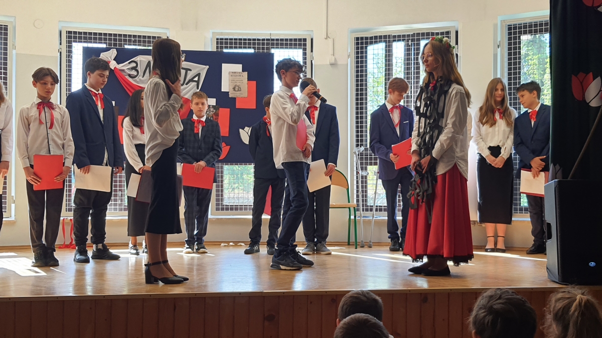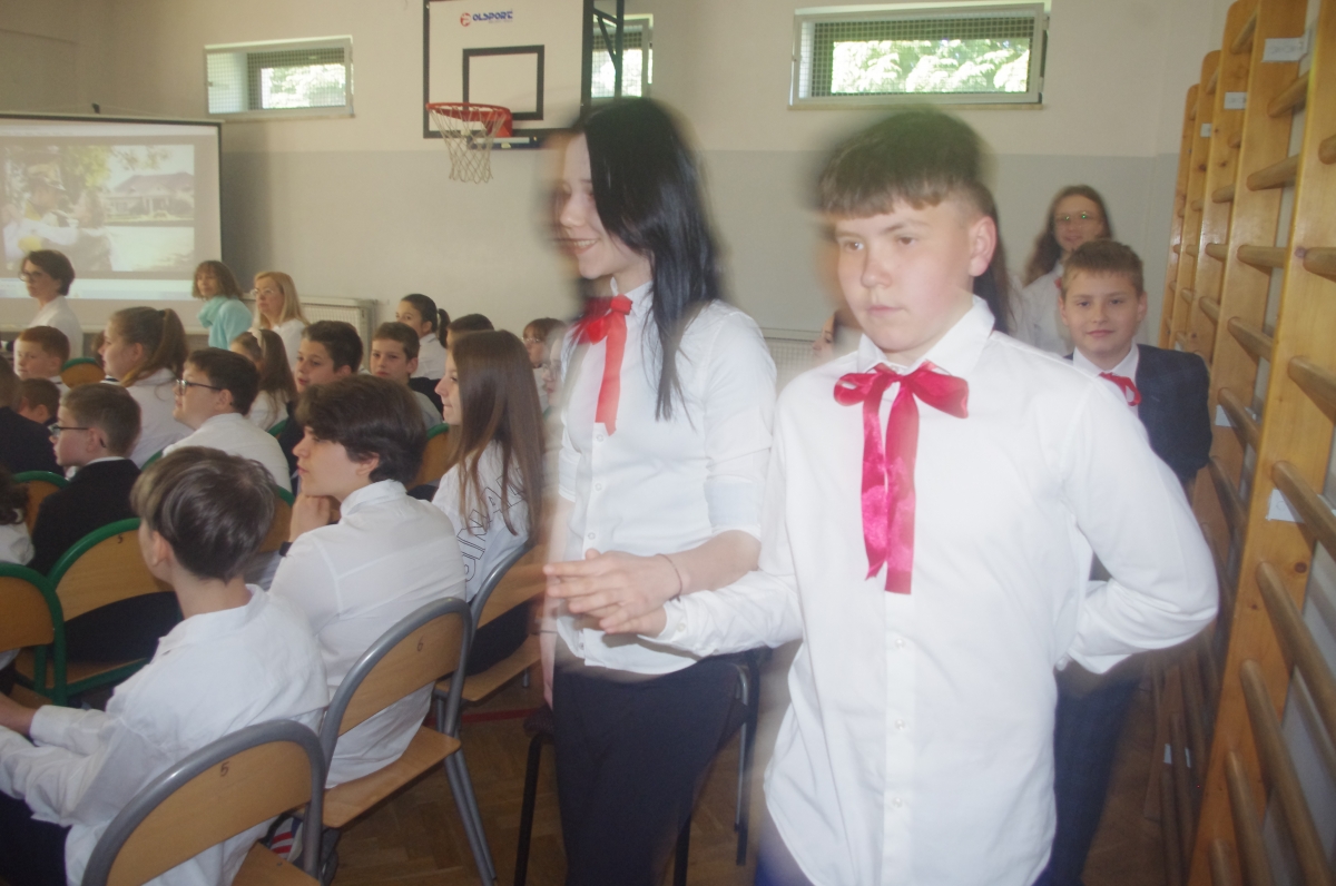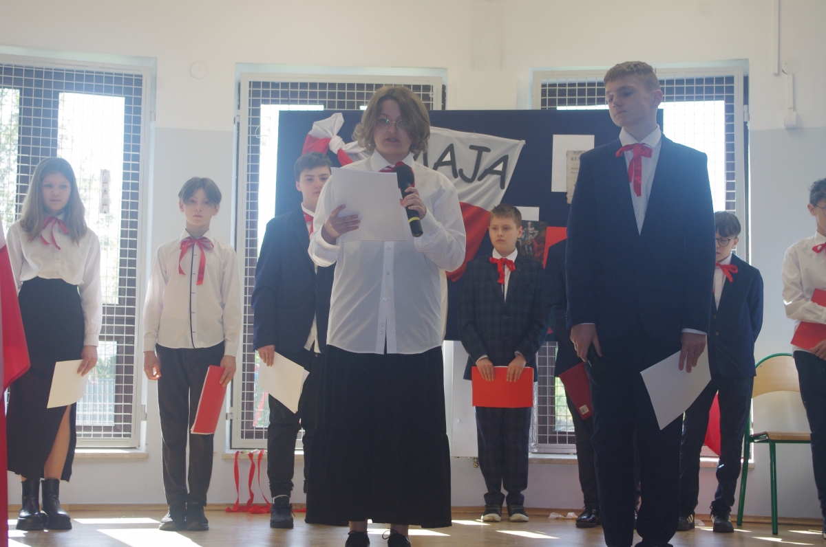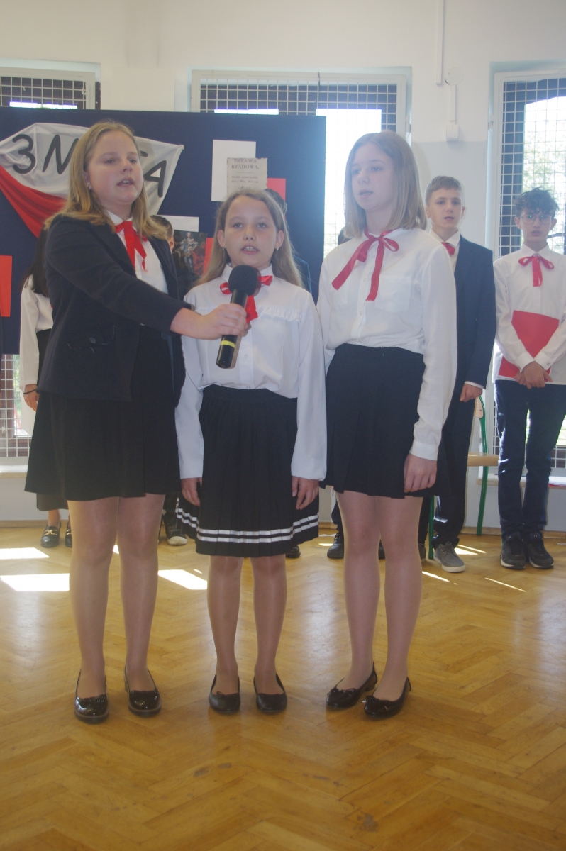Chcąc przybliżyć to ważne wydarzenie z historii naszego kraju, uczniowie z klasy VI wraz z uczennicami z klasy V i VIII wystąpili w montażu słowno – muzycznym. Występ rozpoczął tradycyjny polski taniec „Polonez”. Podniosły i uroczysty nastrój spotkania podkreśliło wprowadzenia pocztu sztandarowego i odśpiewane w postawie stojącej „Hymnów” – narodowego oraz szkolnego.