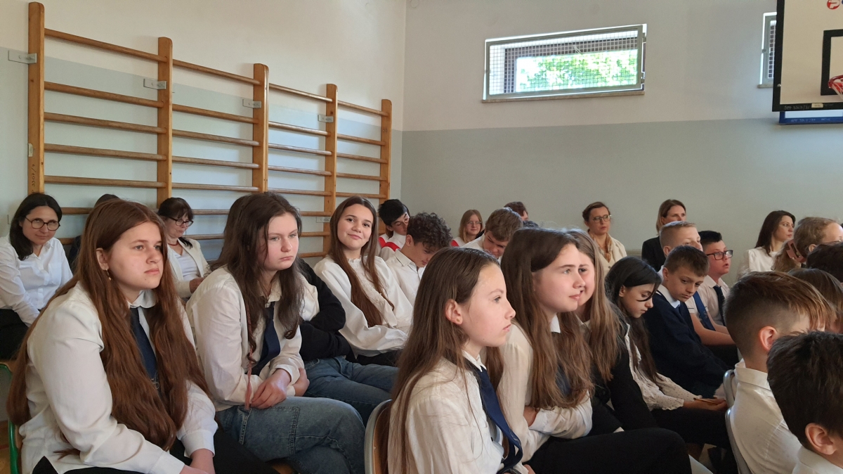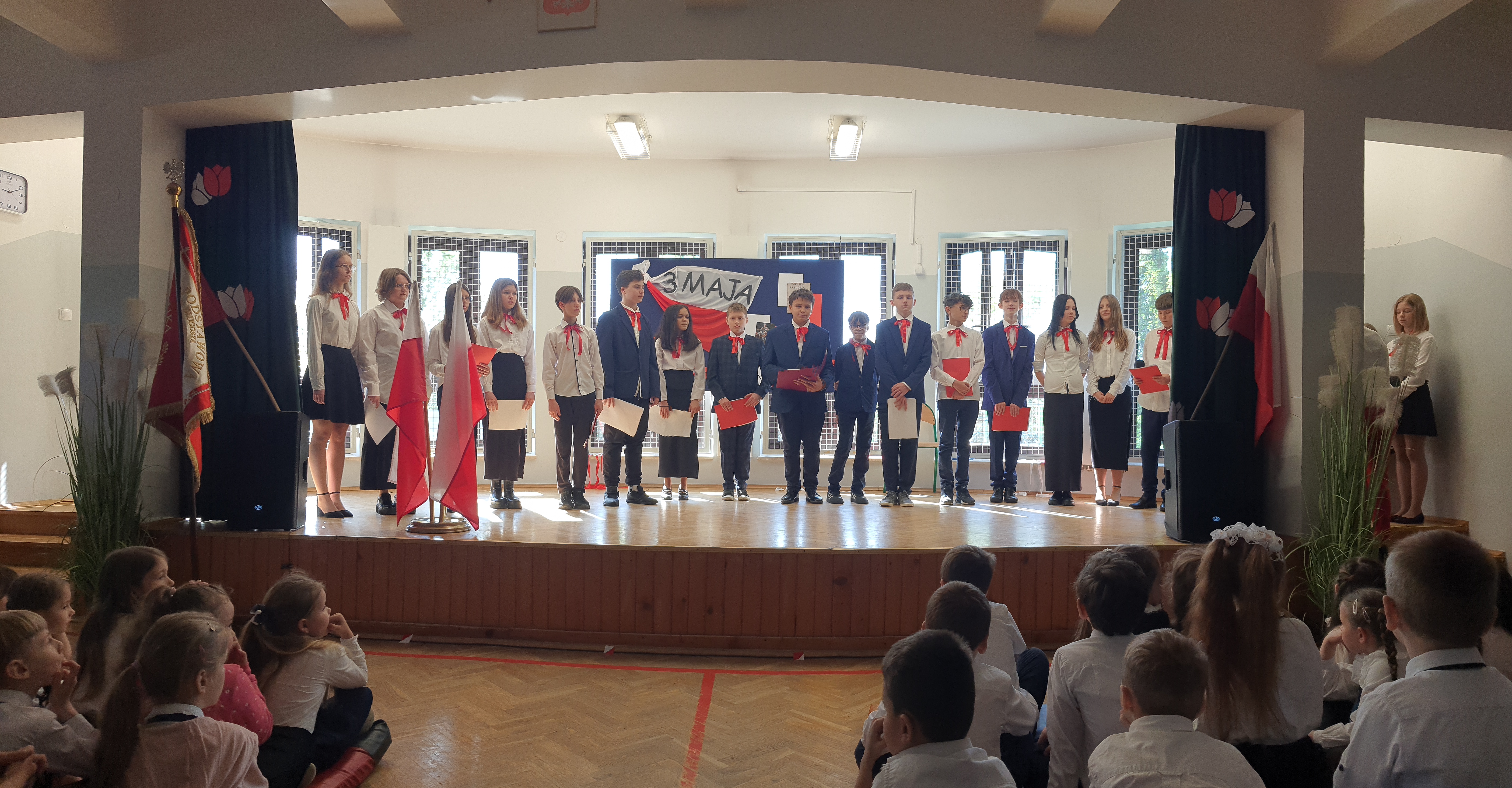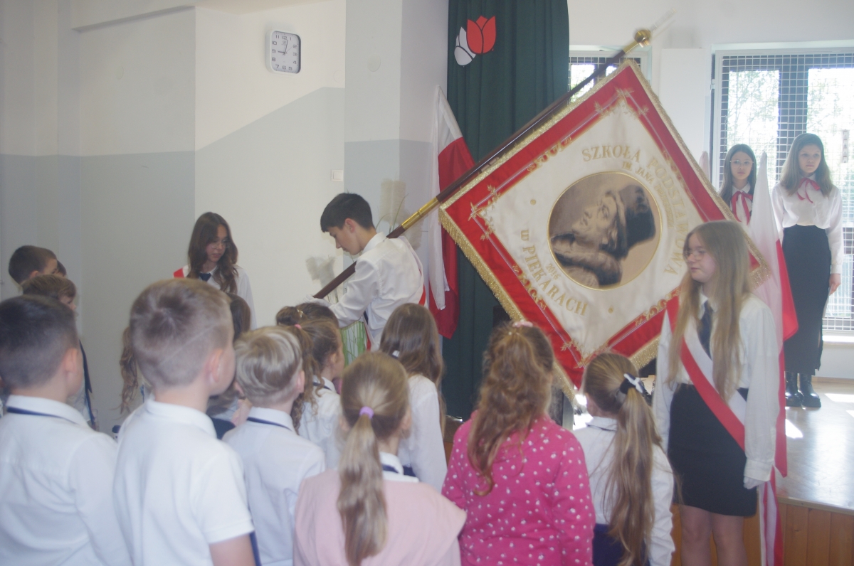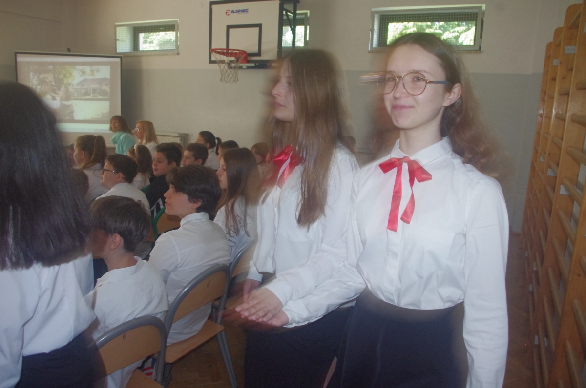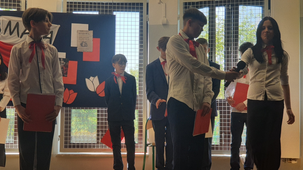 Chcąc przybliżyć to ważne wydarzenie z historii naszego kraju, uczniowie z klasy VI wraz z uczennicami z klasy V i VIII wystąpili w montażu słowno – muzycznym. Występ rozpoczął tradycyjny polski taniec „Polonez”. Podniosły i uroczysty nastrój spotkania podkreśliło wprowadzenia pocztu sztandarowego i odśpiewane w postawie stojącej „Hymnów” – narodowego oraz szkolnego.