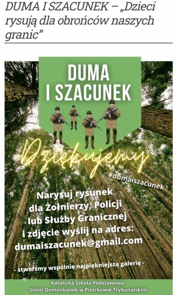 Uczniowie z naszej szkoły biorą udział w akcji DUMA I SZACUNEK „Dzieci rysują dla obrońców naszych granic” zorganizowanej przez Siostry Dominikanki prowadzące katolicką szkołę i przedszkole im. bł. s. Julii Rodzińskiej w Piotrkowie Trybunalskim.