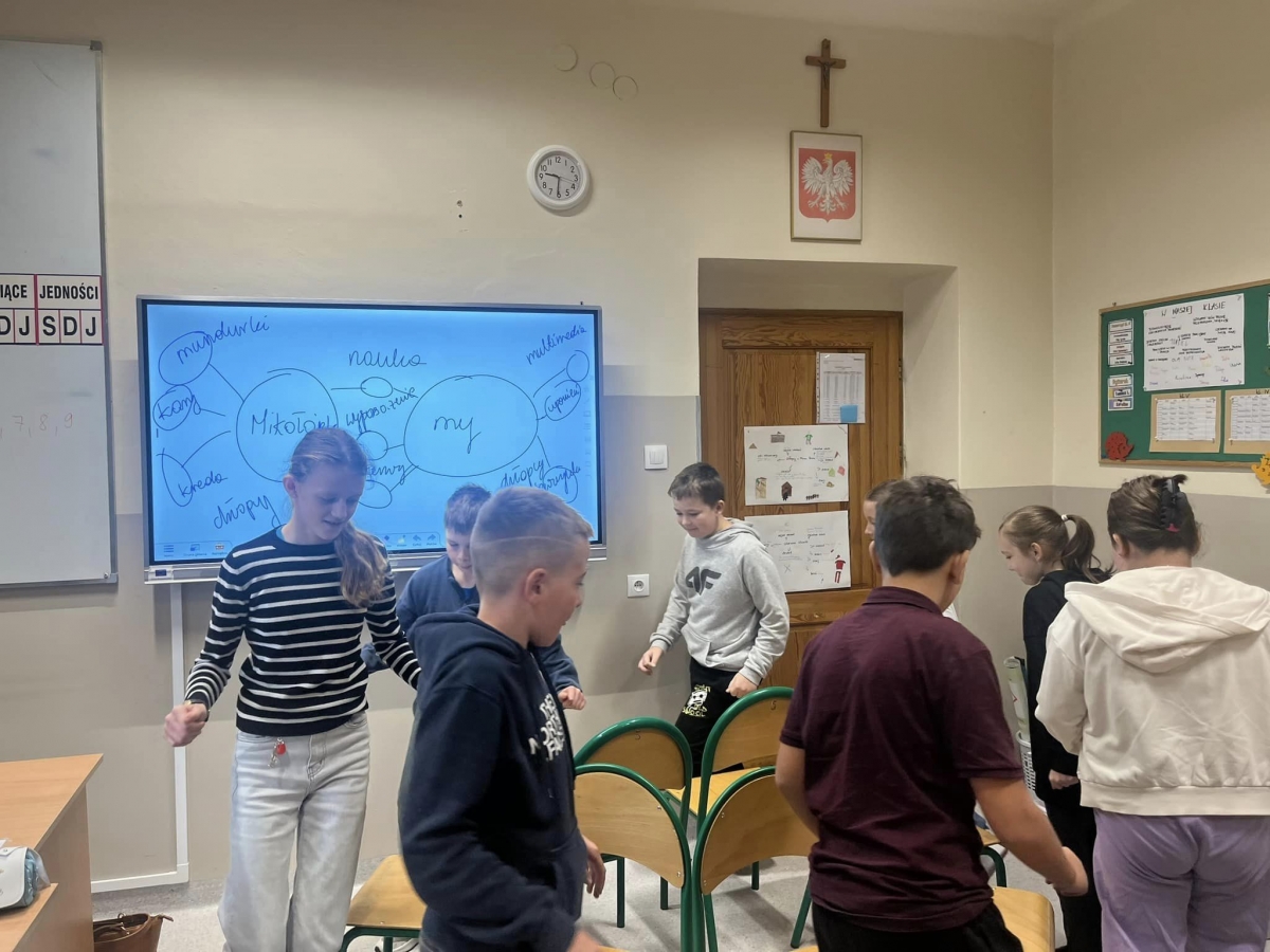 Gdy uczniowie mieli za zadanie porównać szkołę przedstawioną w opowiadaniach o grupie przyjaciół oraz współczesną naukę, sami wybrali jako najtrafniejszą do zastosowania rutynę double buble. Aby w pracy z lekturą jeszcze bardziej aktywizować młodzież do zajęć zostały wprowadzone elementy gry i rywalizacji. Świetnie sprawdziła się innowacja pedagogiczna „Sprawdzam bez sprawdzania” skupiająca się na wykorzystaniu aktywizujących metod pracy, rutyn, gier edukacyjnych czy autorskich pomocy dydaktycznych. W sprawdzeniu wiadomości z treści lektury pomogła gra ruchowa, która z kolei wpisała się w realizację innowacji pedagogicznej „Aktywny polski” mającej na celu wprowadzenie ćwiczeń gimnastycznych do zajęć języka polskiego. W czasie zabawy ruchowej dzieci miały ustawione krzesła w kole. Miejsc do siedzenia było o jedno mniej niż uczniów. Dzieci swobodnie biegały wokół krzeseł, a na znak dany przez nauczyciela próbowały zająć miejsce. Osoba, która została bez krzesła, odpowiadała na pytania związane zlekturą „Mikołajka”. Gra zaangażowała wszystkich, zarówno uczestników zmagań, jak i zespół klasowy dopingujący faworytów! Emocje były ogromne.
