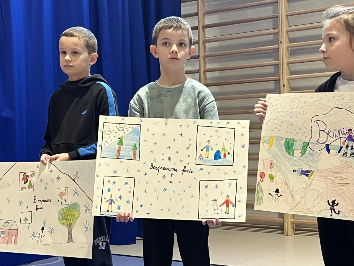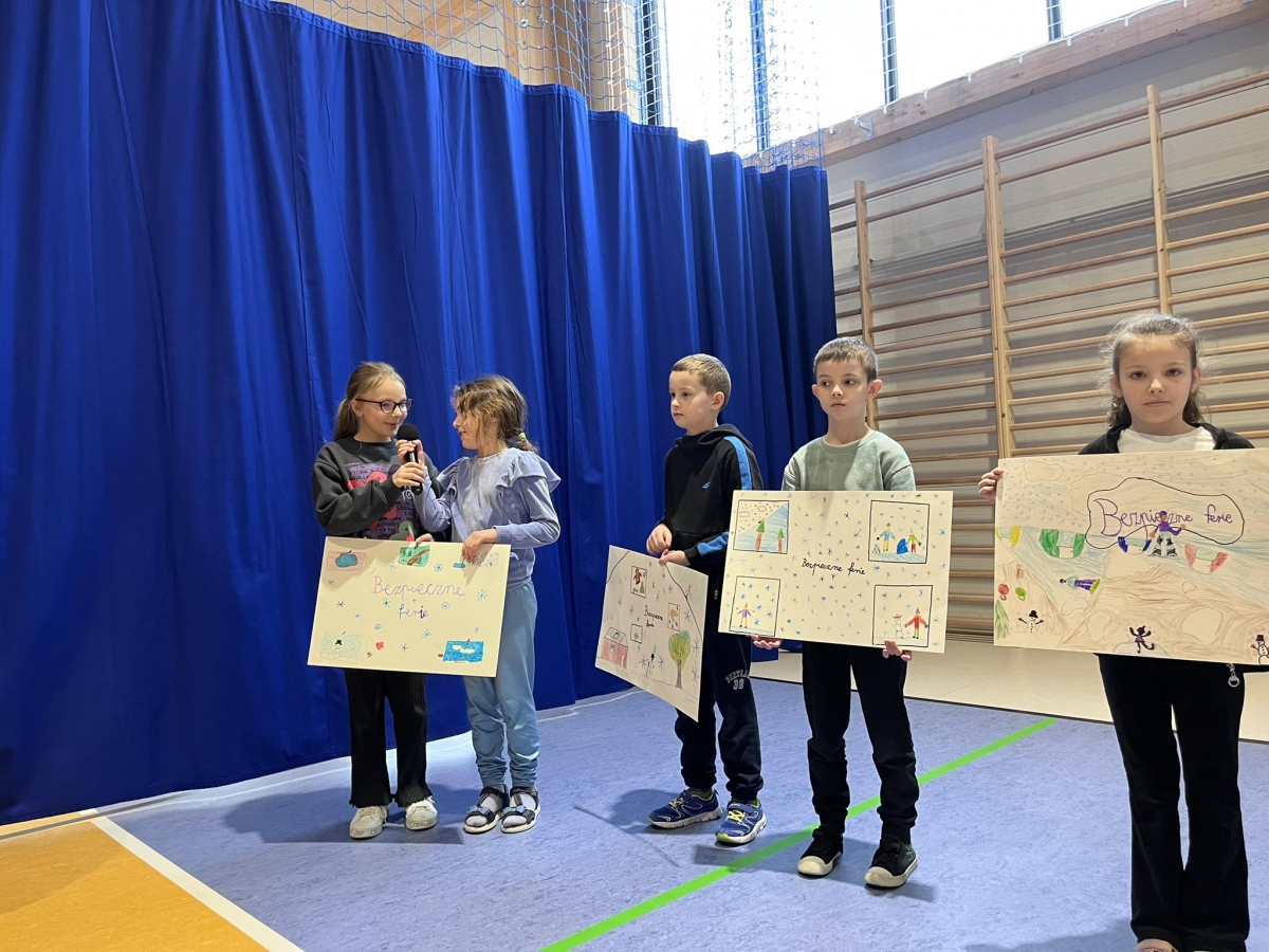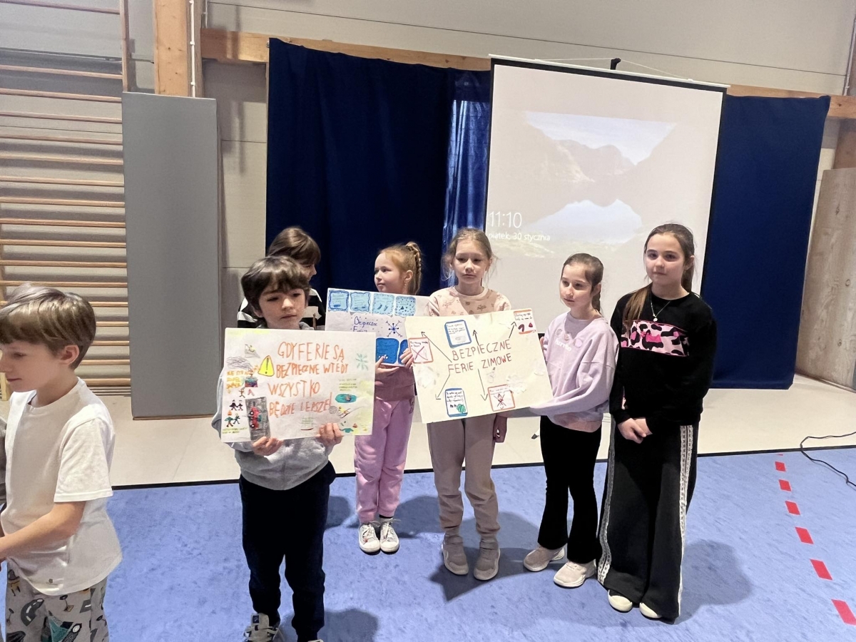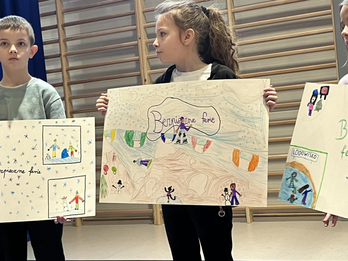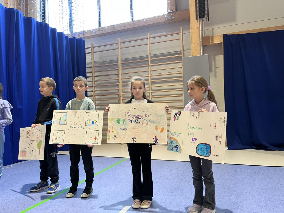 Ferie zimowe to czas odpoczynku od nauki i okres zabaw. W czasie apelu przypomniane były zasady bezpiecznego zachowania się podczas zabaw zimowych. Uczniowie oglądnęli filmy edukacyjne, a także omawiali najważniejsze zasady bezpieczeństwa zamieszczone na plakatach.