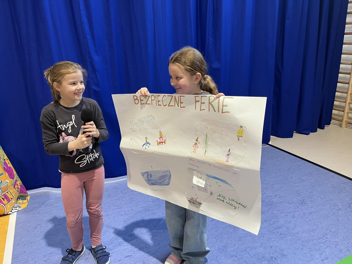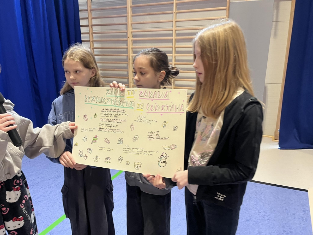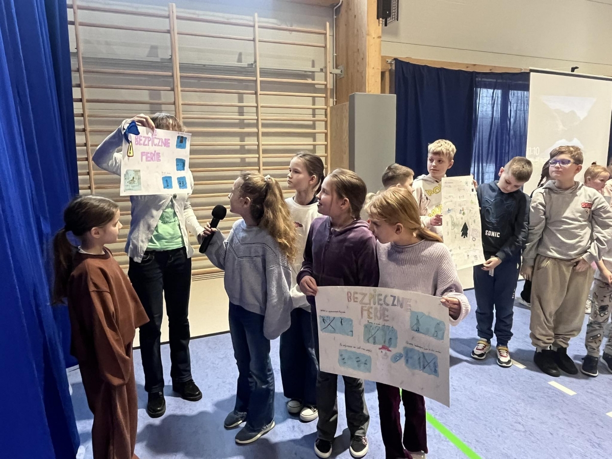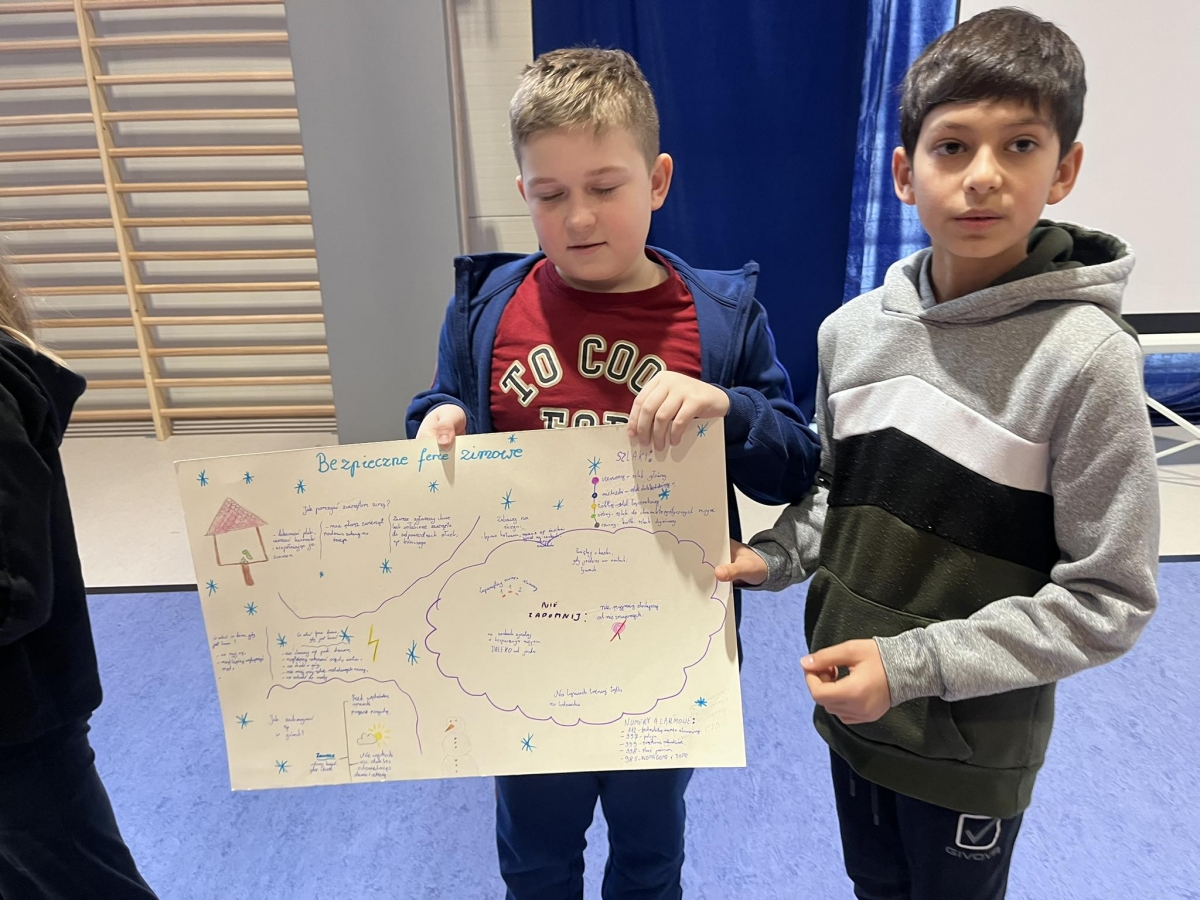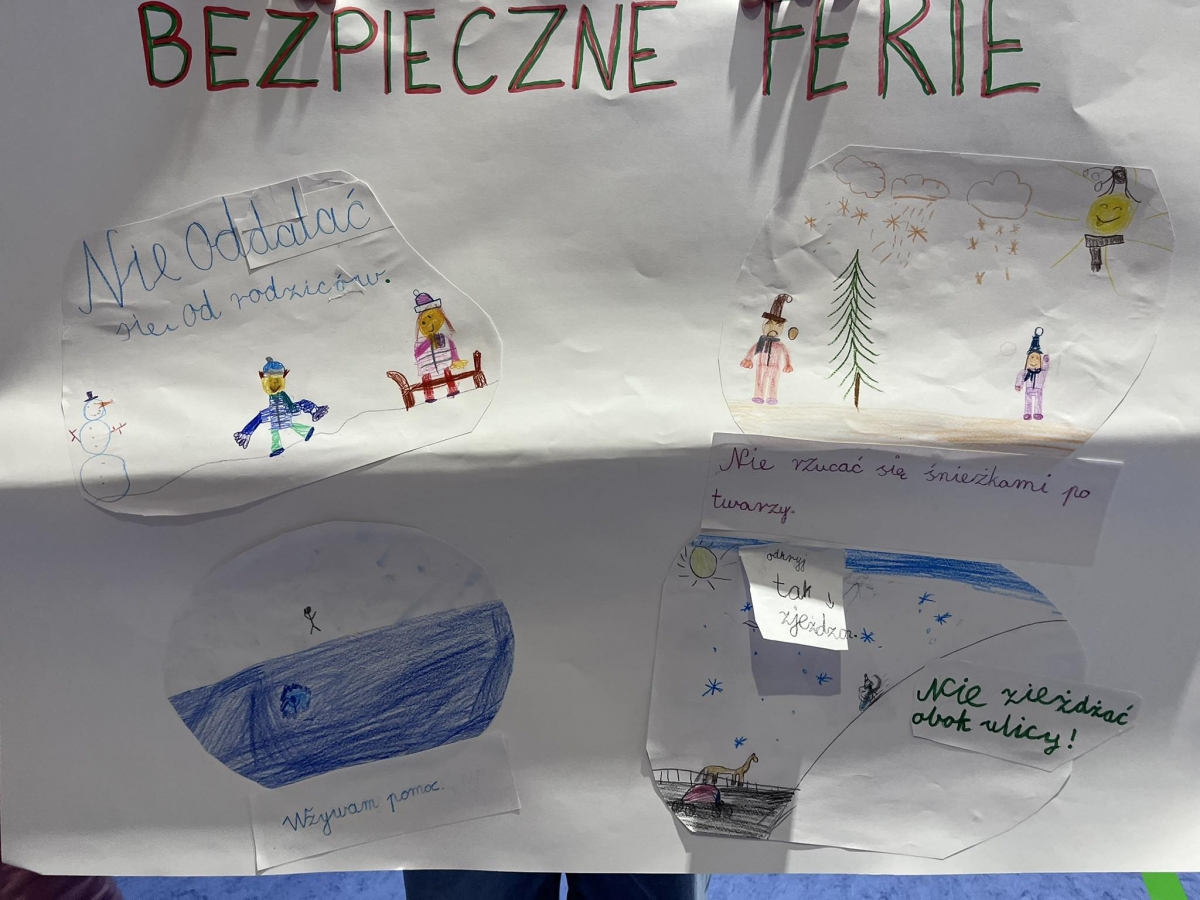 Ferie zimowe to czas odpoczynku od nauki i okres zabaw. W czasie apelu przypomniane były zasady bezpiecznego zachowania się podczas zabaw zimowych. Uczniowie oglądnęli filmy edukacyjne, a także omawiali najważniejsze zasady bezpieczeństwa zamieszczone na plakatach.