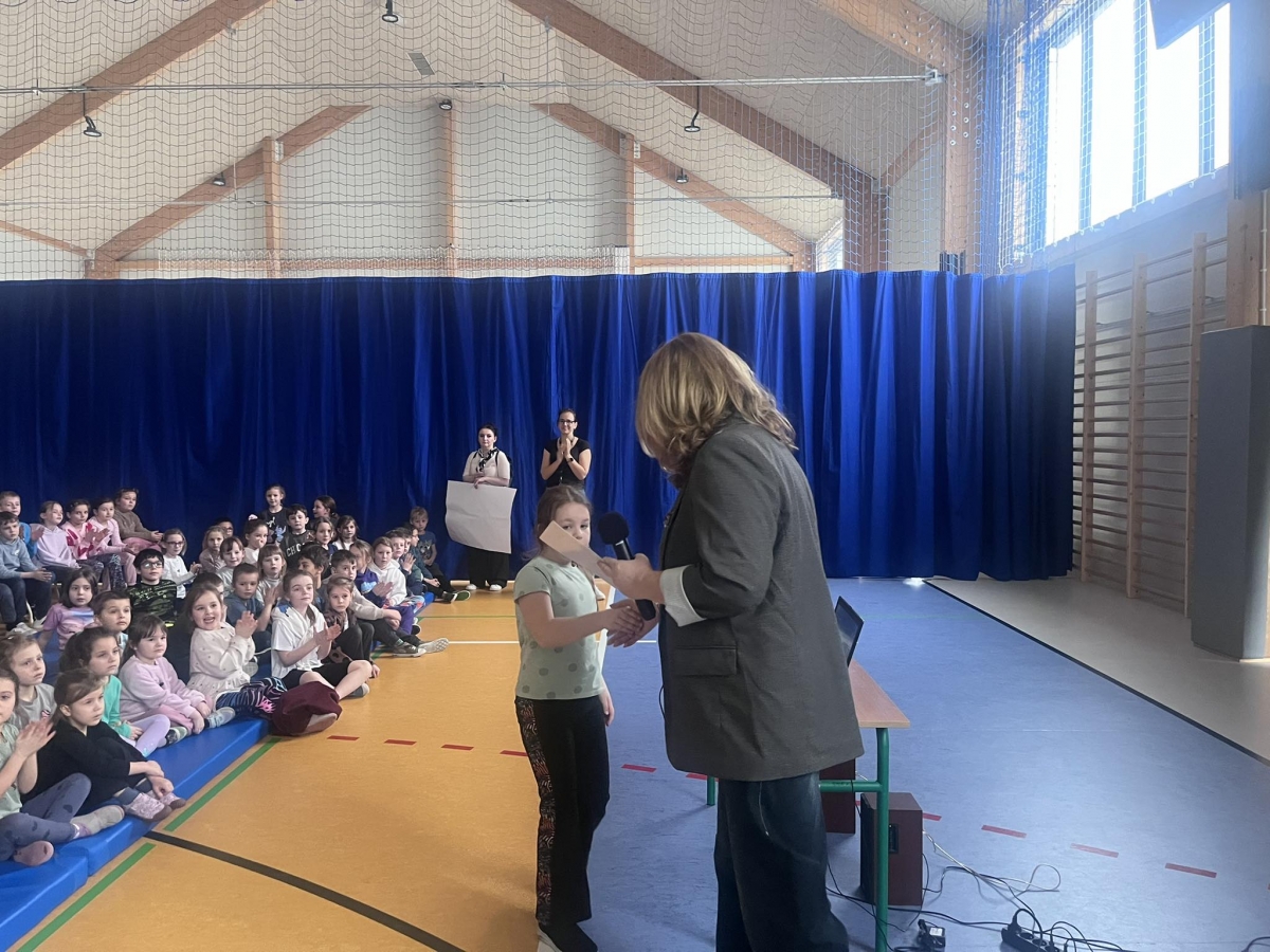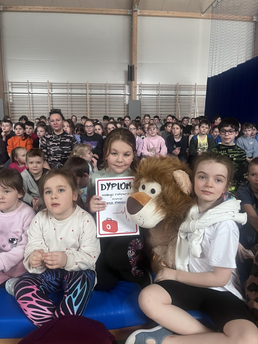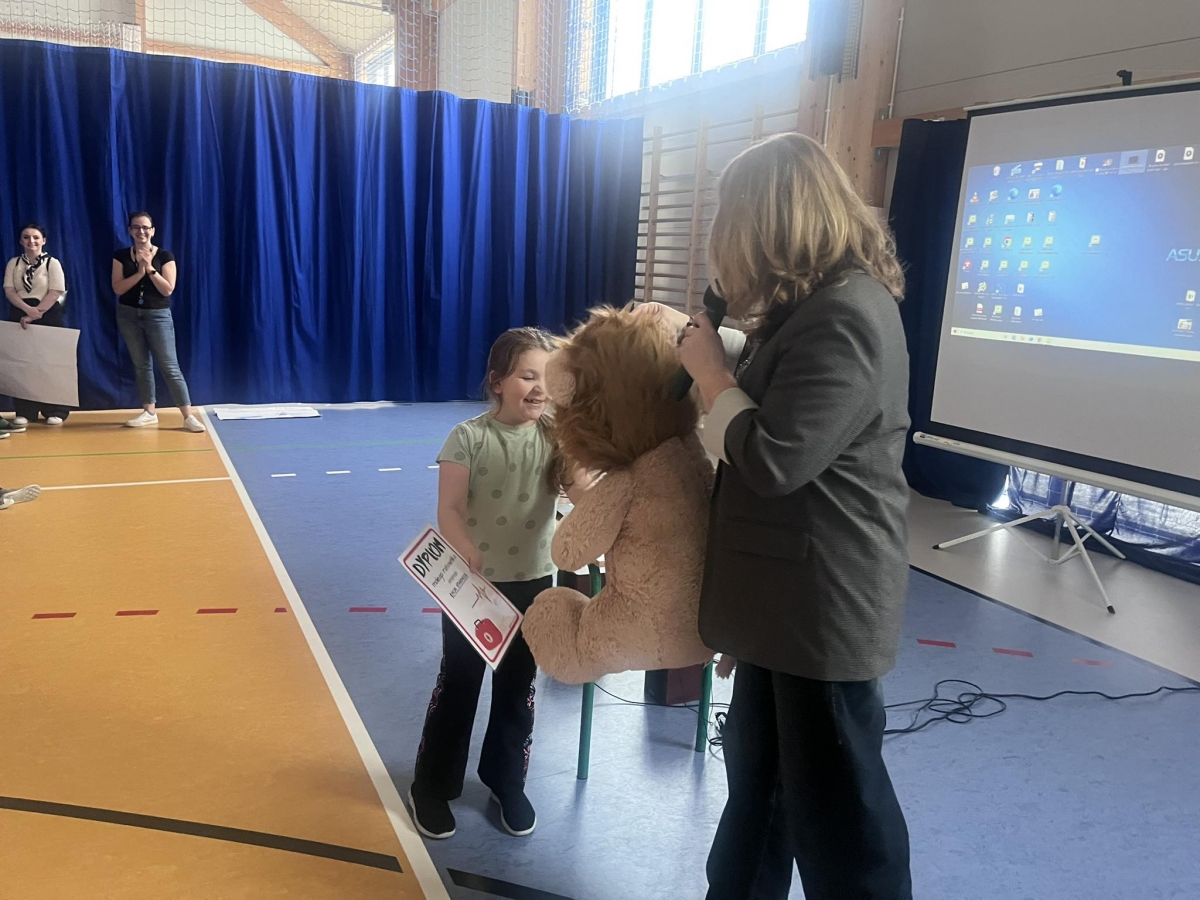 Podczas szkolnego apelu Pani Dyrektor z dumą wręczyła uczennicy klasy I a Łucji Starowicz wyjątkowy dyplom „Małego Ratownika” oraz pięknego pluszowego lwa w dowód niezwykłej odwagi i opanowania w trudnej sytuacji. Dziewczynka, nie tracąc zimnej krwi, gdy nauczycielka zasłabła, poprosiła o pomoc dorosłego. Łucja dała przykład odpowiedzialności i troski o innych. Jej postawa zasługuje na najwyższe uznanie. To piękny dowód na to, że nawet najmłodsi uczniowie potrafią zachować się dojrzale i mądrze w sytuacjach wymagających szybkiego działania.