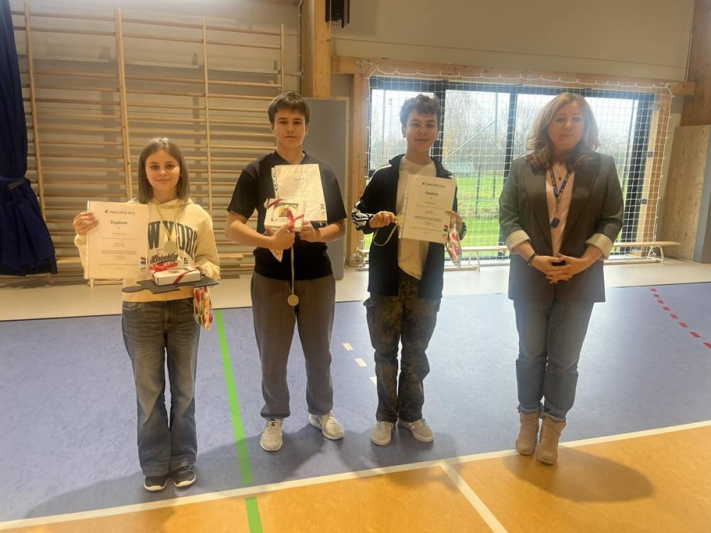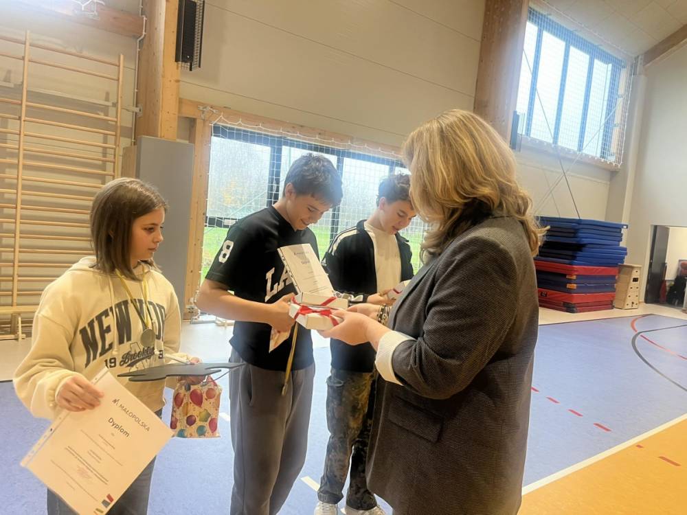 W czasie apelu Emilia Strojnowska z kl. VI, Mikołaj Starowicz z kl. VII oraz Jan Salamon z kl. VIII odebrali z rąk Pani Dyrektor upominki i dyplomy za reprezentację szkoły w Małopolskim Konkursie Recytatorskim.