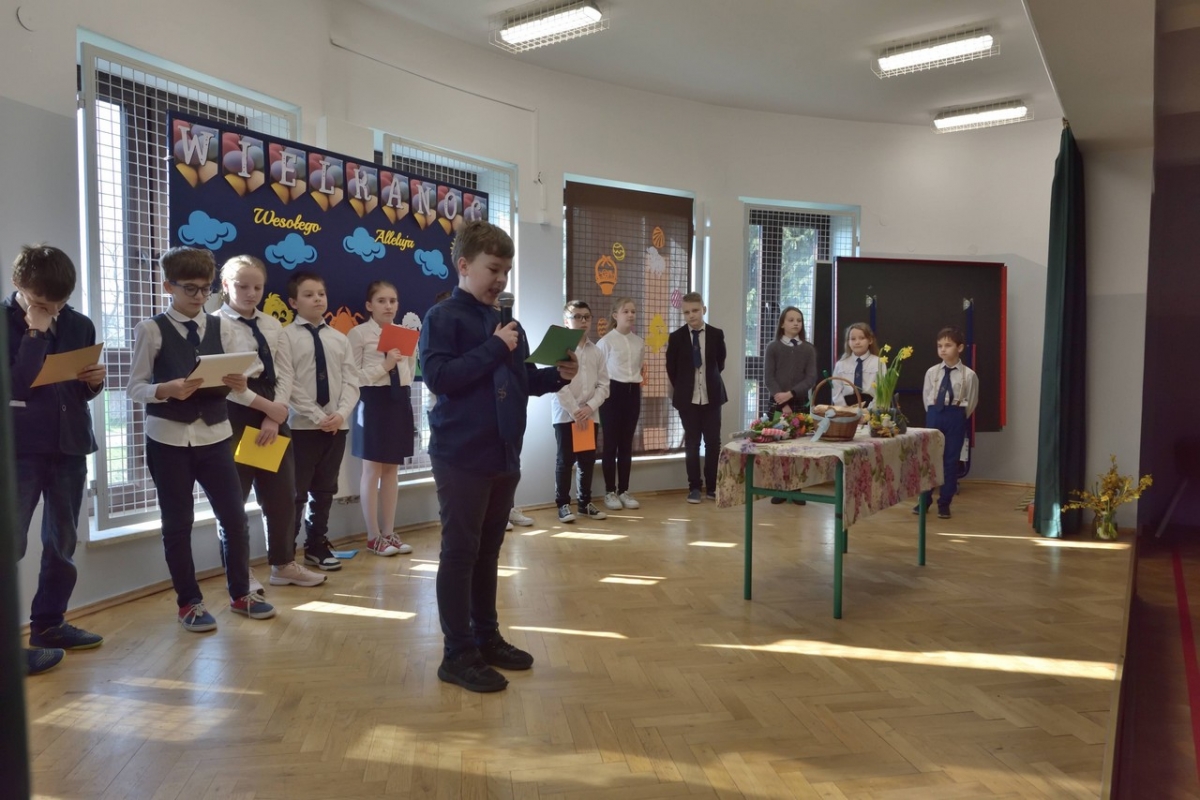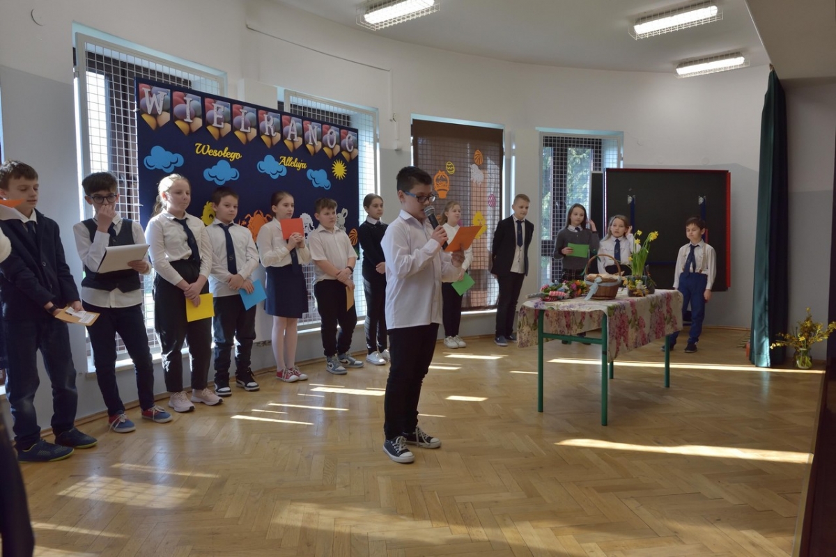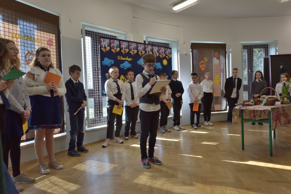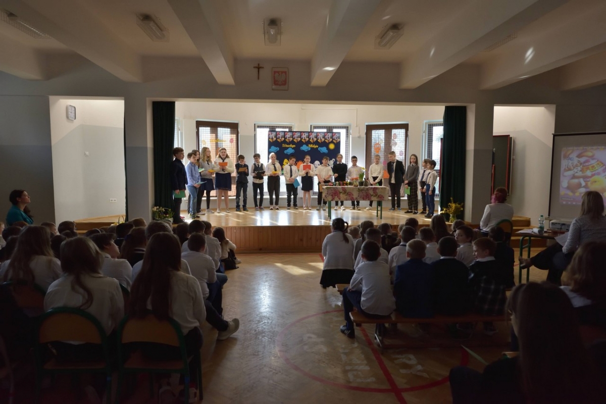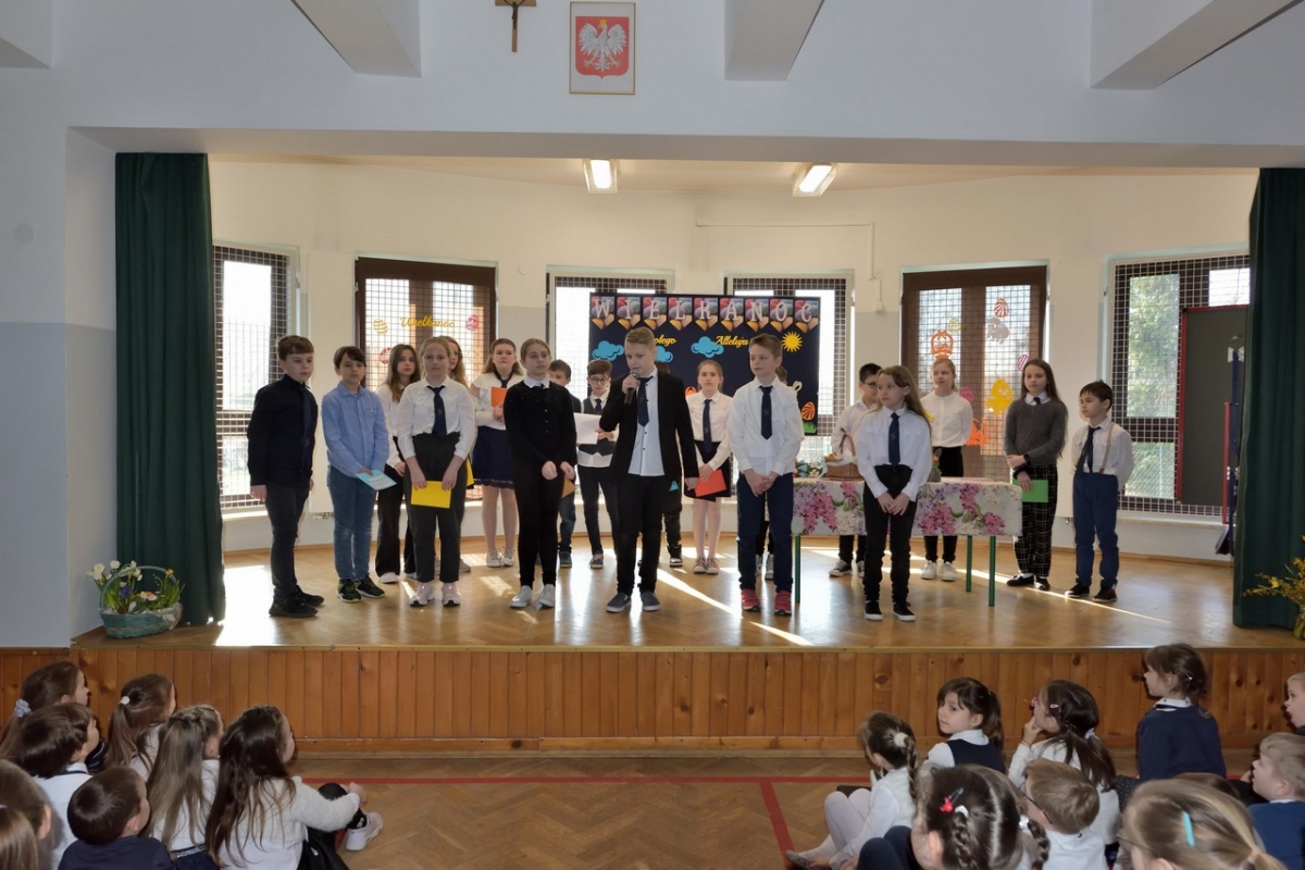 Uczniowie zaprezentowali zwyczaje wielkanocne i przybliżyli symbolikę świąt. Program był wypełniony piosenkami, nie zabrakło również koszyczka ze święconką, pisanek oraz śmigusa-dyngusa, a malownicza sceneria wprowadziła wszystkich w miły, wielkanocny nastrój.