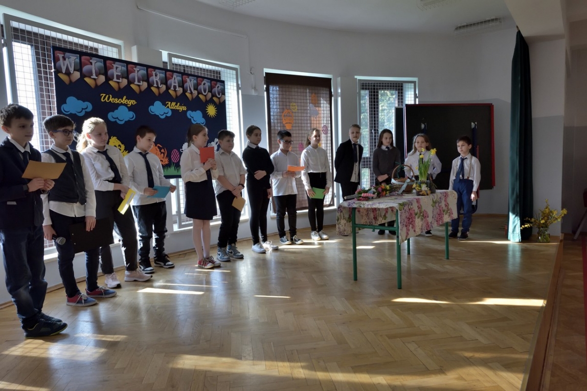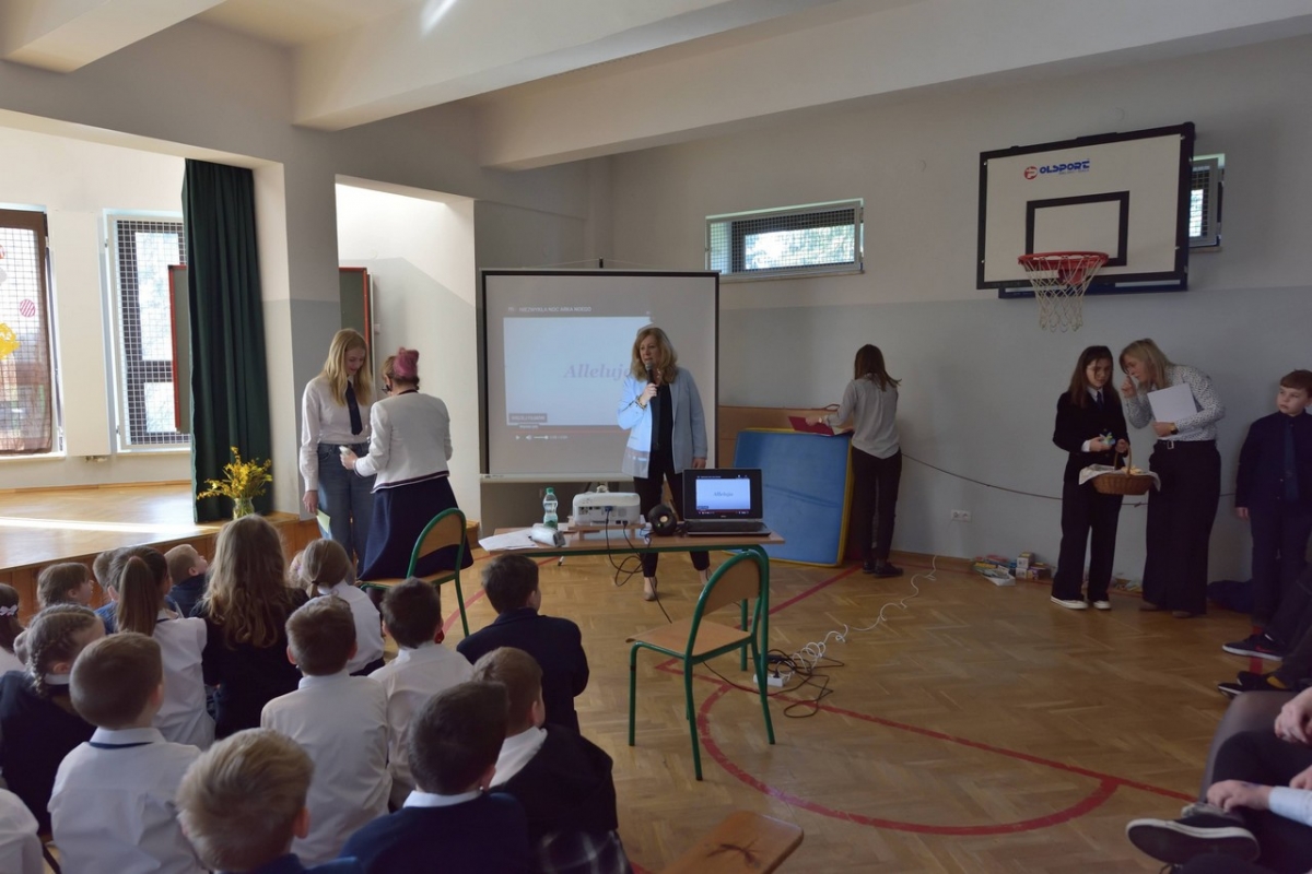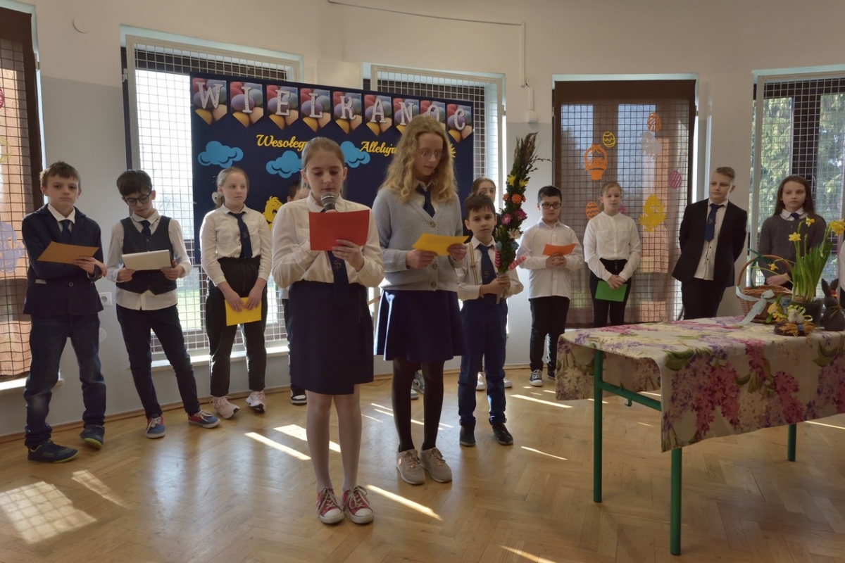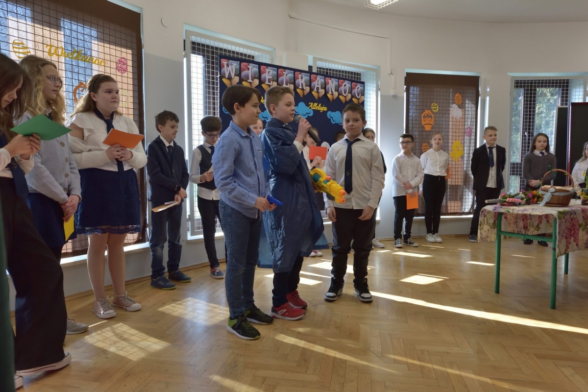Uczniowie zaprezentowali zwyczaje wielkanocne i przybliżyli symbolikę świąt. Program był wypełniony piosenkami, nie zabrakło również koszyczka ze święconką, pisanek oraz śmigusa-dyngusa, a malownicza sceneria wprowadziła wszystkich w miły, wielkanocny nastrój.
