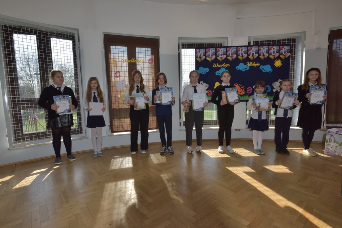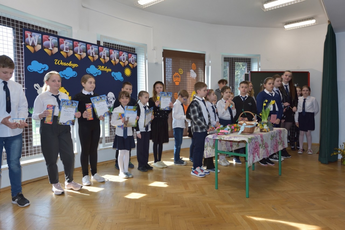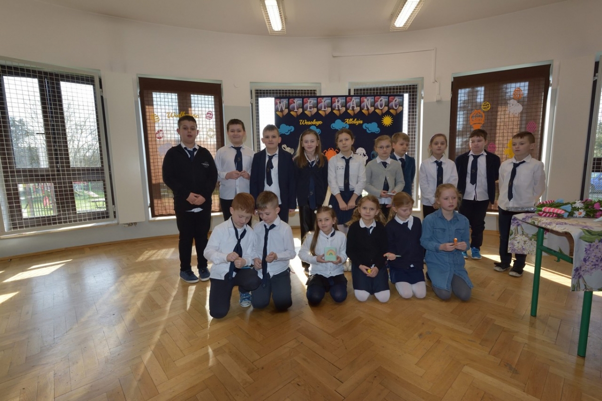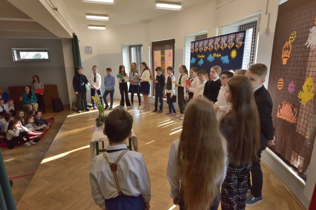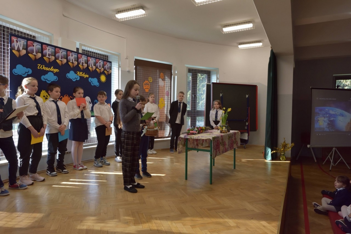 Uczniowie zaprezentowali zwyczaje wielkanocne i przybliżyli symbolikę świąt. Program był wypełniony piosenkami, nie zabrakło również koszyczka ze święconką, pisanek oraz śmigusa-dyngusa, a malownicza sceneria wprowadziła wszystkich w miły, wielkanocny nastrój.