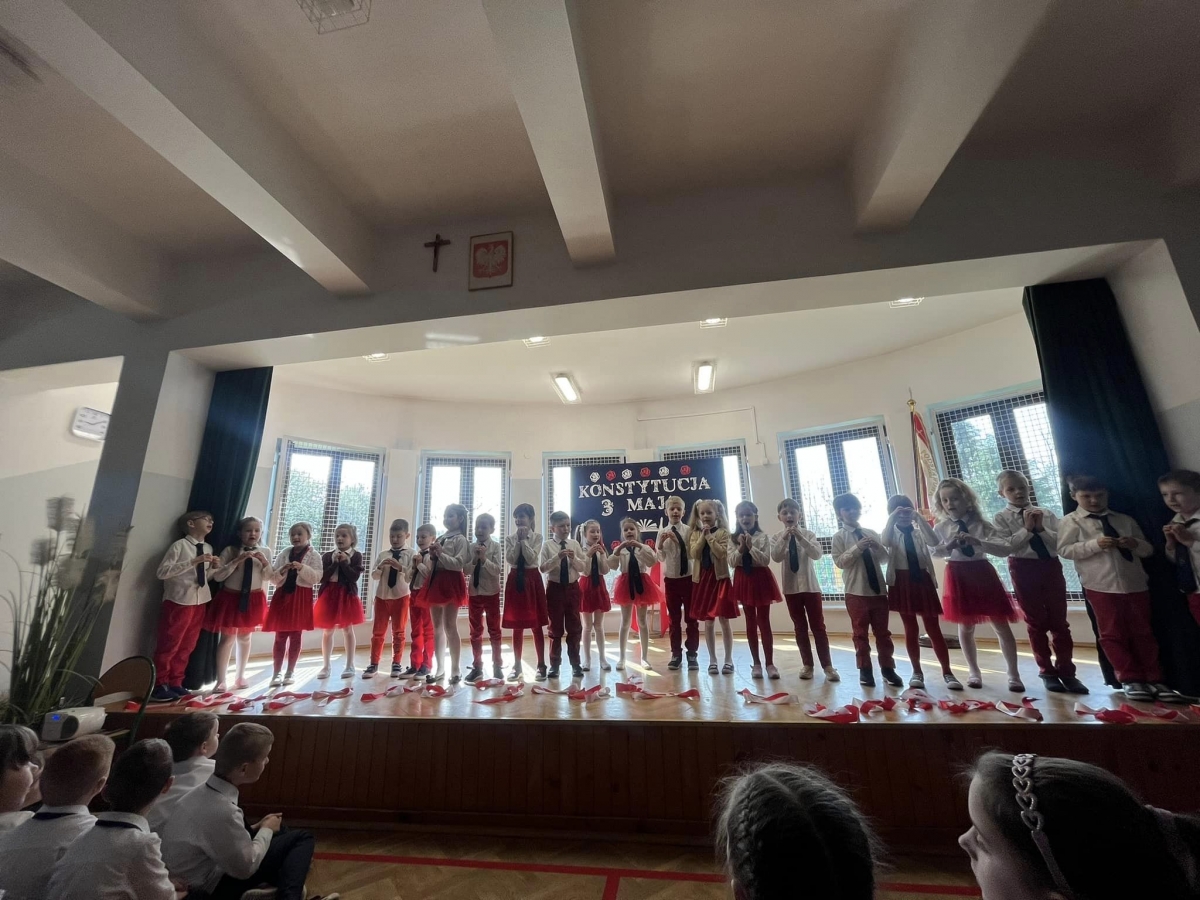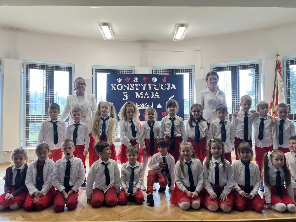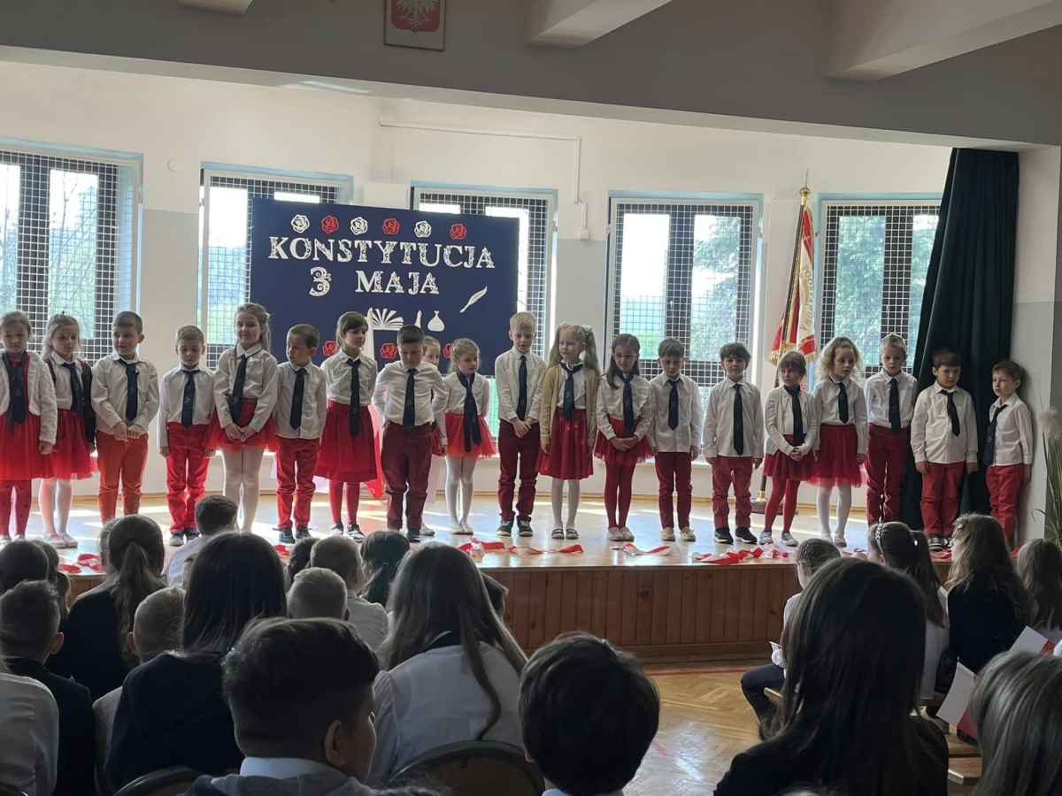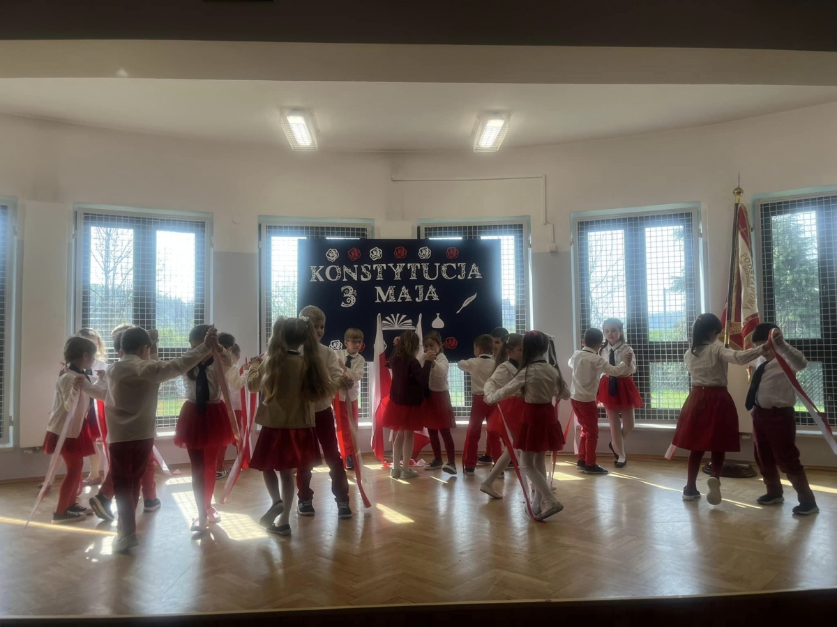W piątkowy poranek 28 kwietnia wszyscy uczniowie stawili się w szkole ubrani uroczyście, aby świętować rocznicę uchwalenia Konstytucji 3. Maja. Najpierw wystąpiły dzieci z oddziału przedszkolnego "Mądre Sówki" przybliżając zebranym historię tego święta.