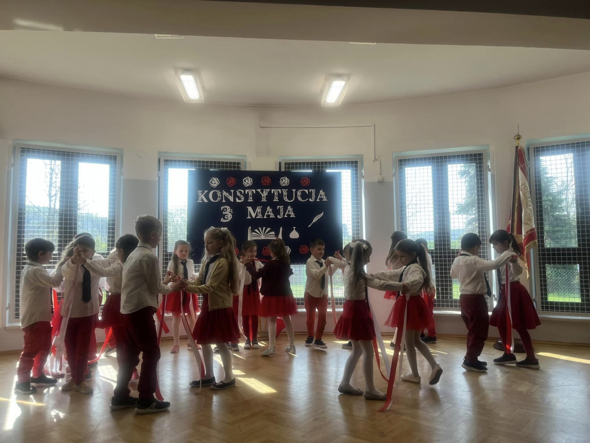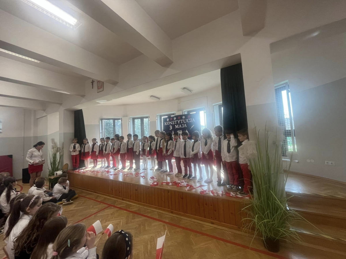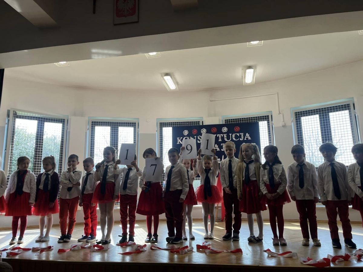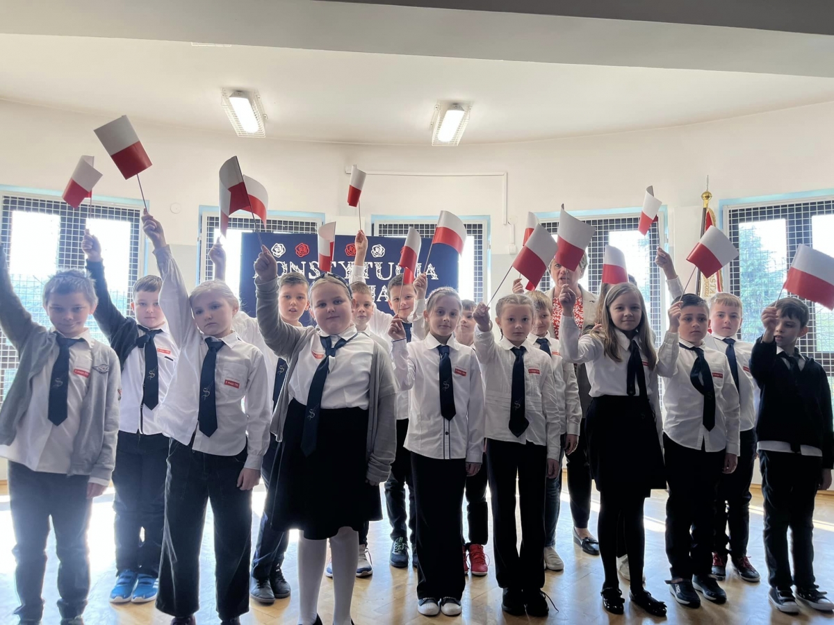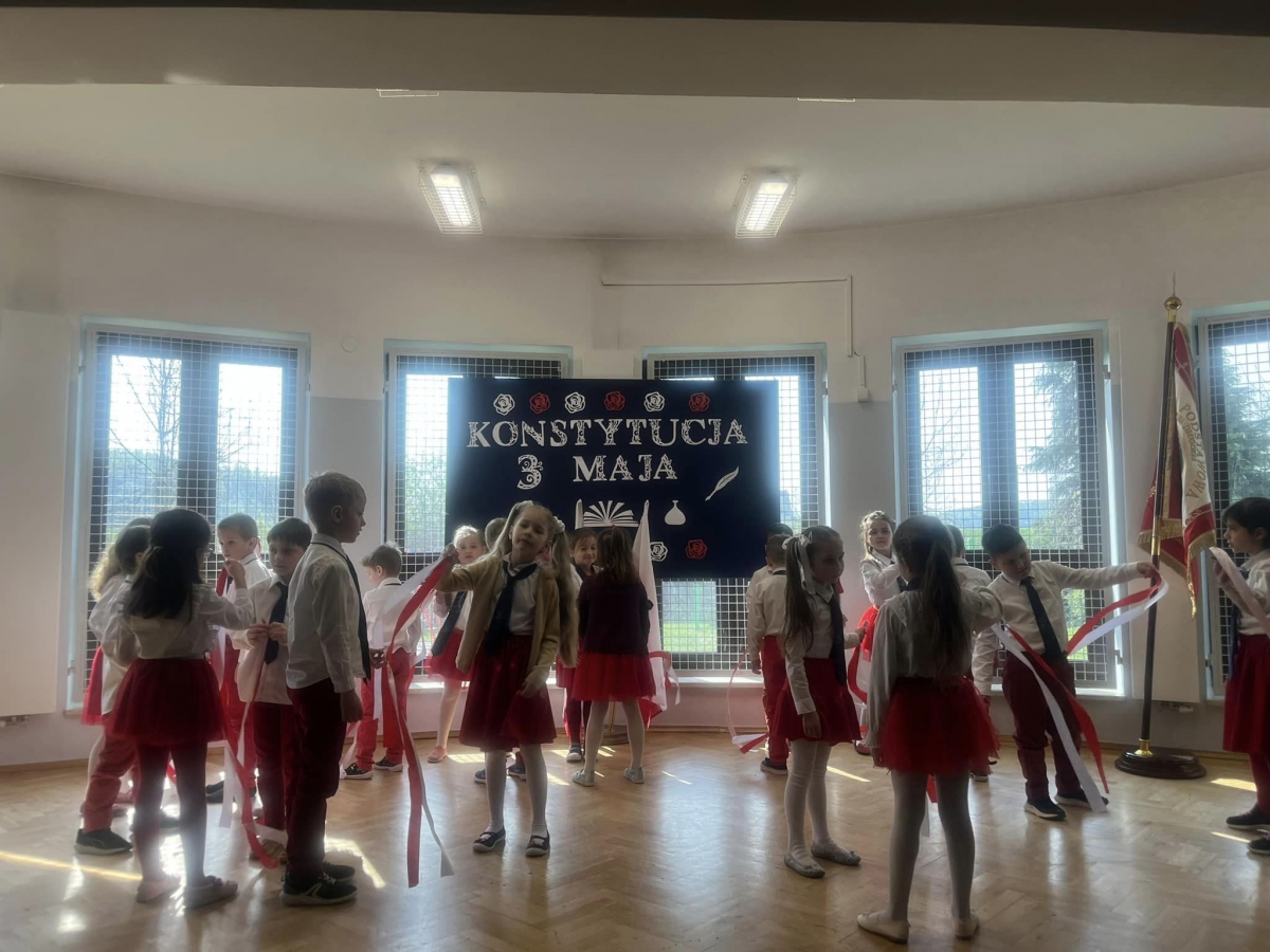 W piątkowy poranek 28 kwietnia wszyscy uczniowie stawili się w szkole ubrani uroczyście, aby świętować rocznicę uchwalenia Konstytucji 3. Maja. Najpierw wystąpiły dzieci z oddziału przedszkolnego "Mądre Sówki" przybliżając zebranym historię tego święta.