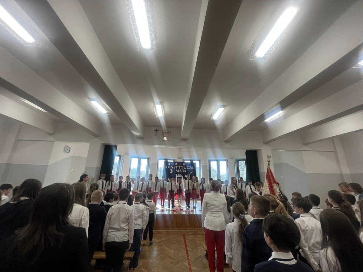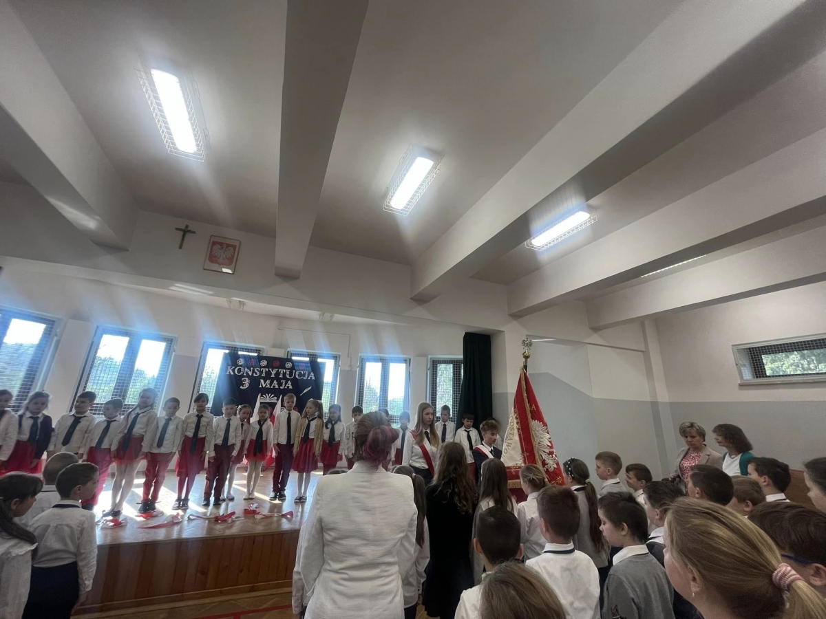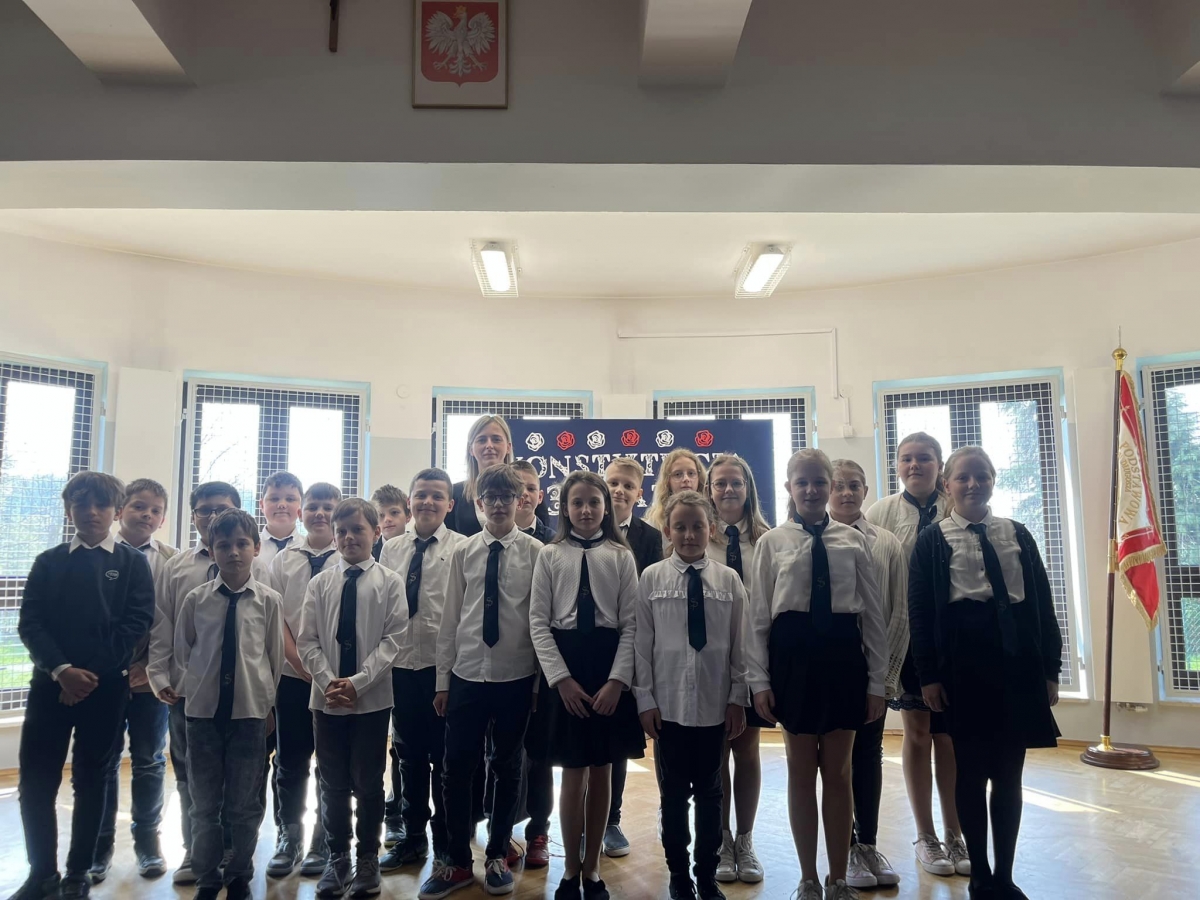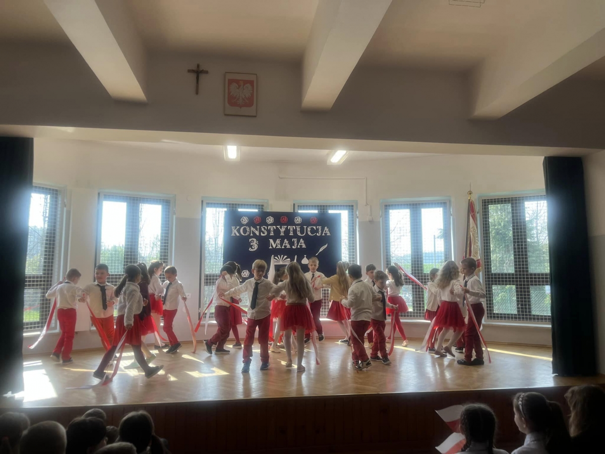 W piątkowy poranek 28 kwietnia wszyscy uczniowie stawili się w szkole ubrani uroczyście, aby świętować rocznicę uchwalenia Konstytucji 3. Maja. Najpierw wystąpiły dzieci z oddziału przedszkolnego "Mądre Sówki" przybliżając zebranym historię tego święta.