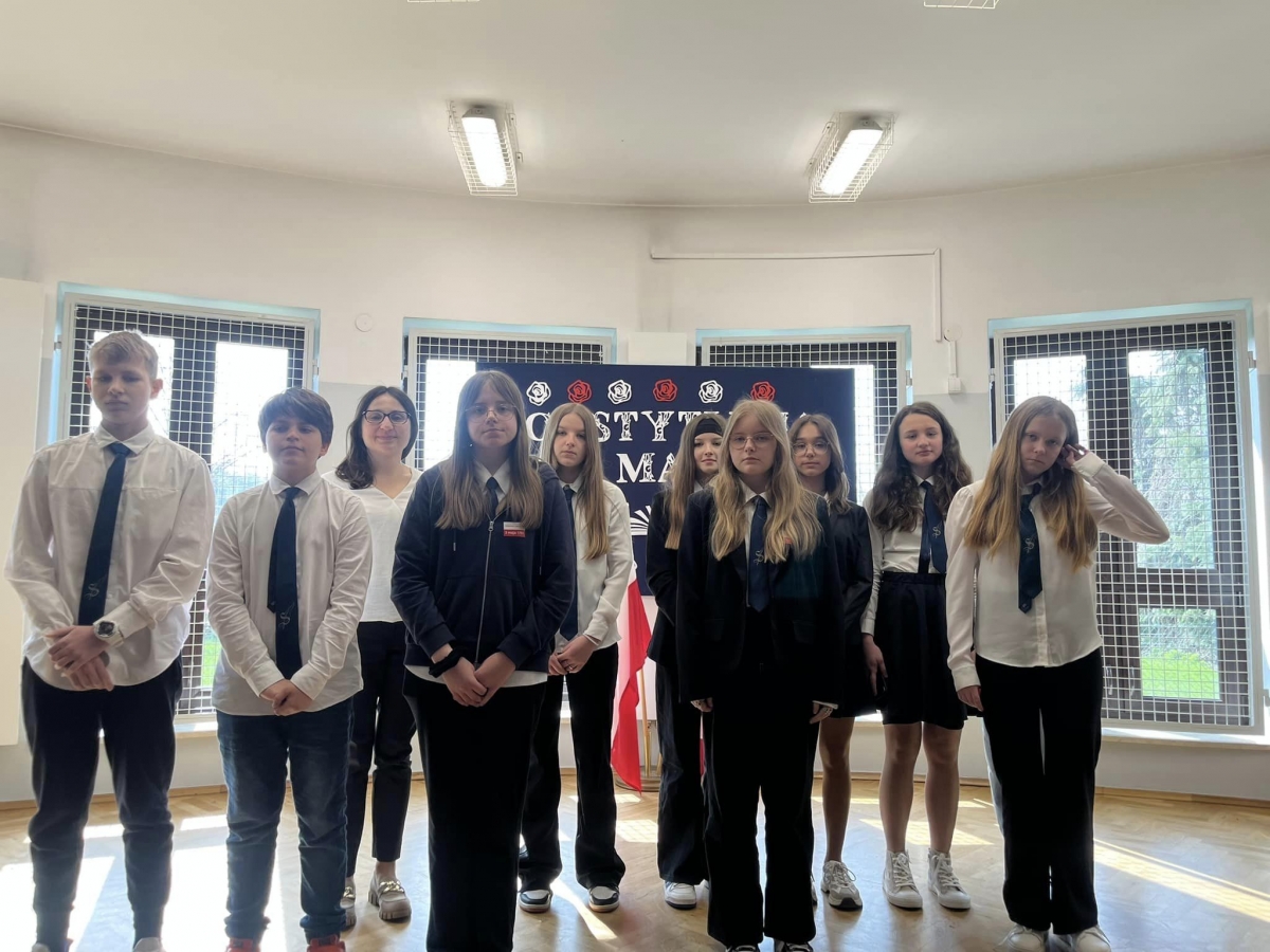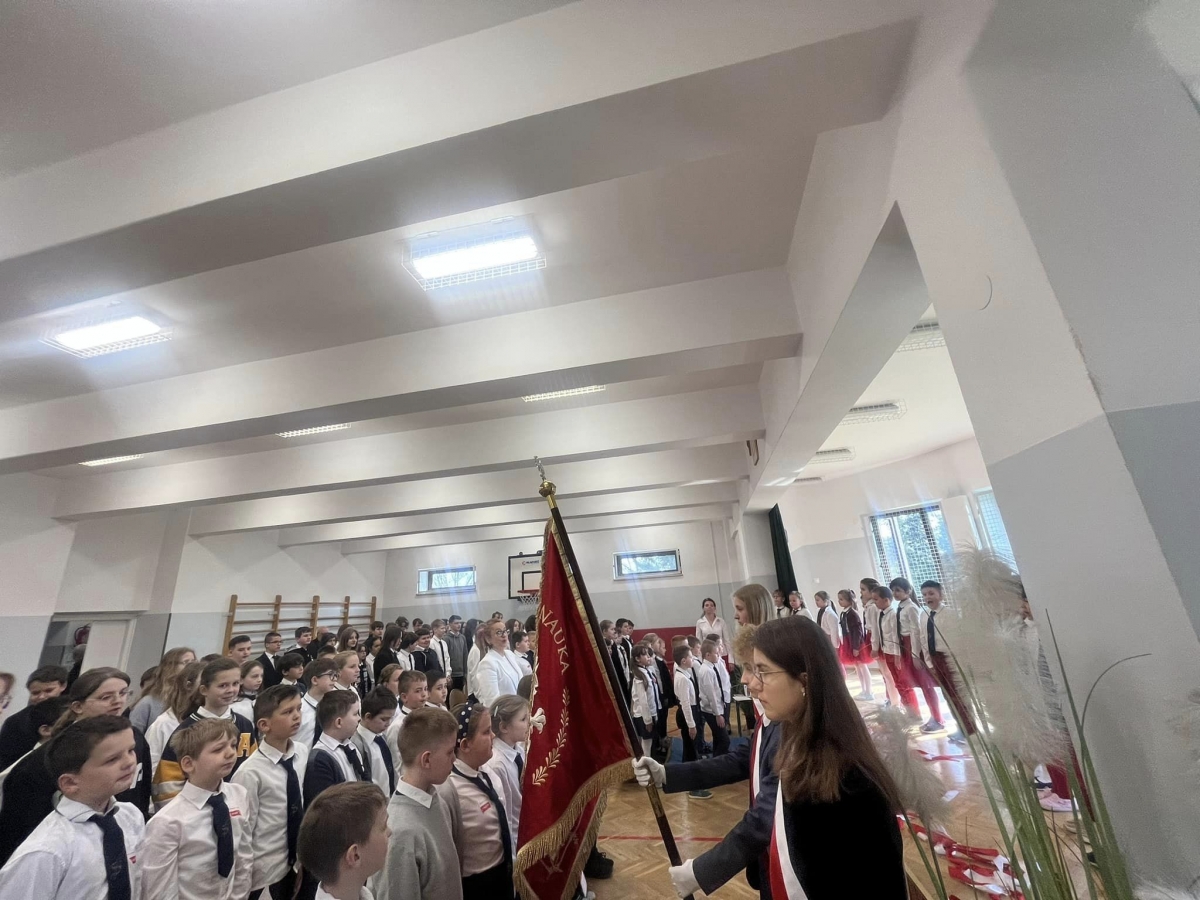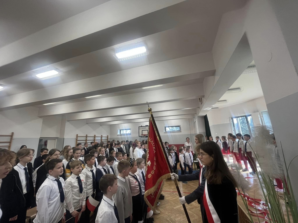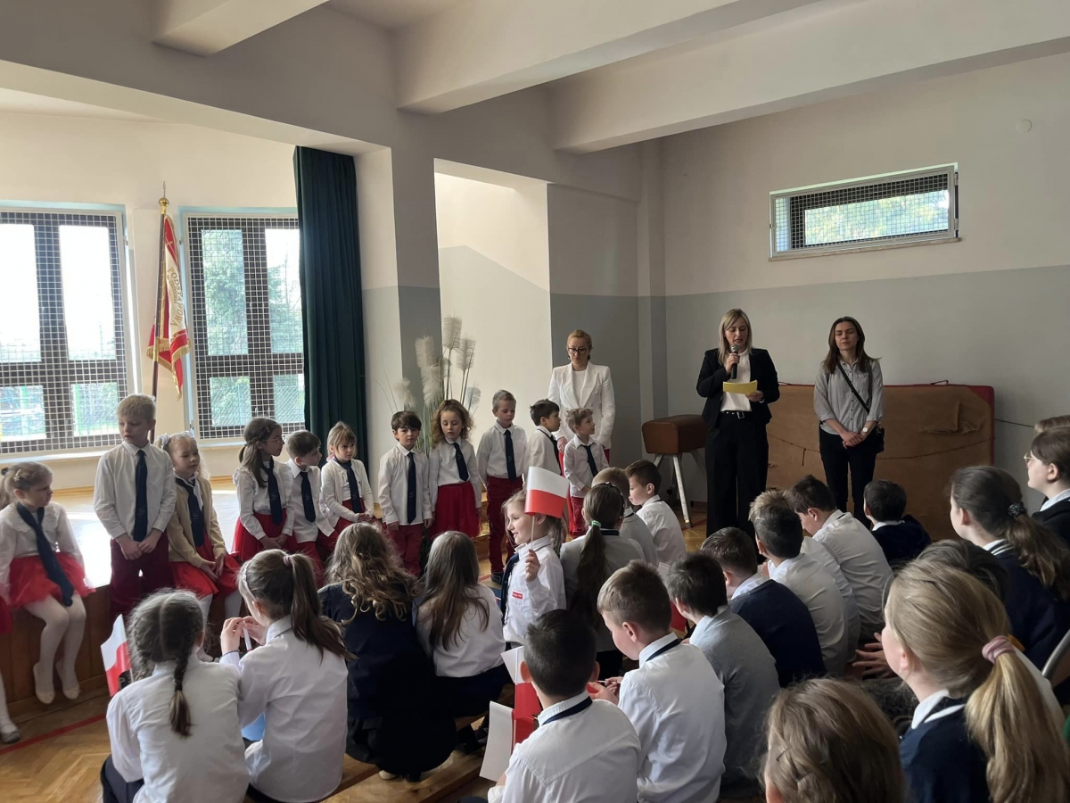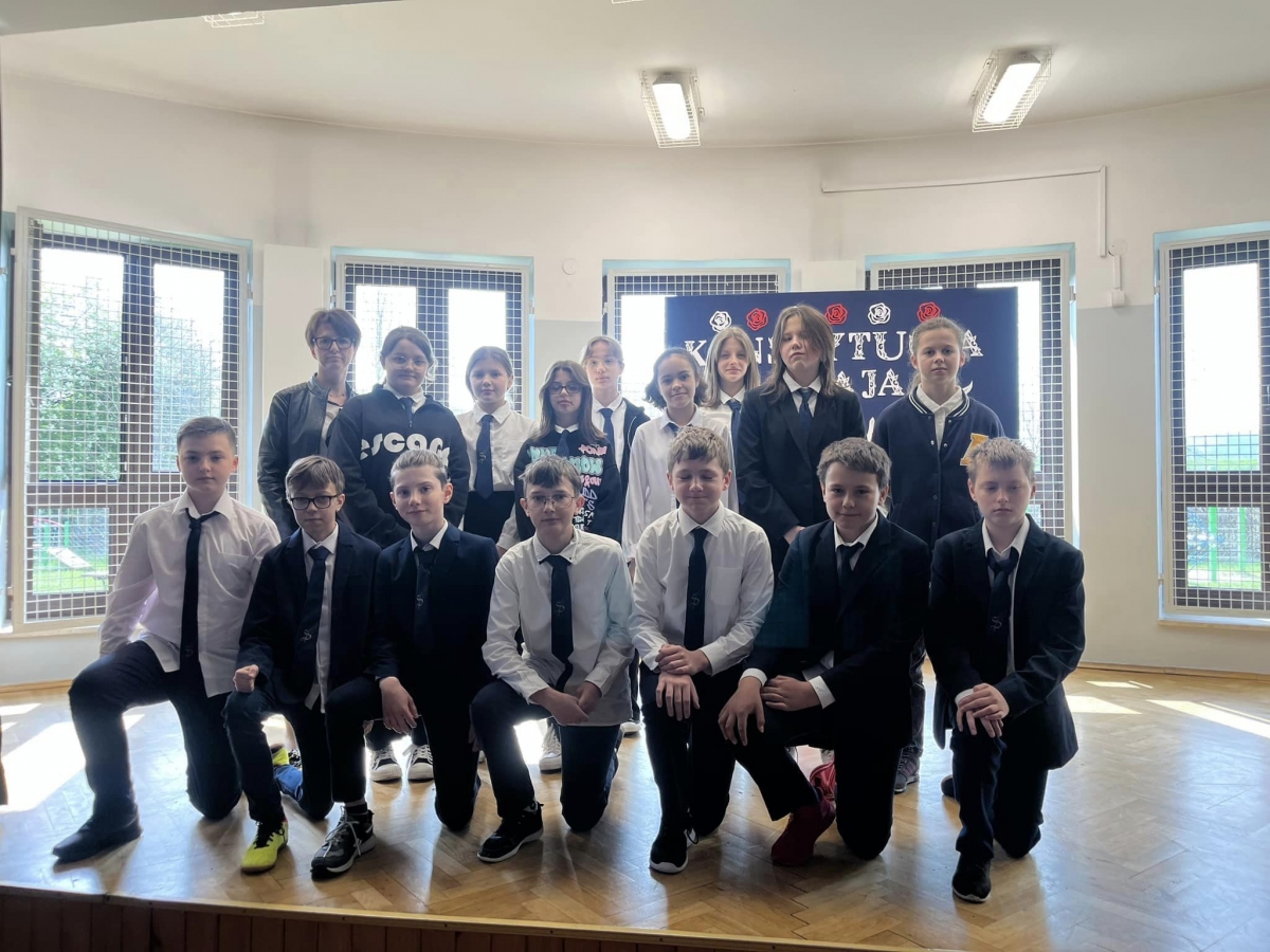 W piątkowy poranek 28 kwietnia wszyscy uczniowie stawili się w szkole ubrani uroczyście, aby świętować rocznicę uchwalenia Konstytucji 3. Maja. Najpierw wystąpiły dzieci z oddziału przedszkolnego "Mądre Sówki" przybliżając zebranym historię tego święta.
