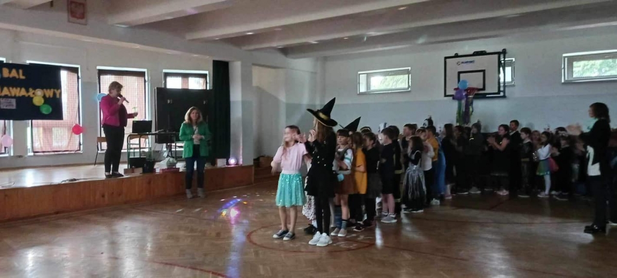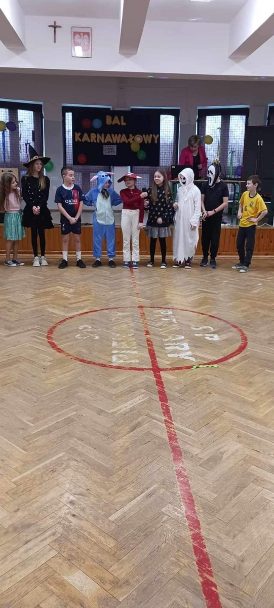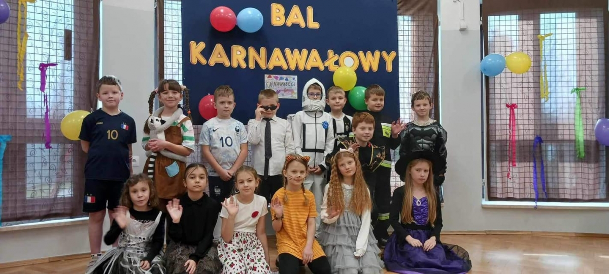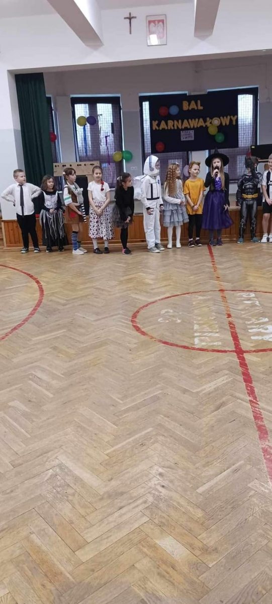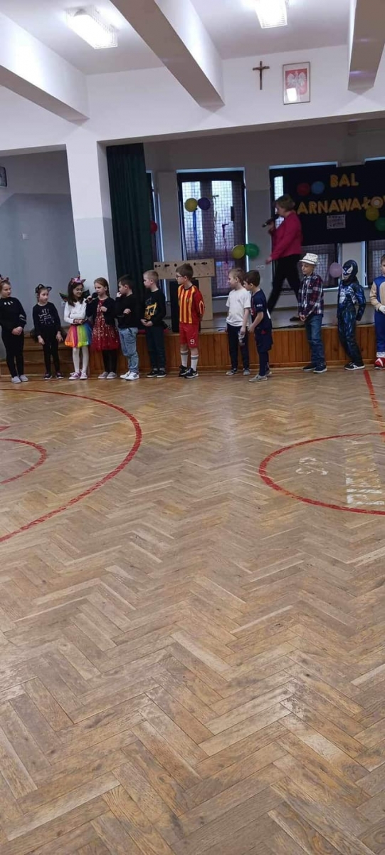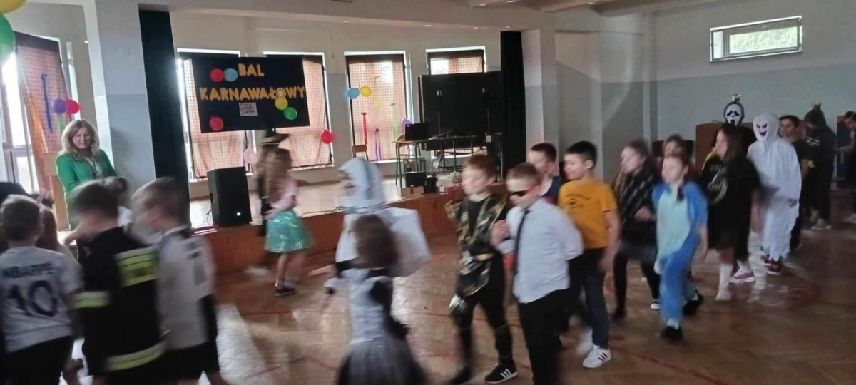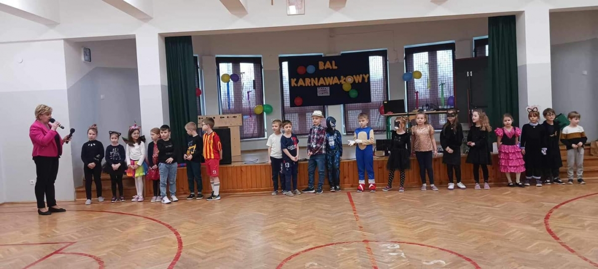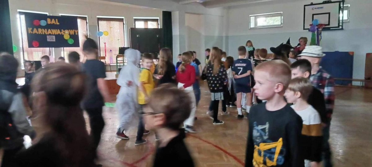 W naszej szkole odbył się bal karnawałowy dla uczniów klas 1-3. Był to dzień niecierpliwie oczekiwany. Sala gimnastyczna zmieniła się w balową. Wszyscy przy dźwiękach muzyki bawili się znakomicie. W czasie przerwy dzieci miały czas na poczęstunek. Czas zabawy szybko minął i pełni wrażeń uczniowie wrócili do swych domów.