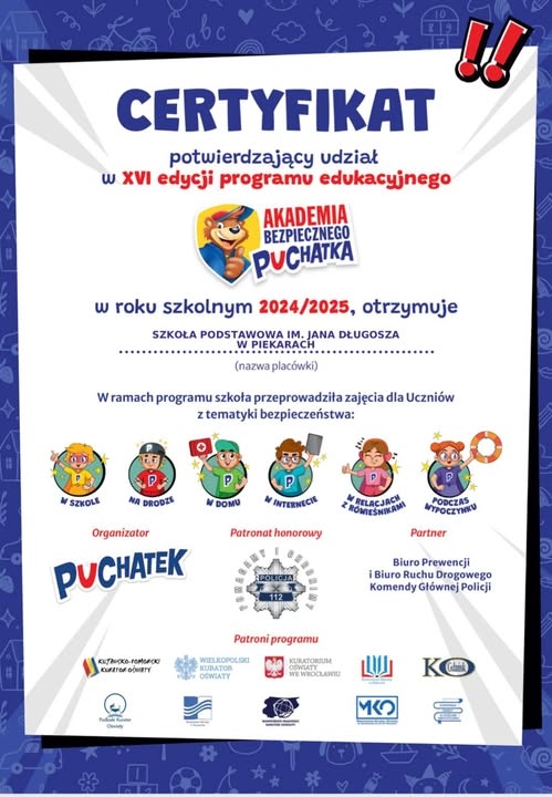 Certyfikat potwierdzający udział w XVI edycji programu edukacyjnego Akademia Bezpiecznego Puchatka!