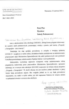 Na ręce Pani Dyrektor otrzymaliśmy certyfikat potwierdzający uczestnictwo naszych uczniów w lekcjach podnoszących wiedzę o prawie realizowanych przez Ministerstwo Sprawiedliwości pt. „Przygody z Paragrafem – nieco inaczej”.
