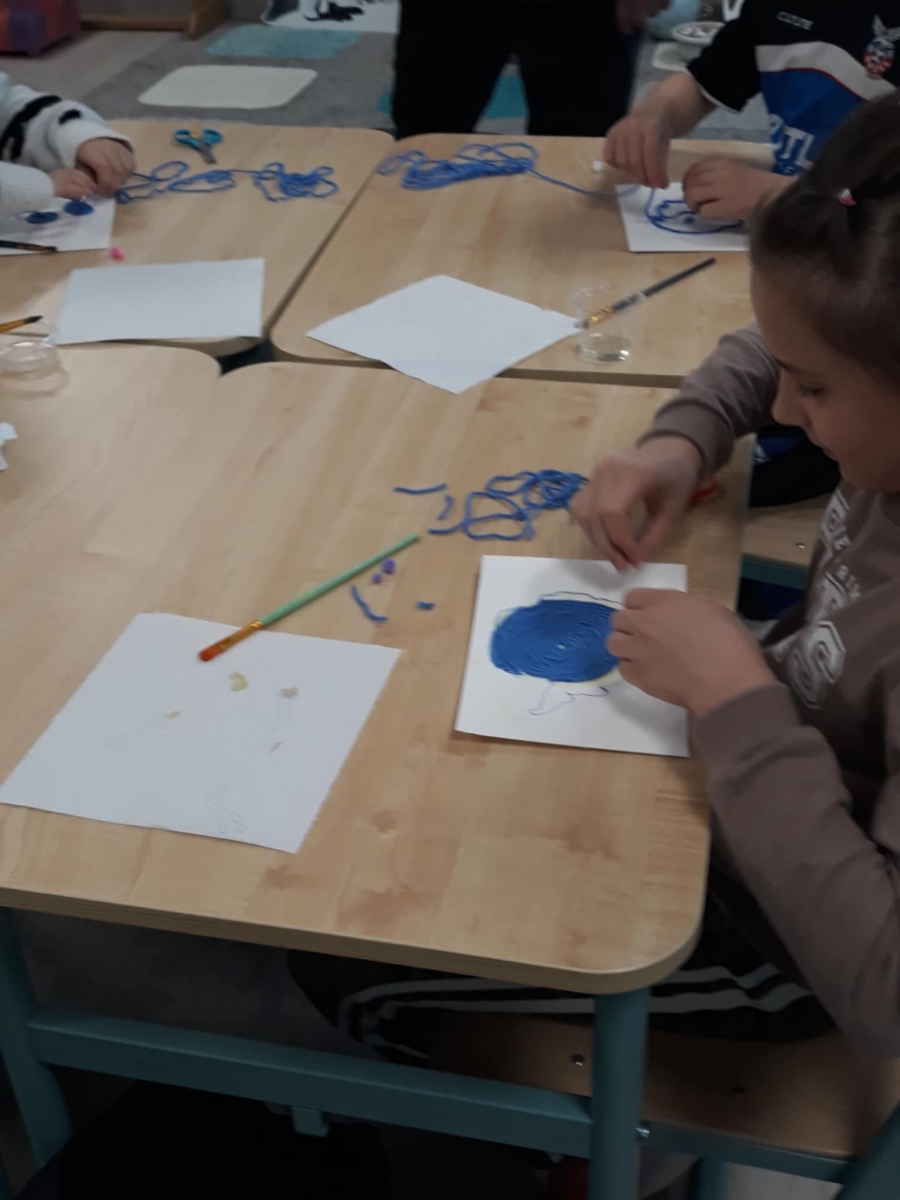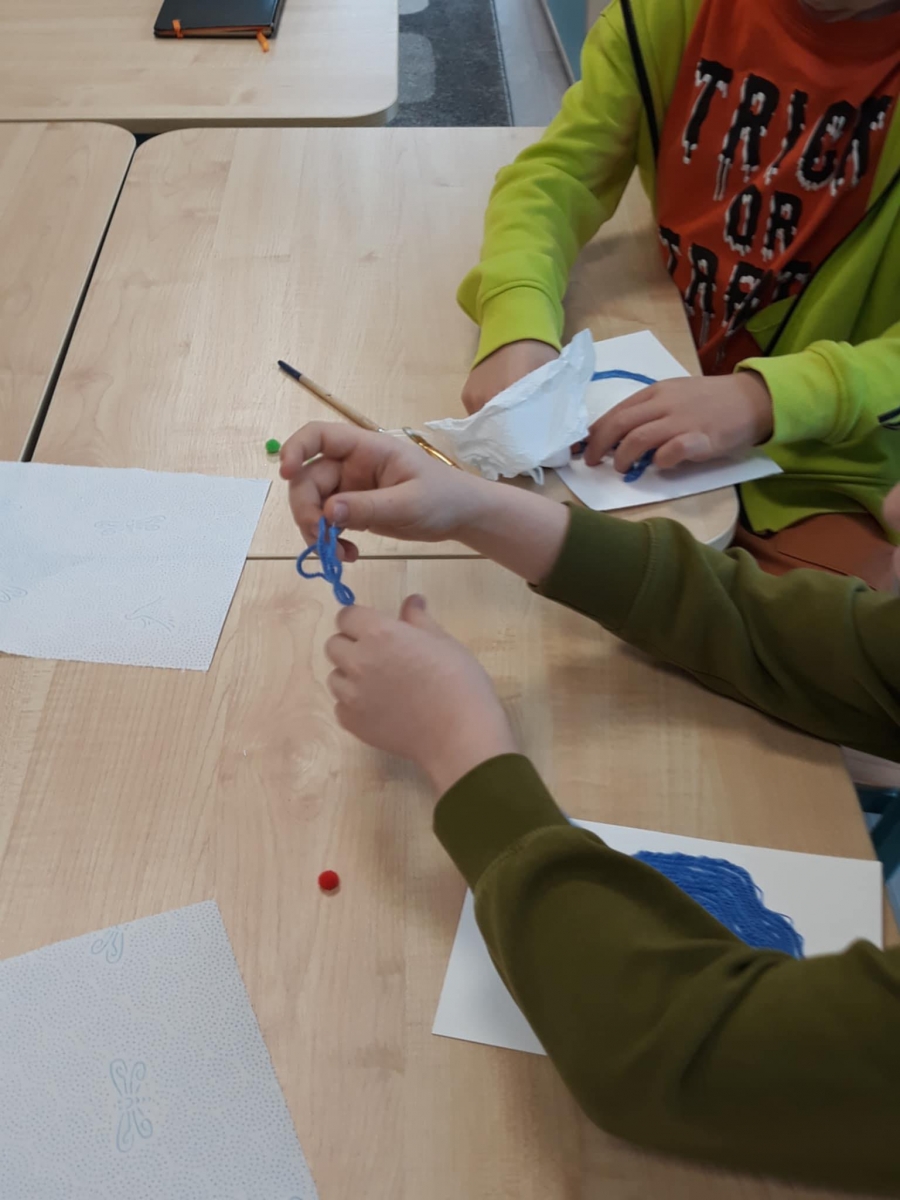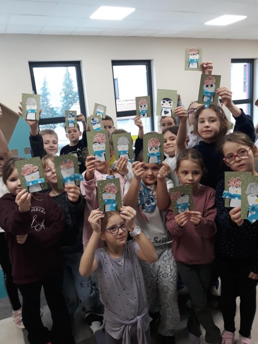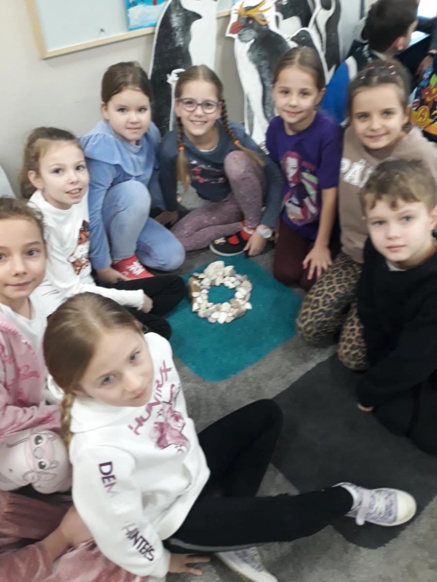 Poznaliśmy życie pingwinów, które były głównymi bohaterami książki oraz naszych zajęć. Dowiedzieliśmy się, jak wygląda Antarktyda, kto mieszka w bazach polarnych i czym zajmują się polarnicy. Dzieci mogły zobaczyć pingwiny na planszach w naturalnych rozmiarach, co było bardzo ciekawe. Szczególną uwagę poświęciliśmy pingwinom cesarskim, które są bardzo wytrwałe i rozmnażają się podczas mroźnej antarktycznej zimy. Następnie zamieniliśmy się w budowniczych i z kamieni budowaliśmy gniazda, tak jak robią to pingwiny Adeli. Na zakończenie warsztatów dzieci wykonały własną mapę Antarktydy, zaznaczając na niej polskie stacje polarne. Mapy powstały przy pomocy sznurka i były pięknym podsumowaniem zdobytej wiedzy.
