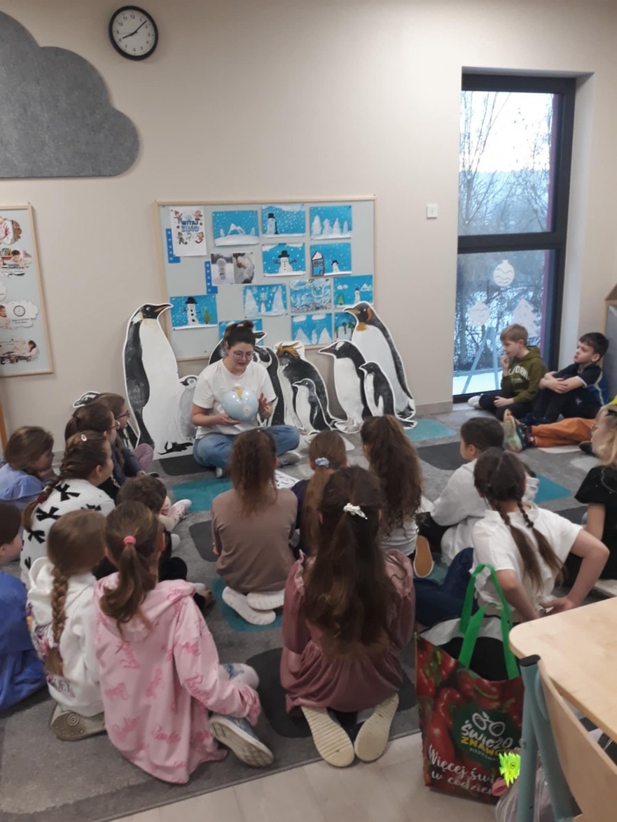 Podczas warsztatów przyrodniczych przenieśliśmy się na Biegun Południowy, do krainy lodu i śniegu, znanej nam z lektury „Zaczarowana zagroda”.