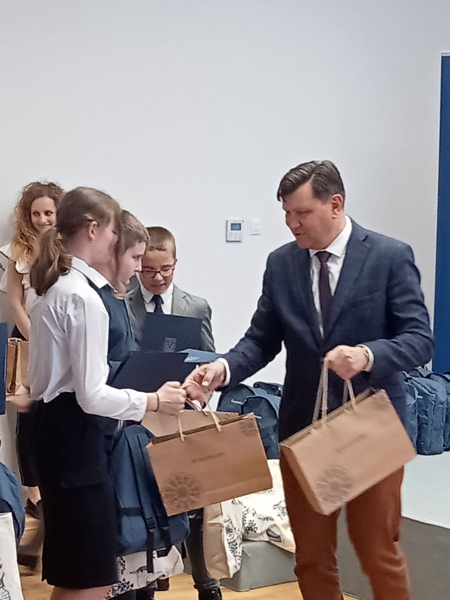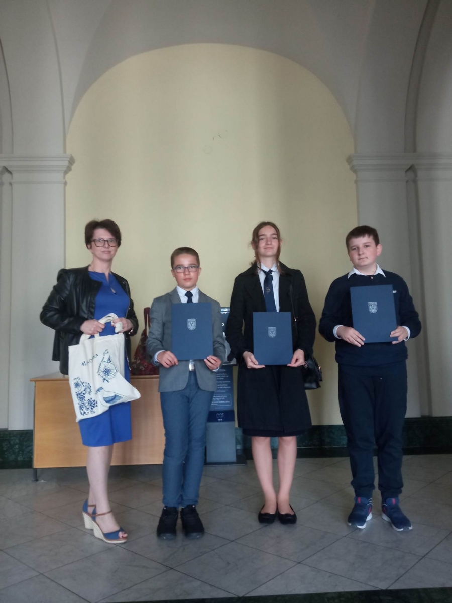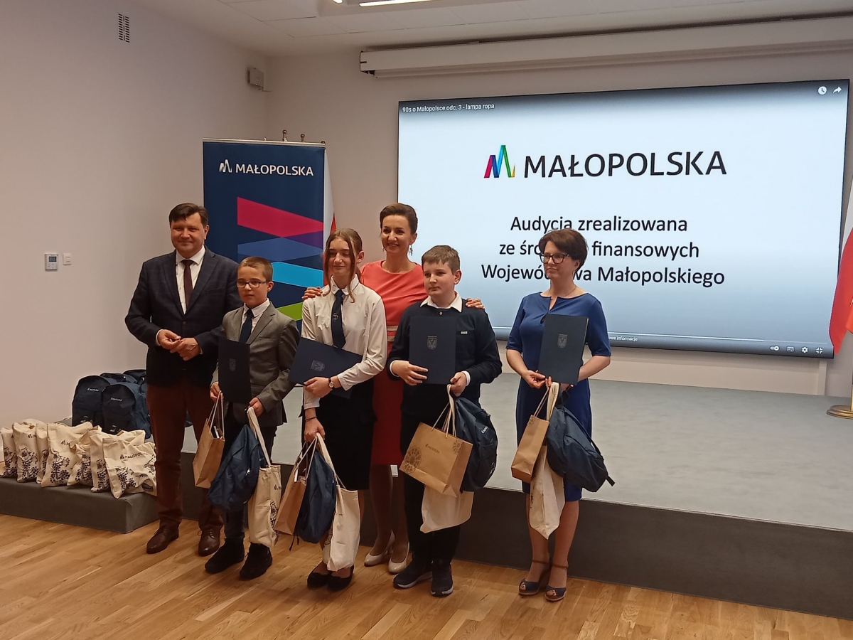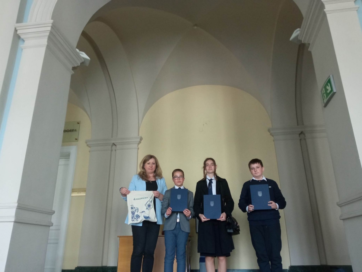 Laureaci konkursu wszechstronnej wiedzy „Co Ty wiesz o Regionie?” reprezentanci szkoły z klasy VII: Hubert Kańka, Tymon Kapusta i Zuzanna Knez uczestniczyli w piątek, 27 maja, w uroczystości wręczenia honorowych tytułów. Spotkanie miało miejsce w siedzibie Zarządu Województwa Małopolskiego.