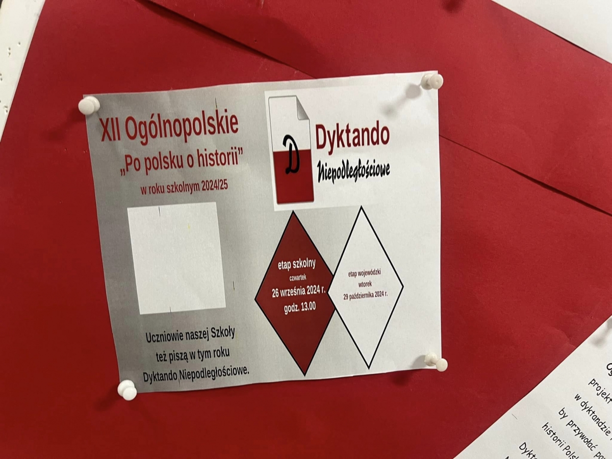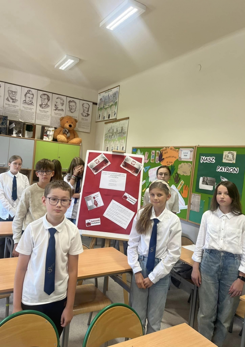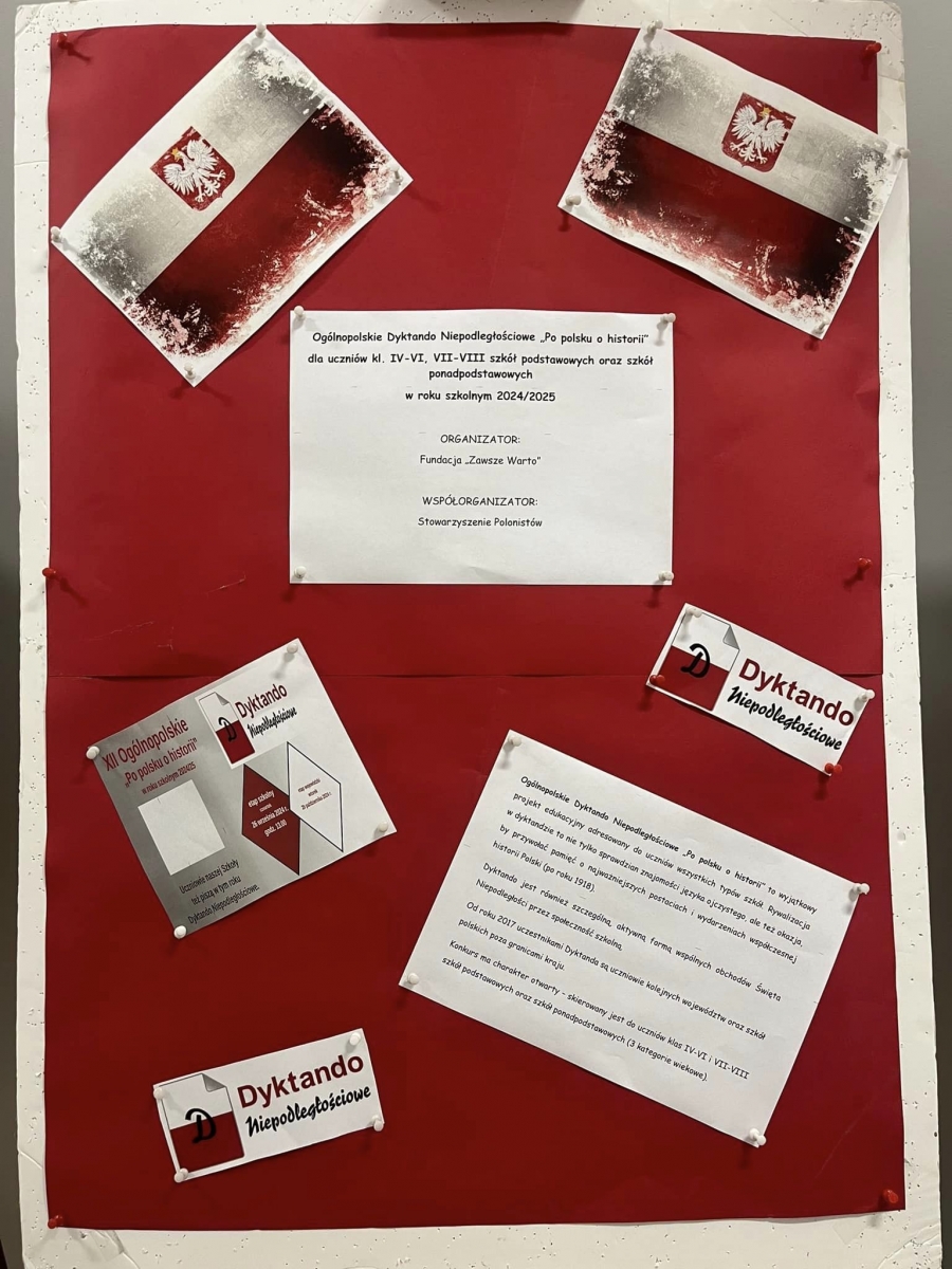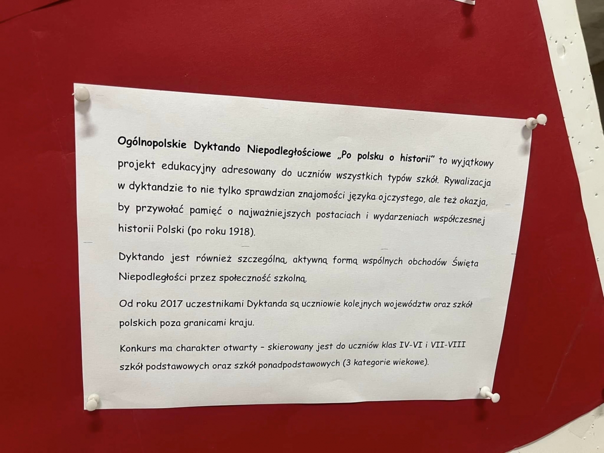 Nasza szkoła również przystąpiła do rywalizacji. Udział w dyktandzie to nie tylko sprawdzian znajomości zasad ortografii języka ojczystego, ale również okazja, by przywołać pamięć o ważnych postaciach i wydarzeniach współczesnej historii Polski (po roku 1918). Dyktando stanowi szczególną formę włączenia się do wspólnych obchodów Święta Niepodległości.