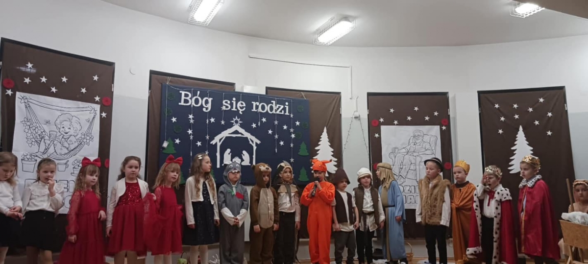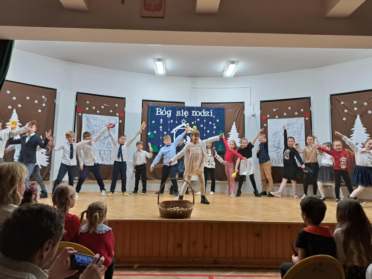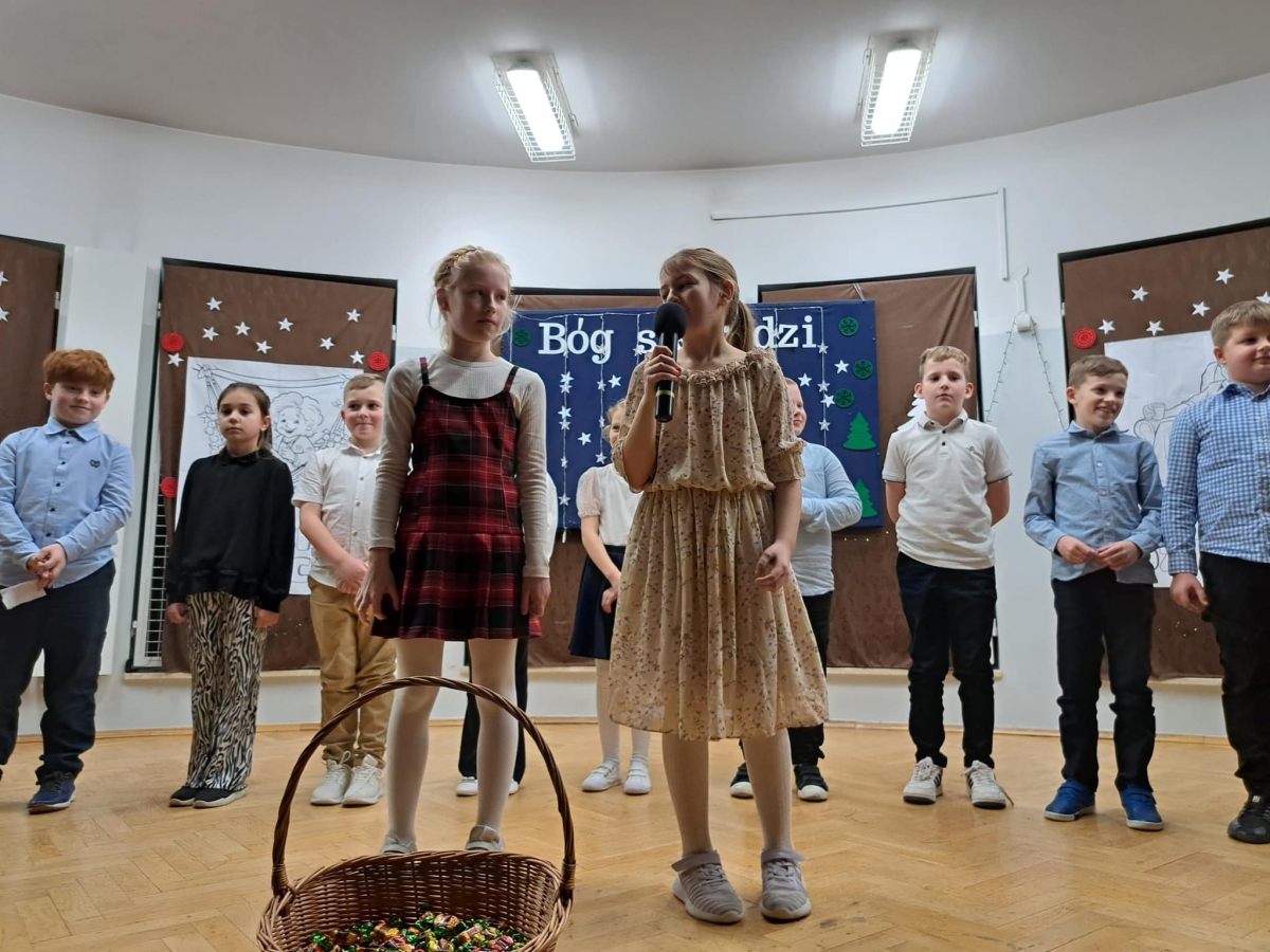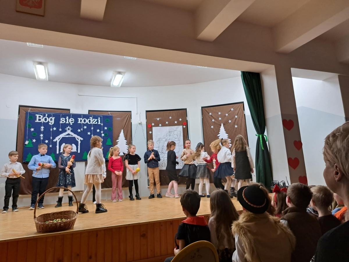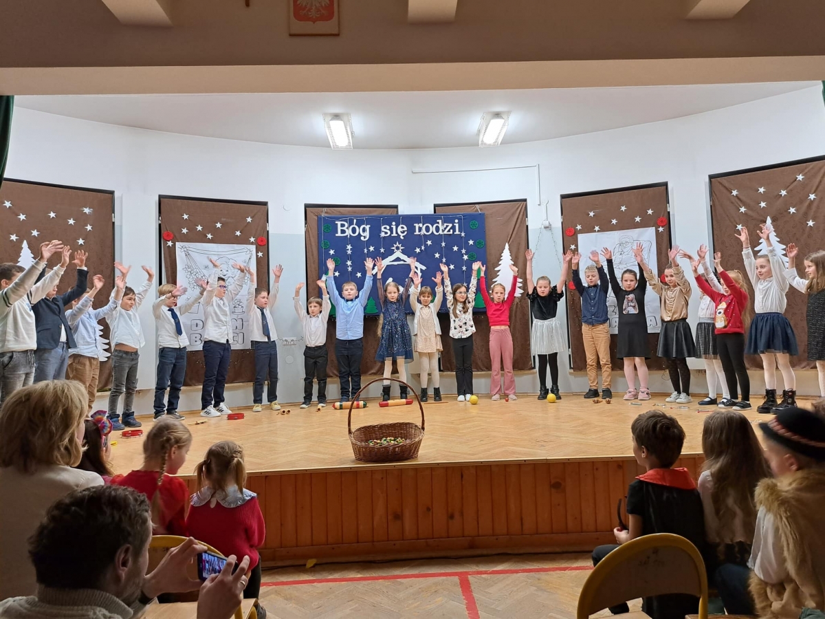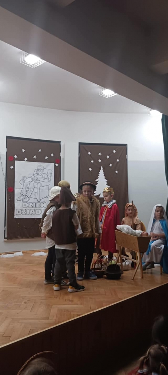 Dnia 17 stycznia nadszedł czas spotkania. O godzinie 17.15, po krótkim przywitaniu zgromadzonych w auli gości, scena została oddana uczniom. Główną atrakcją wieczoru było przedstawienie jasełkowe w wykonaniu dzieci z oddziału przedszkolnego ,,Mądre Sówki”. W dalszej kolejności wystąpili uczniowie z klas I-III, prezentując wiersze i piosenki. Życzenia płynące prosto z serc wnuków ogrzały na pewno Babcie i Dziadków w ten zimowy dzień. Spotkanie urozmaicił występ szkolnego zespołu tanecznego ,,Małe Gwiazdki” prowadzony przez panią Elżbietę Nęcką. Oczywiście spotkanie nie mogło się odbyć bez wspólnego kolędowania oraz zaśpiewania przez wszystkie dzieci tradycyjnej polskiej piosenki ,,Sto lat”.