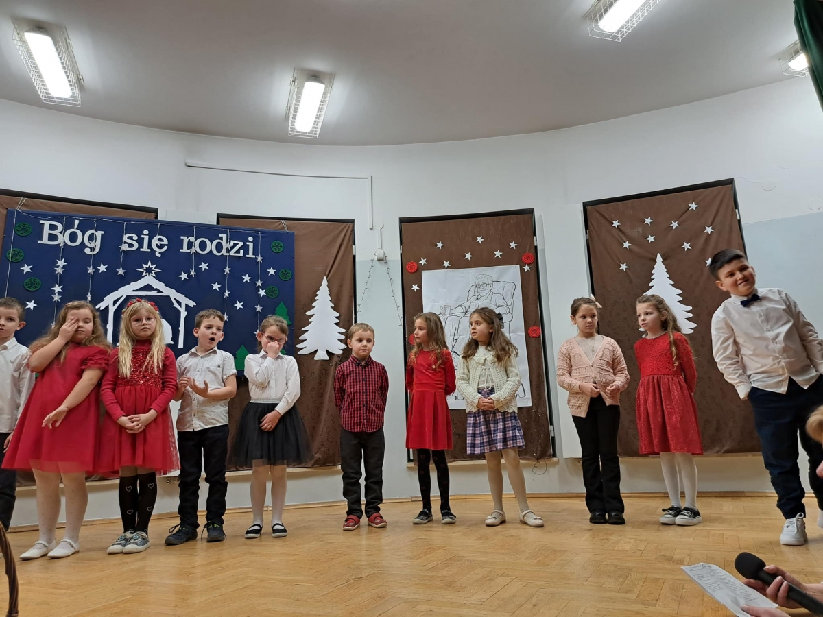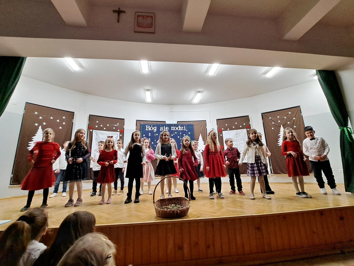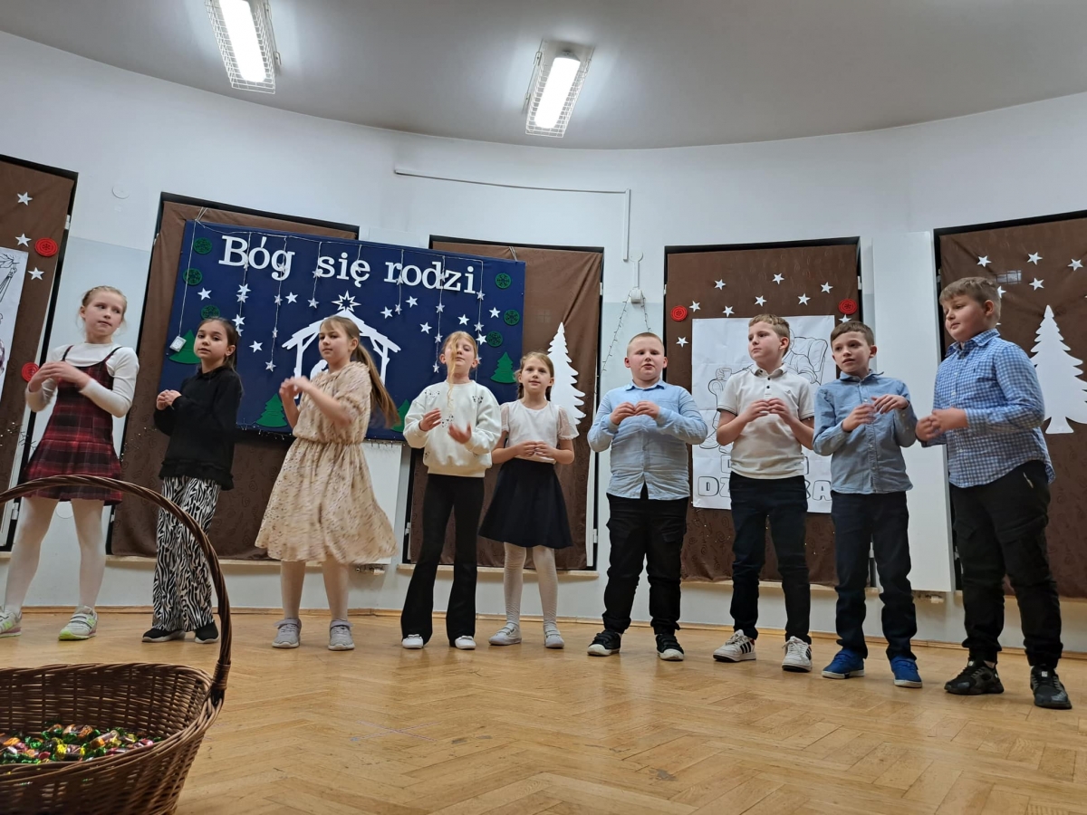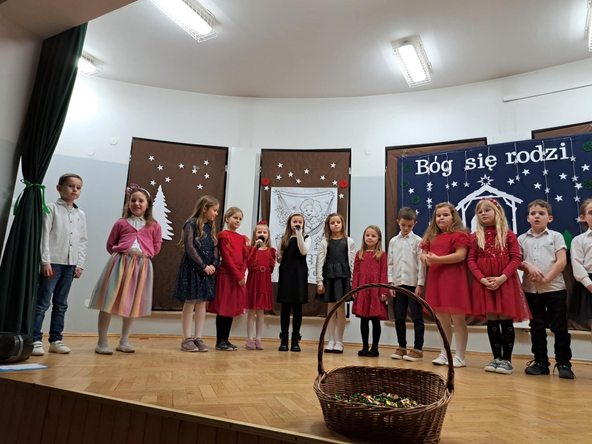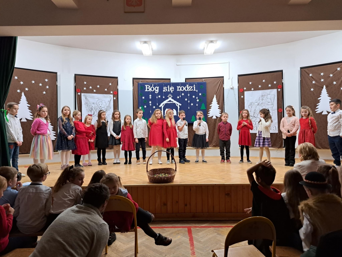 Dnia 17 stycznia nadszedł czas spotkania. O godzinie 17.15, po krótkim przywitaniu zgromadzonych w auli gości, scena została oddana uczniom. Główną atrakcją wieczoru było przedstawienie jasełkowe w wykonaniu dzieci z oddziału przedszkolnego ,,Mądre Sówki”. W dalszej kolejności wystąpili uczniowie z klas I-III, prezentując wiersze i piosenki. Życzenia płynące prosto z serc wnuków ogrzały na pewno Babcie i Dziadków w ten zimowy dzień. Spotkanie urozmaicił występ szkolnego zespołu tanecznego ,,Małe Gwiazdki” prowadzony przez panią Elżbietę Nęcką. Oczywiście spotkanie nie mogło się odbyć bez wspólnego kolędowania oraz zaśpiewania przez wszystkie dzieci tradycyjnej polskiej piosenki ,,Sto lat”.