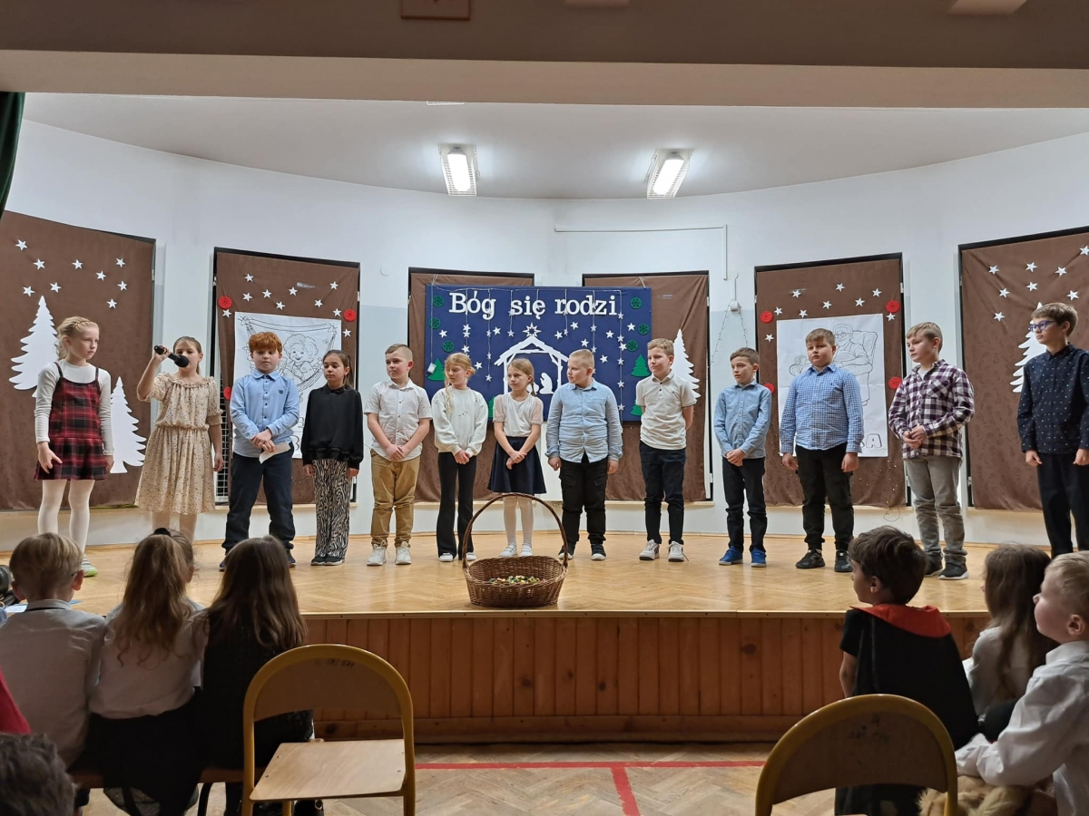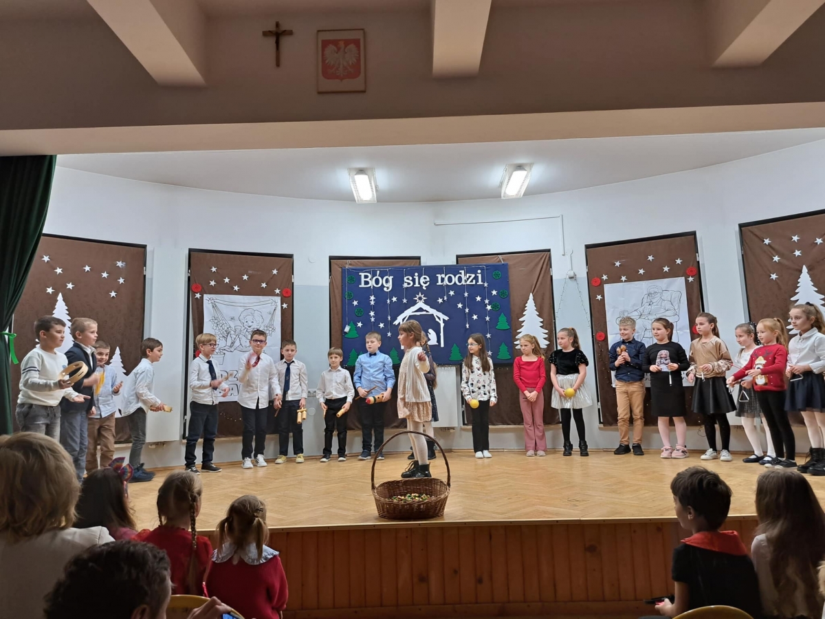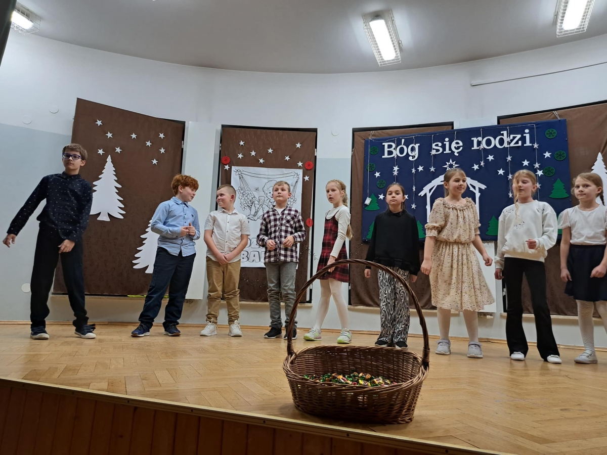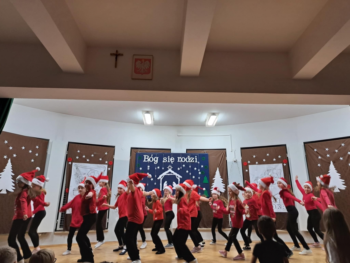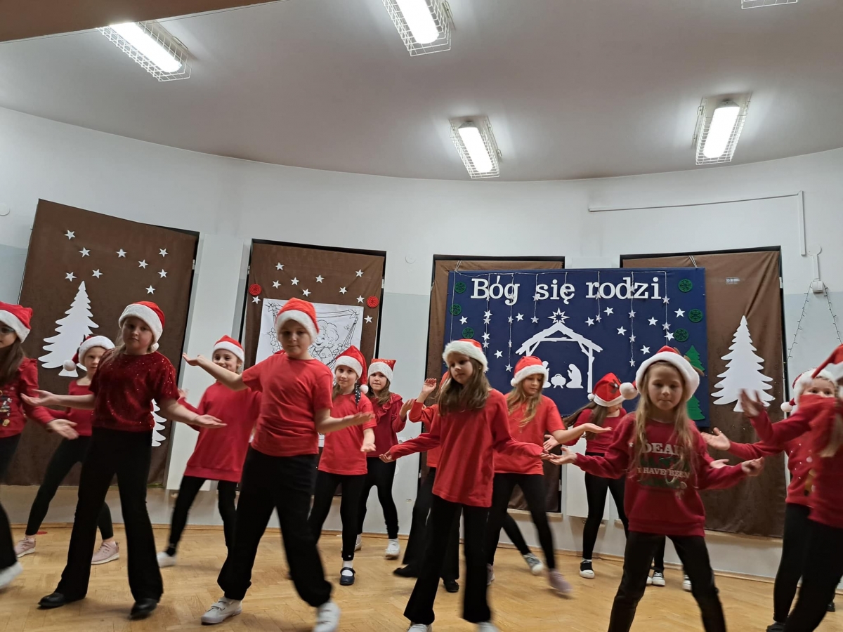 Dnia 17 stycznia nadszedł czas spotkania. O godzinie 17.15, po krótkim przywitaniu zgromadzonych w auli gości, scena została oddana uczniom. Główną atrakcją wieczoru było przedstawienie jasełkowe w wykonaniu dzieci z oddziału przedszkolnego ,,Mądre Sówki”. W dalszej kolejności wystąpili uczniowie z klas I-III, prezentując wiersze i piosenki. Życzenia płynące prosto z serc wnuków ogrzały na pewno Babcie i Dziadków w ten zimowy dzień. Spotkanie urozmaicił występ szkolnego zespołu tanecznego ,,Małe Gwiazdki” prowadzony przez panią Elżbietę Nęcką. Oczywiście spotkanie nie mogło się odbyć bez wspólnego kolędowania oraz zaśpiewania przez wszystkie dzieci tradycyjnej polskiej piosenki ,,Sto lat”.