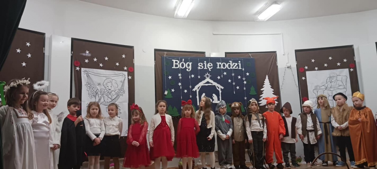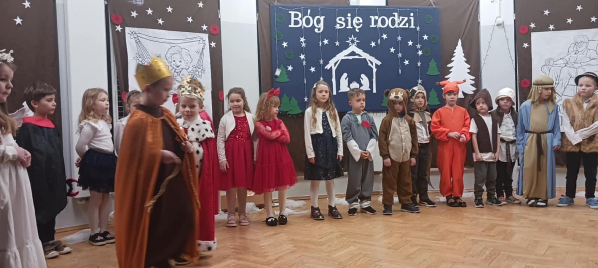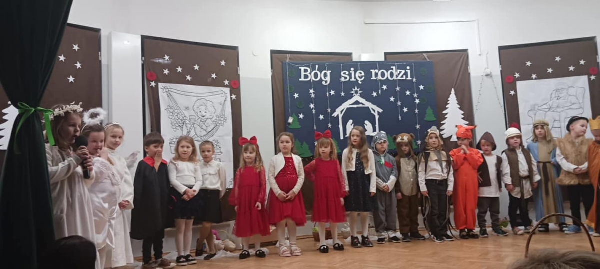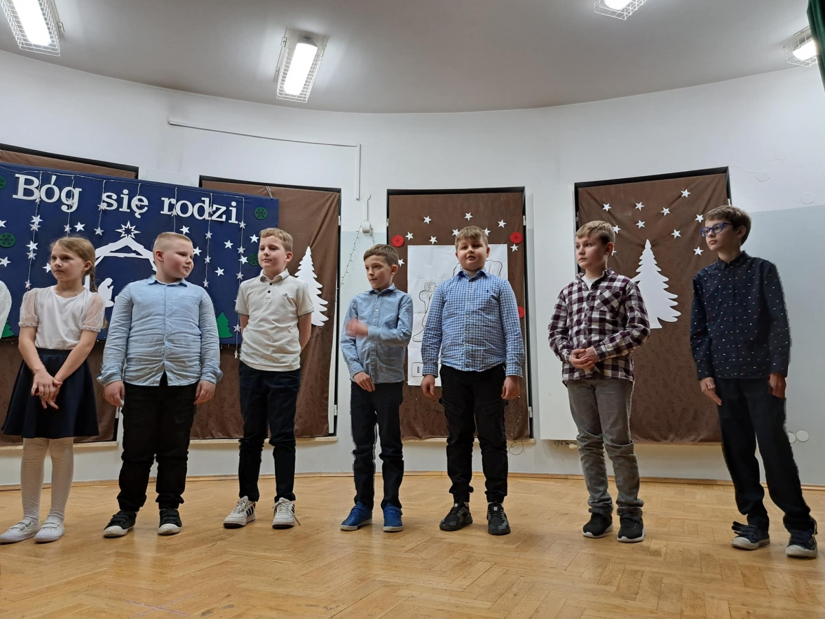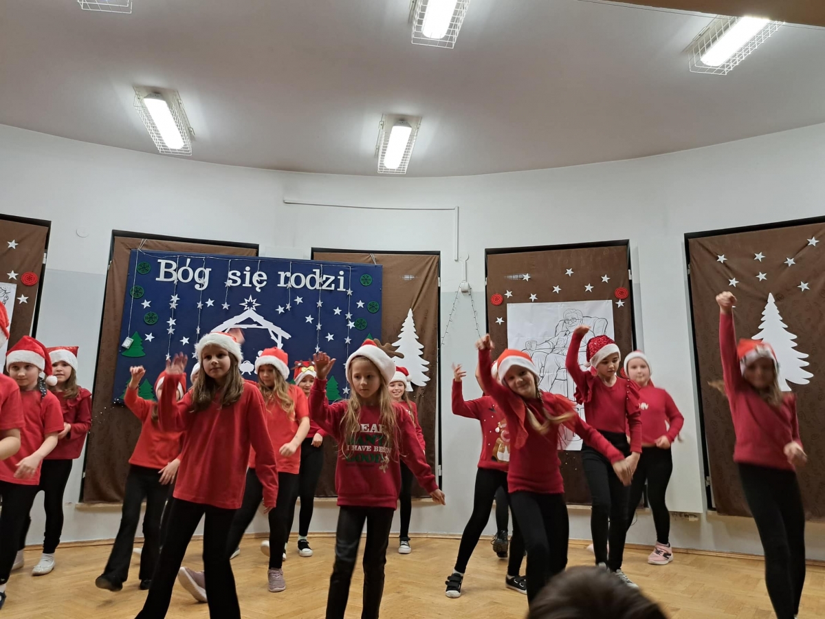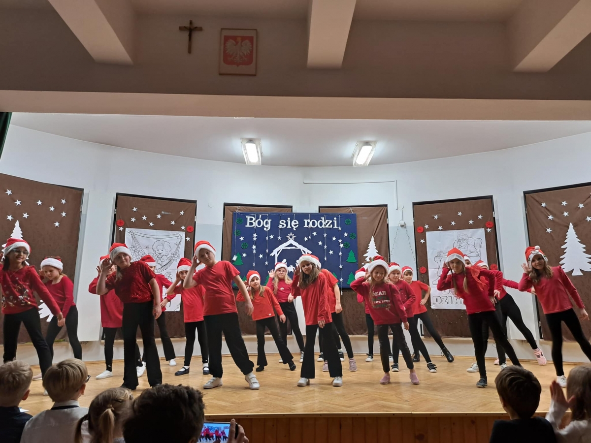 Dnia 17 stycznia nadszedł czas spotkania. O godzinie 17.15, po krótkim przywitaniu zgromadzonych w auli gości, scena została oddana uczniom. Główną atrakcją wieczoru było przedstawienie jasełkowe w wykonaniu dzieci z oddziału przedszkolnego ,,Mądre Sówki”. W dalszej kolejności wystąpili uczniowie z klas I-III, prezentując wiersze i piosenki. Życzenia płynące prosto z serc wnuków ogrzały na pewno Babcie i Dziadków w ten zimowy dzień. Spotkanie urozmaicił występ szkolnego zespołu tanecznego ,,Małe Gwiazdki” prowadzony przez panią Elżbietę Nęcką. Oczywiście spotkanie nie mogło się odbyć bez wspólnego kolędowania oraz zaśpiewania przez wszystkie dzieci tradycyjnej polskiej piosenki ,,Sto lat”.