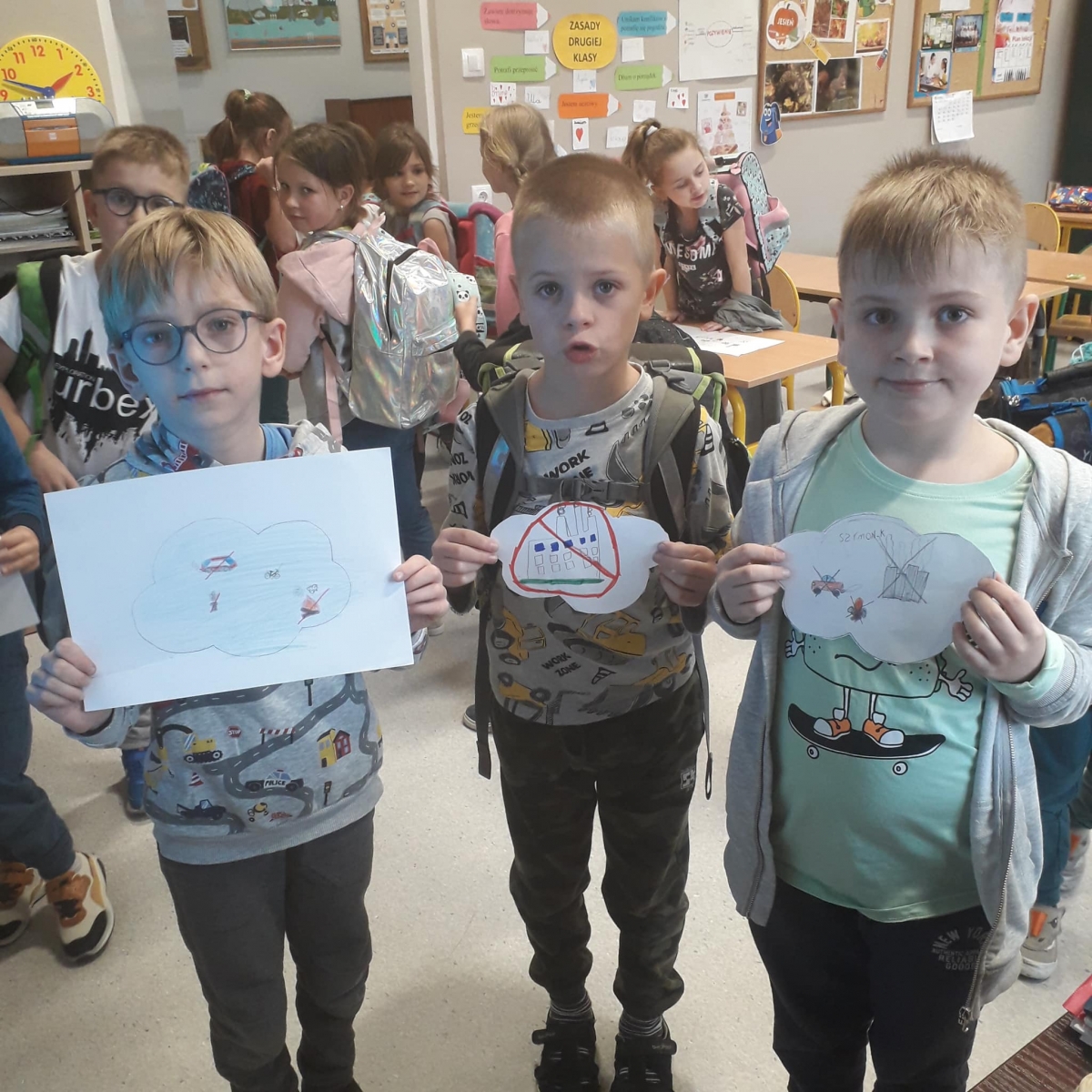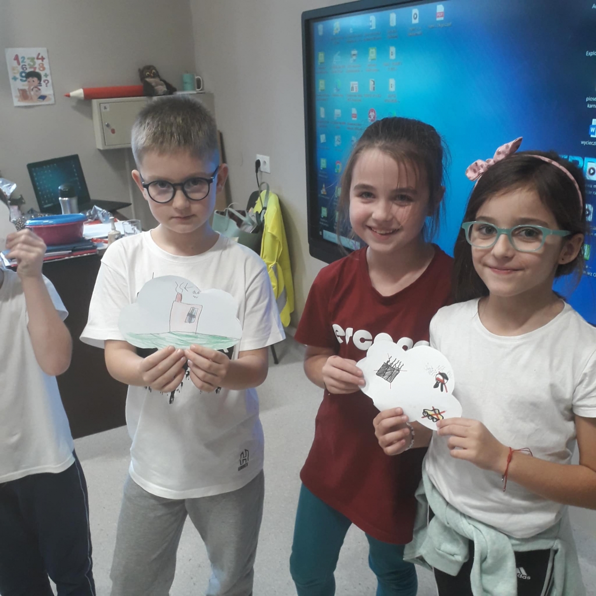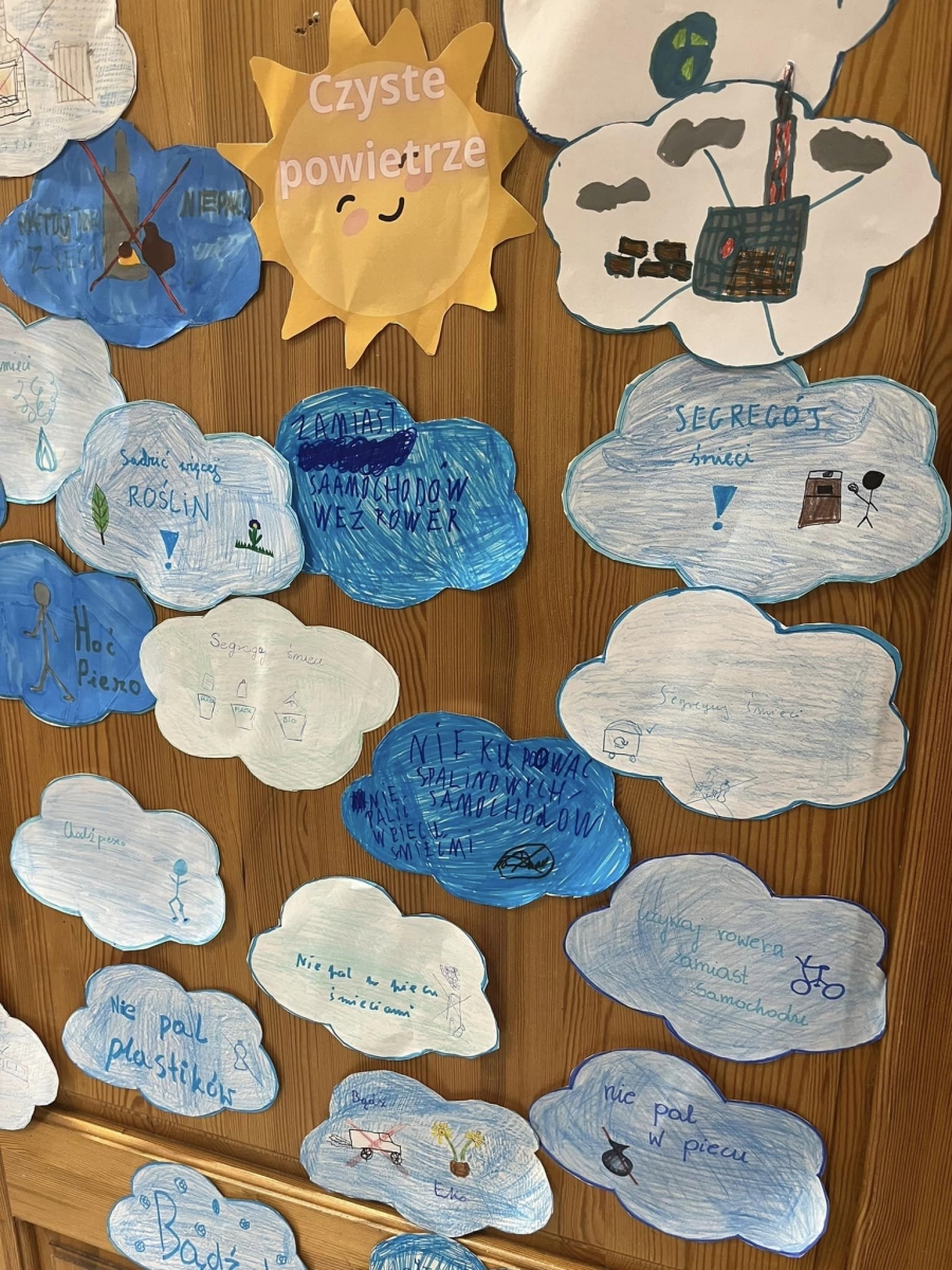 Na podsumowanie zajęć uczniowie na niebieskich chmurkach wypisywali lub rysowali swoje pomysły na to, w jaki sposób można zadbać o czyste powietrze. Wykonaną w ten sposób dekorację uczniowie powiesili na drzwiach swoich klas.
