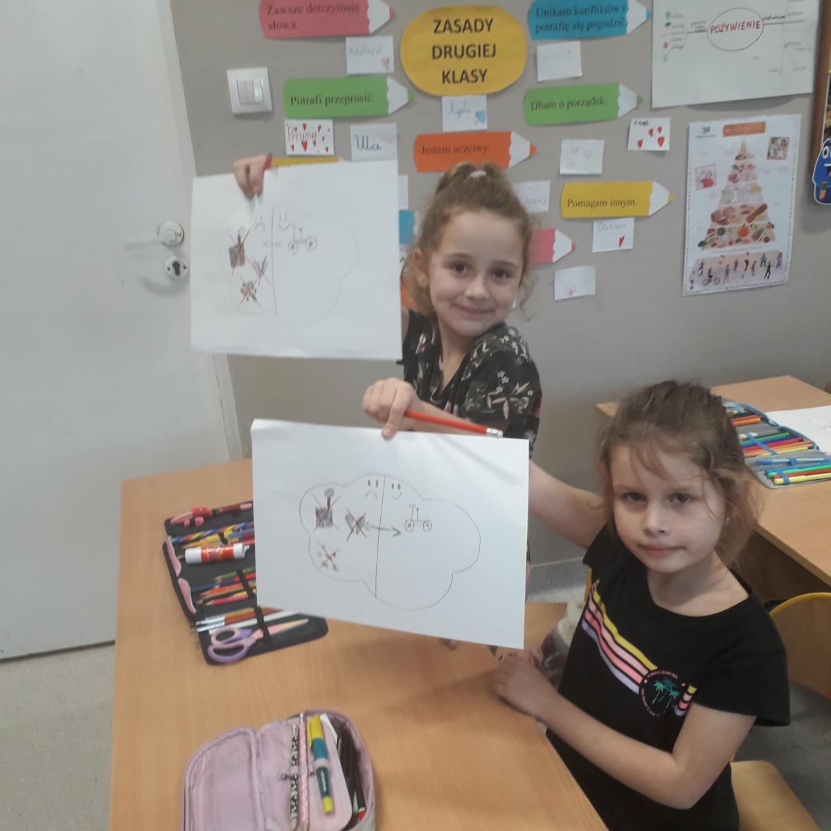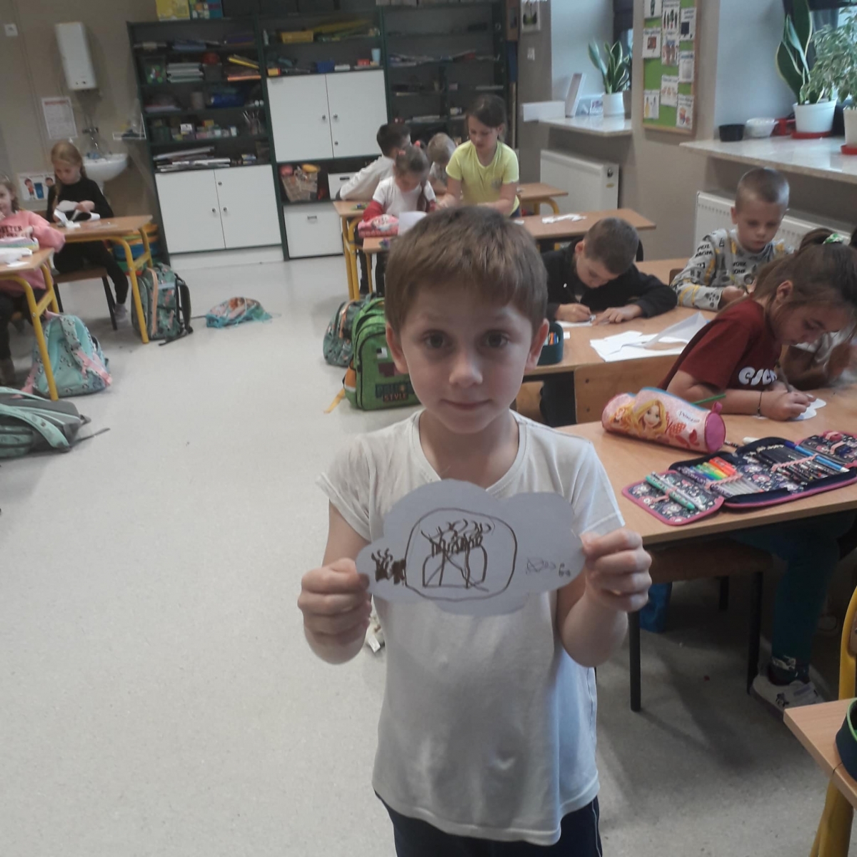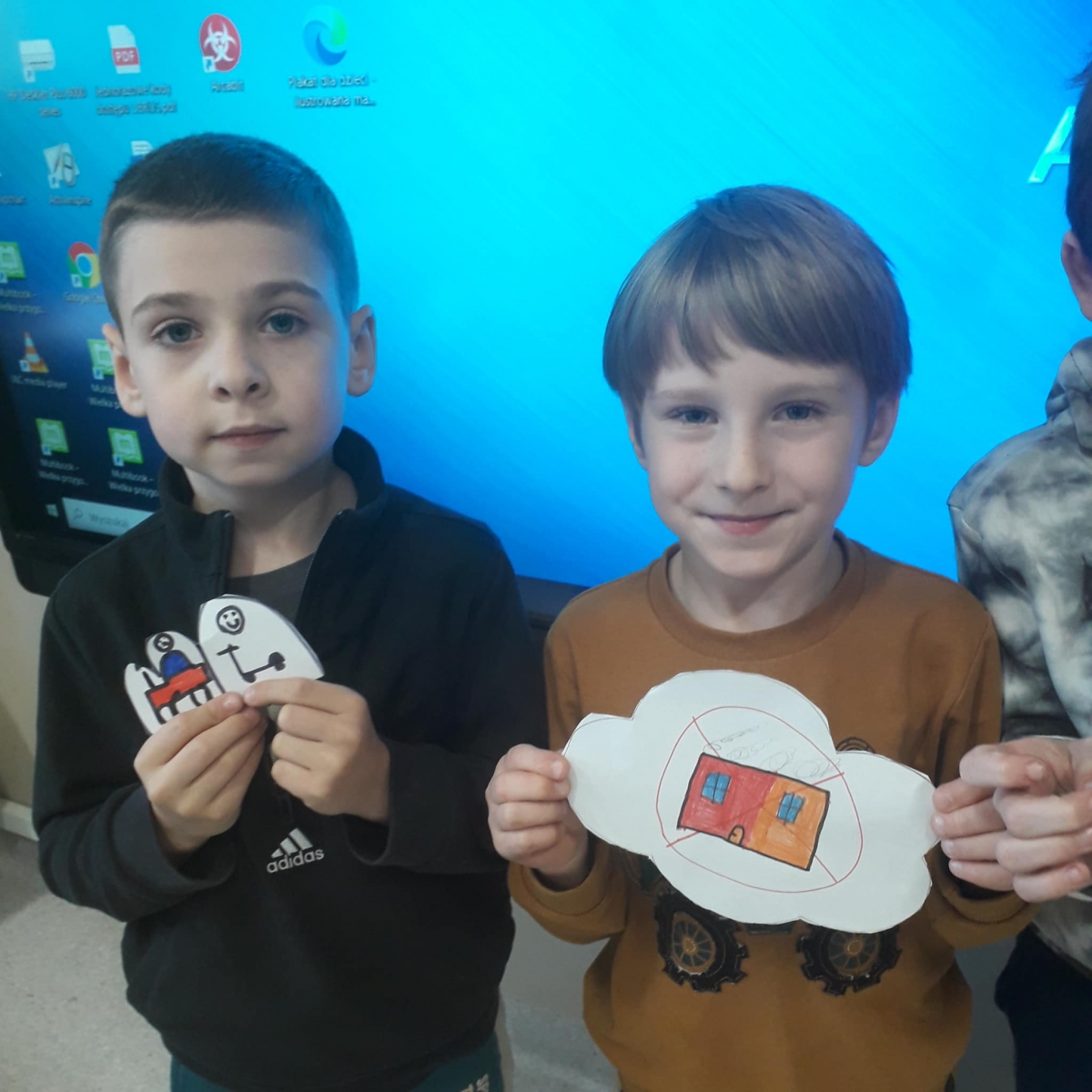 Na podsumowanie zajęć uczniowie na niebieskich chmurkach wypisywali lub rysowali swoje pomysły na to, w jaki sposób można zadbać o czyste powietrze. Wykonaną w ten sposób dekorację uczniowie powiesili na drzwiach swoich klas.
