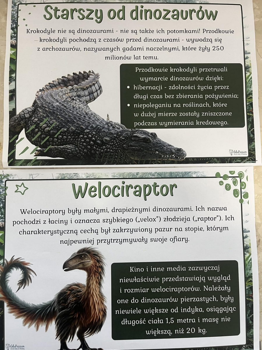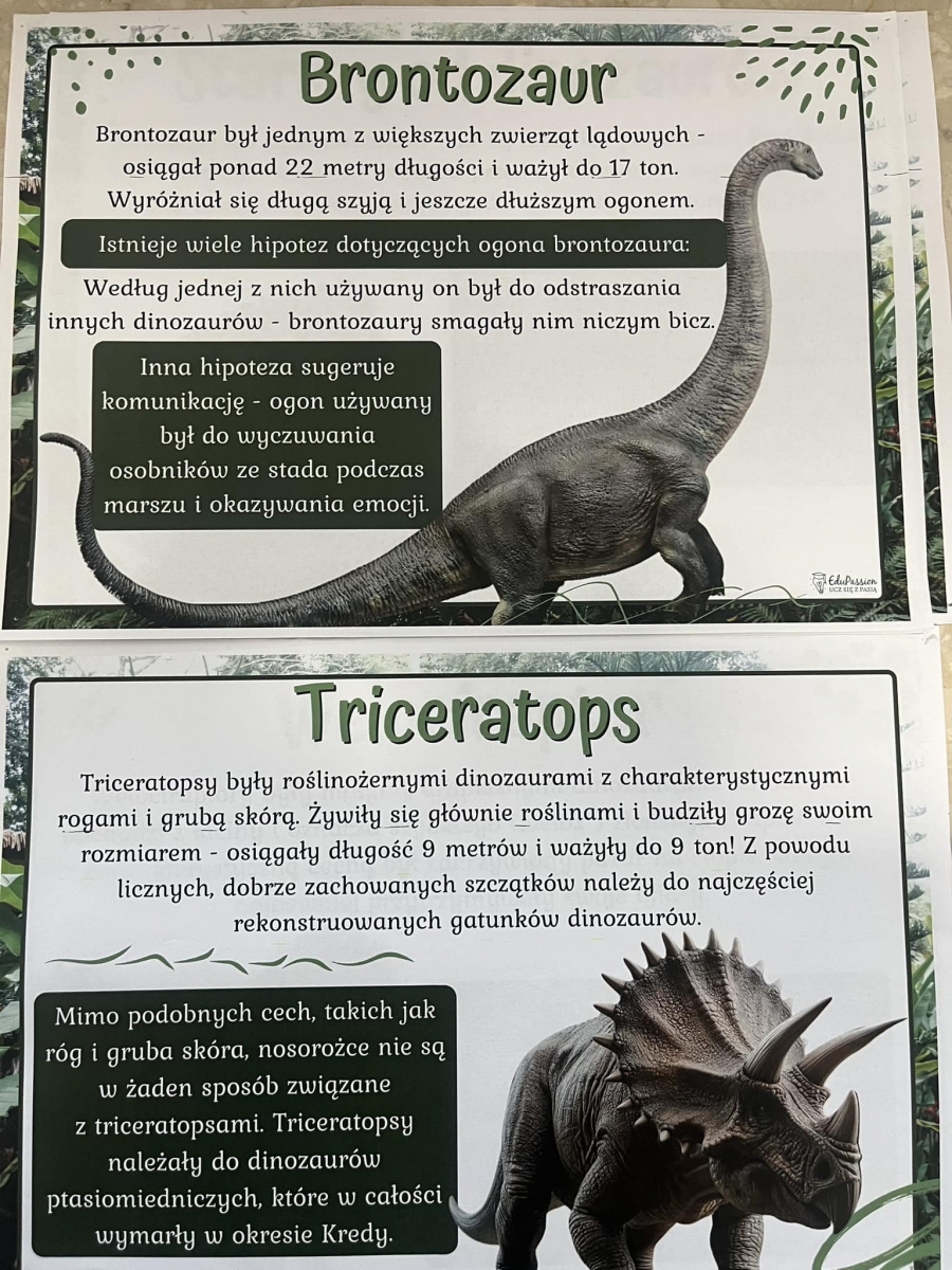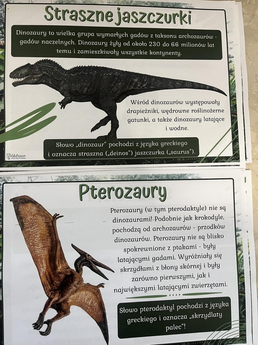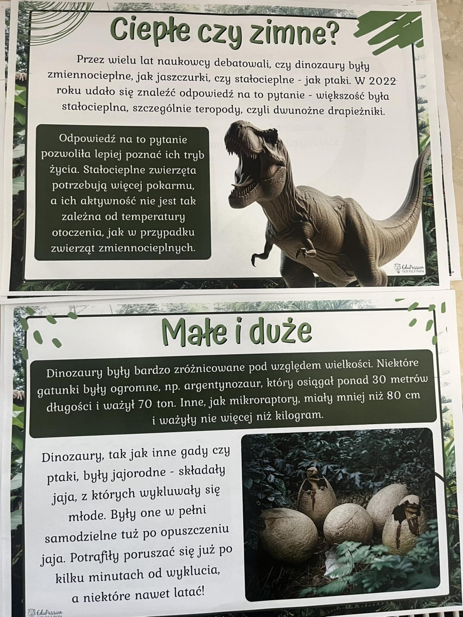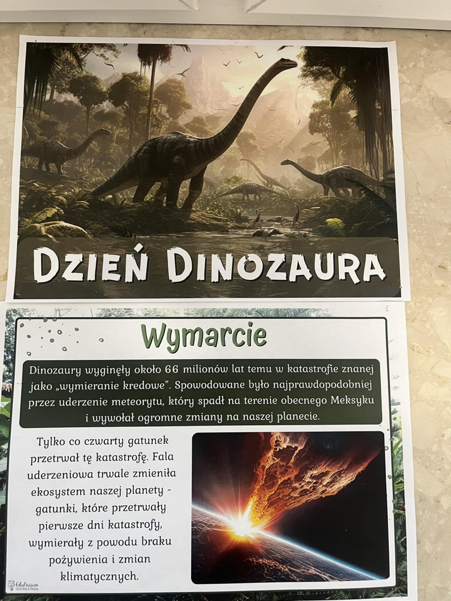 Dzisiaj na gazetkach przypominaliśmy o istnieniu tych wyjątkowych stworzeń, ich zwyczajach, środowisku, klimacie, krajobrazie oraz roślinności minionych lat. Można było poczytać na temat dinozaurów, dowiedzieć się, kiedy żyły, czym się żywiły i jak wyglądały.