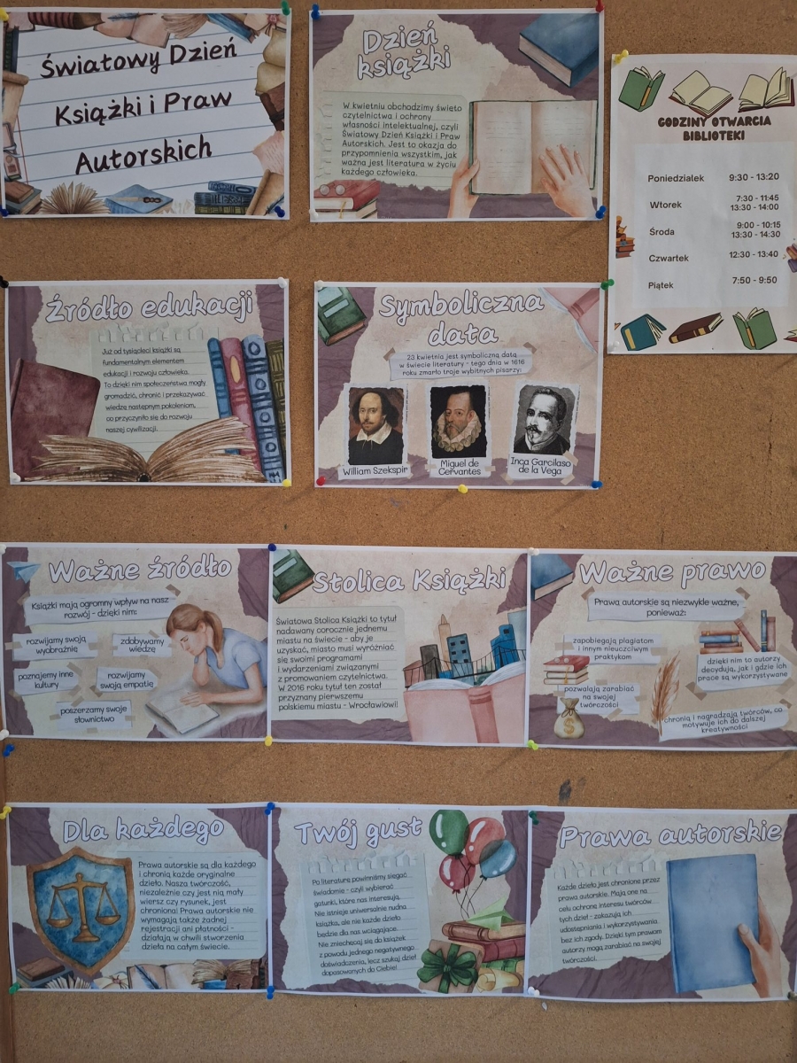 Historia święta książki sięga 1930 r. - właśnie wtedy zaczęto je obchodzić w Hiszpanii. Z kolei w roku 1964 zwyczaj ten zawędrował do wszystkich krajów hiszpańskojęzycznych, stając się wydarzeniem międzynarodowym. Hiszpański akcent towarzyszy zresztą tej imprezie do dzisiaj, bowiem celebruje się ją co roku 23 kwietnia - a zatem w dniu śmierci Miguela de Cervantesa, twórcy postaci Don Kichota. Tego samego dnia odszedł jeszcze jeden wybitny twórca światowej literatury, William Shakespeare. Nic zatem dziwnego, że akurat ta data stała się ostatecznie znakiem rozpoznawczym Światowego Dnia Książki. Z tej okazji w naszej szkole powstała biblioteczna gazetka okolicznościowa, a