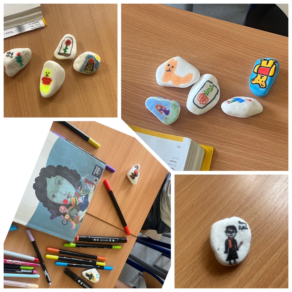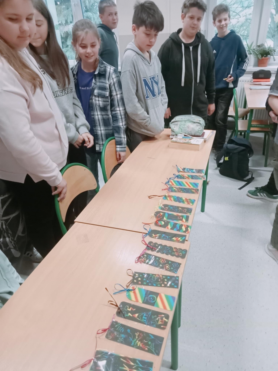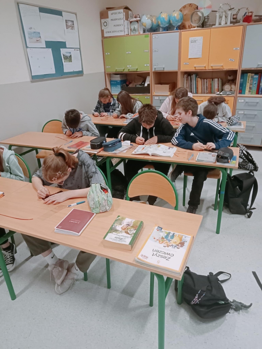 W czasie zajęć z języka polskiego uczniowie włączyli się bardzo aktywnie w promocję tych ważnych świąt i przedstawiali bohaterów ulubionych lektur szkolnych w sposób niekonwencjonalny: powstały piękne wydrapywane zakładki do książek, kamyczkowe podobizny bohaterów i „rosnące obrazki” z lektur szkolnych.