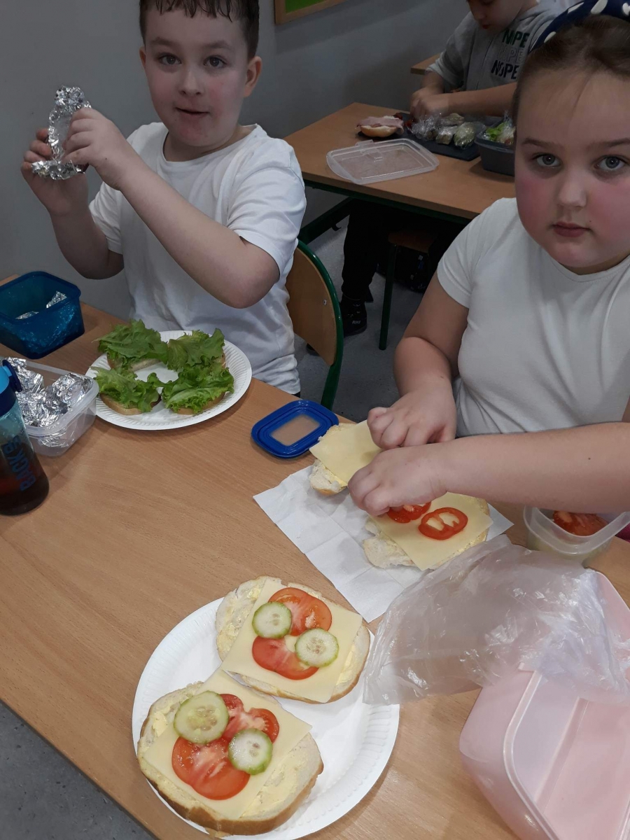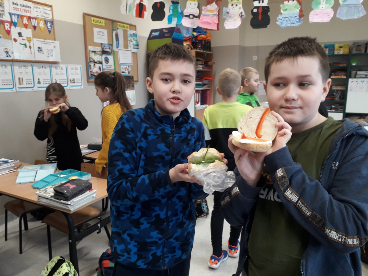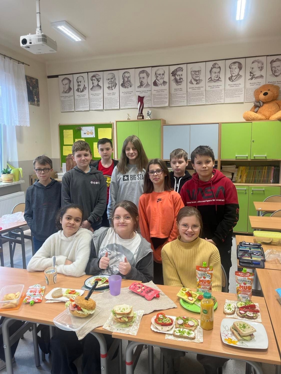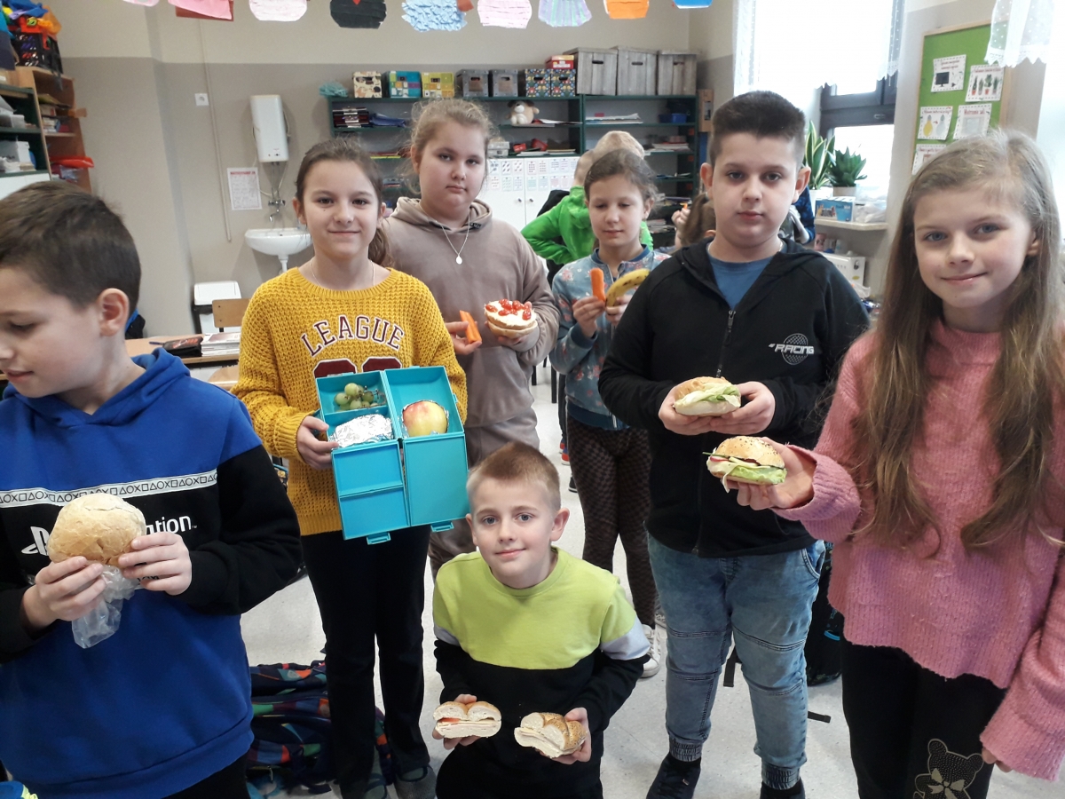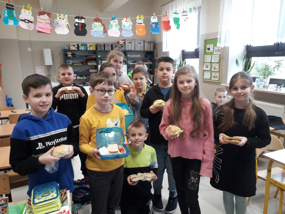 W lutym w naszej szkole obchodziliśmy Dzień Zdrowego Śniadania. Tego dnia dzieci przyniosły do szkoły wszystko to, co jest niezbędne, aby przygotować zdrowe śniadanie tzn. świeże warzywa i owoce, masło, sery, szynkę, ciemne pieczywo. Pamiętając o higienie i bezpieczeństwie, uczniowie pod opieką wychowawców przygotowali swoje drugie śniadanie. Były to zdrowe, kolorowe i apetyczne kanapki. Następnie uczniowie przystąpili do wspólnej degustacji przygotowanych przez siebie śniadań. Zrobione własnoręcznie, smakowały wyjątkowo.