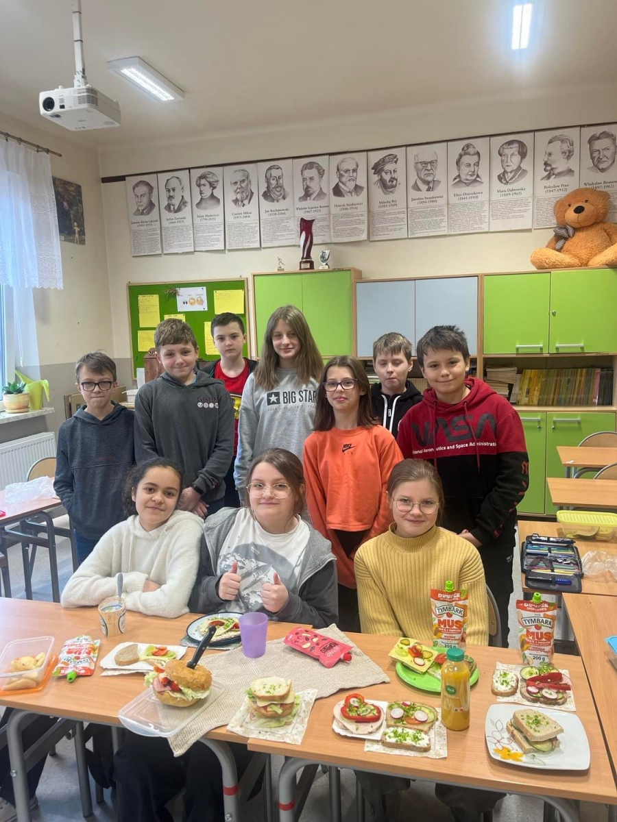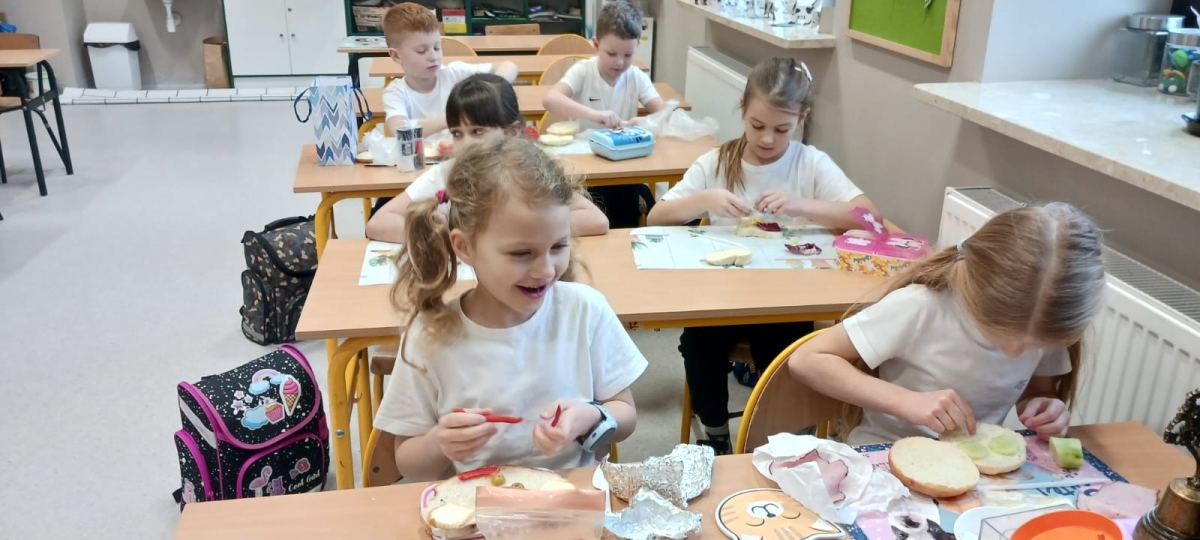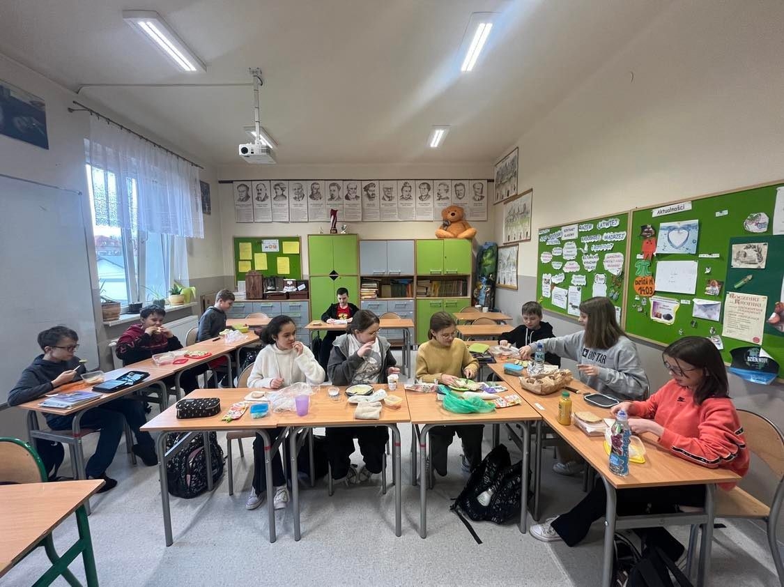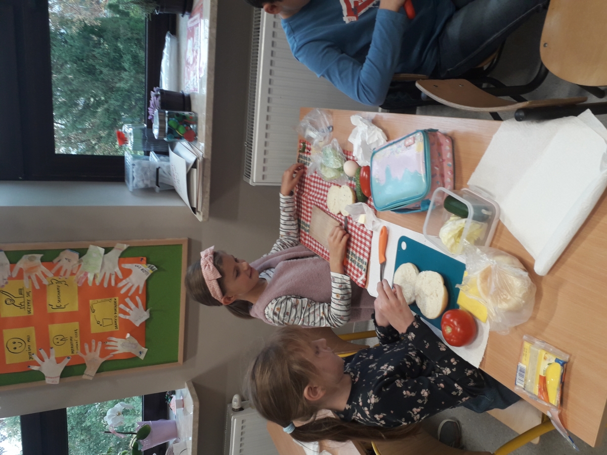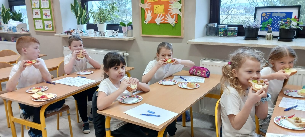 W lutym w naszej szkole obchodziliśmy Dzień Zdrowego Śniadania. Tego dnia dzieci przyniosły do szkoły wszystko to, co jest niezbędne, aby przygotować zdrowe śniadanie tzn. świeże warzywa i owoce, masło, sery, szynkę, ciemne pieczywo. Pamiętając o higienie i bezpieczeństwie, uczniowie pod opieką wychowawców przygotowali swoje drugie śniadanie. Były to zdrowe, kolorowe i apetyczne kanapki. Następnie uczniowie przystąpili do wspólnej degustacji przygotowanych przez siebie śniadań. Zrobione własnoręcznie, smakowały wyjątkowo.
