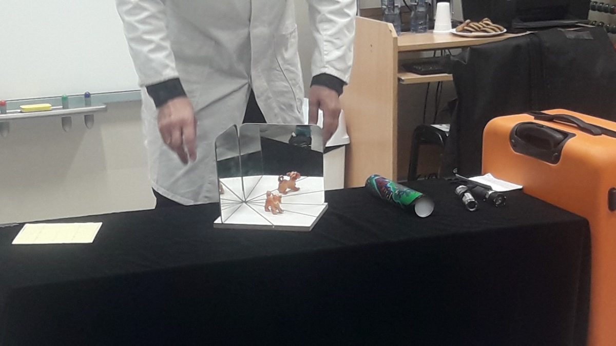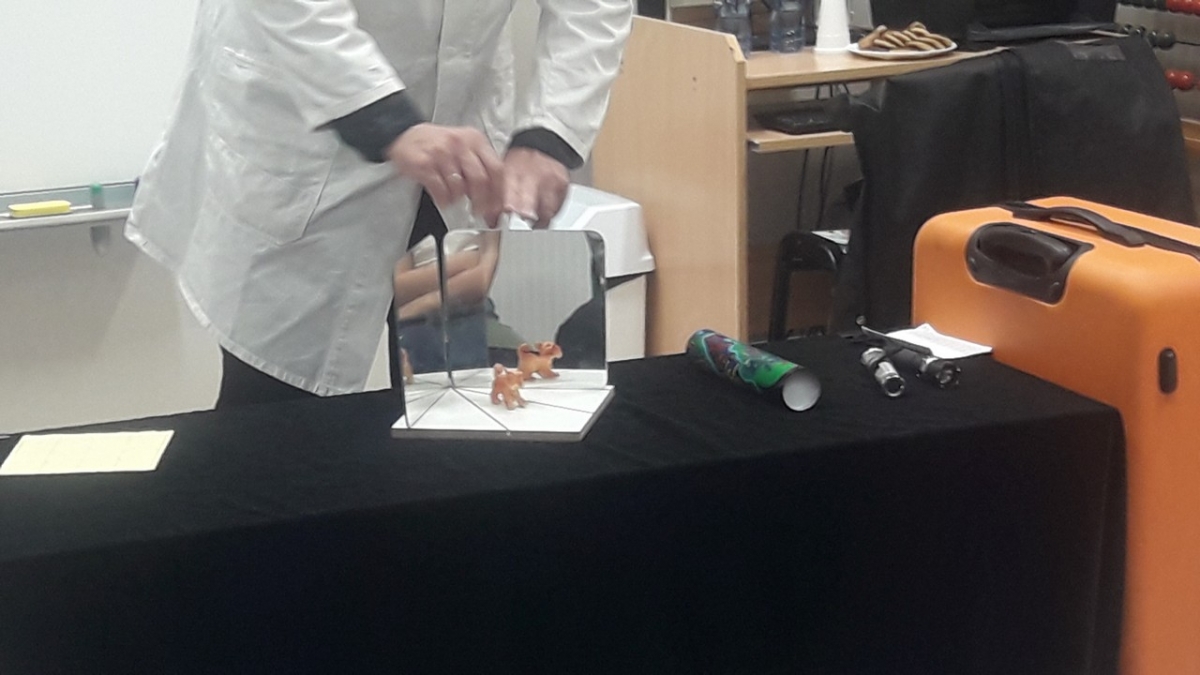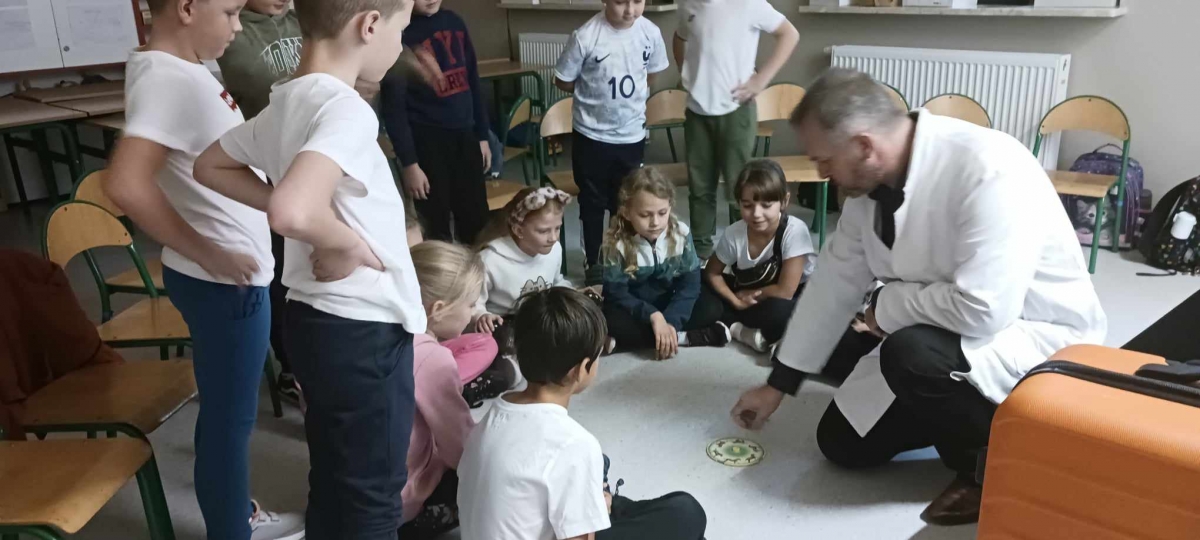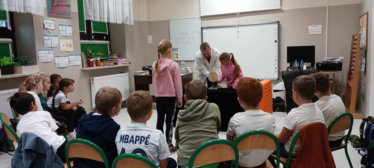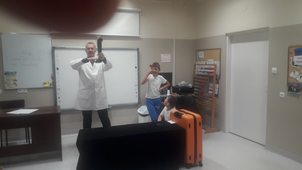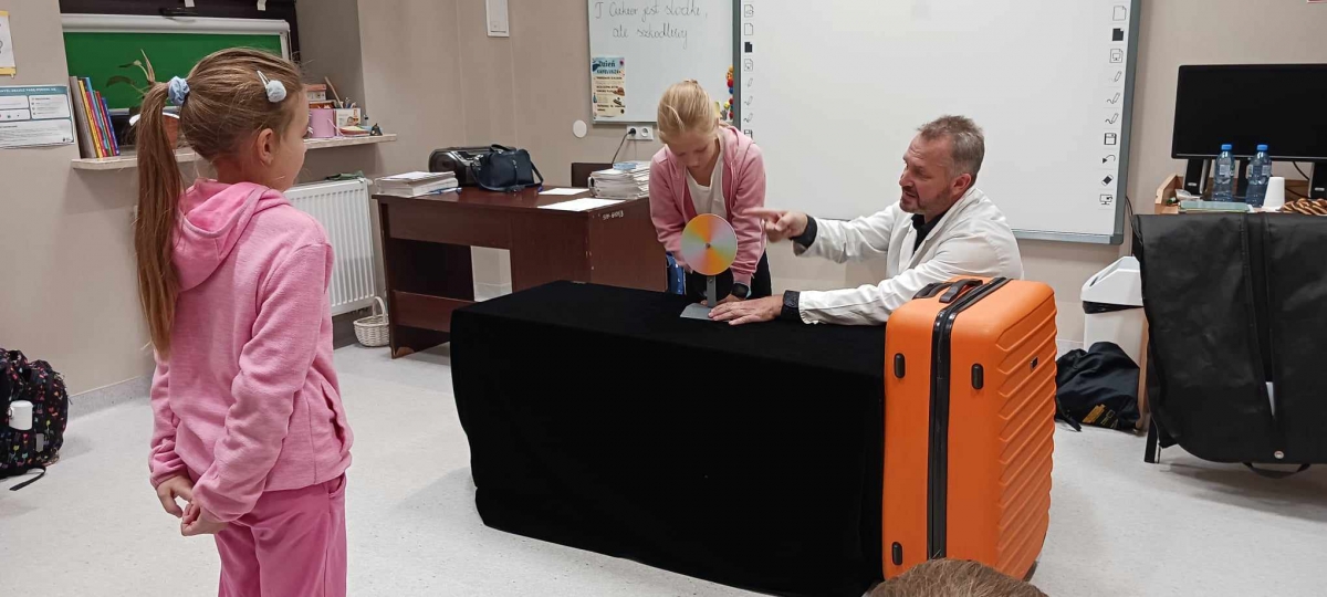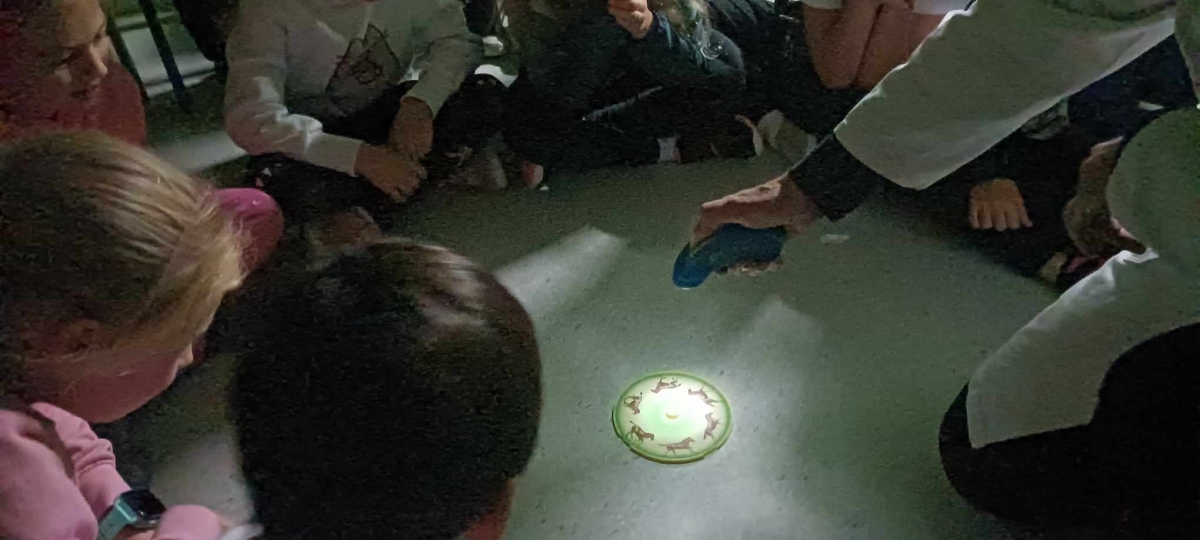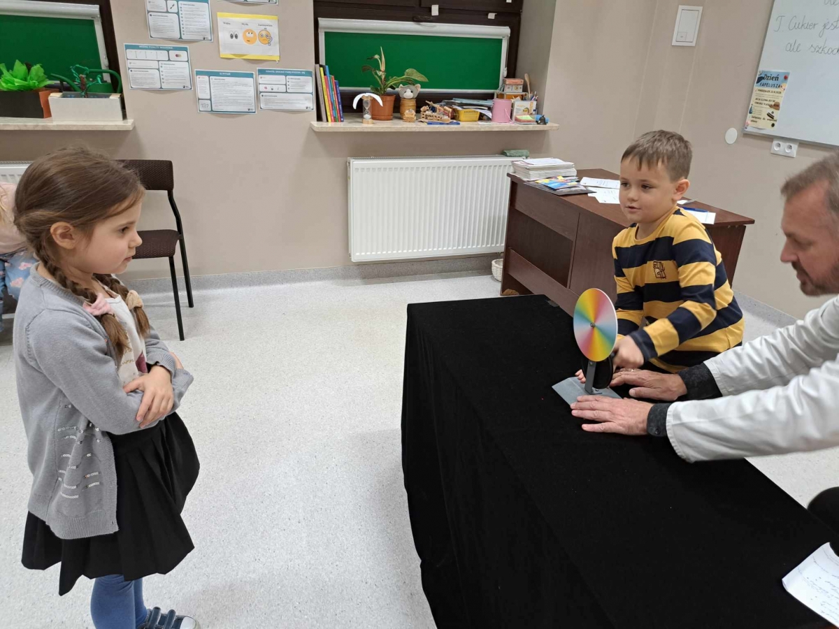 Największy zachwyt wśród dzieci wywołał eksperyment z ruchem. Prowadzący pomocy światła stroboskopowego stworzył efekt skokowego ruchu narysowanych na tarczach zwierząt, a nawet postaci chłopca.