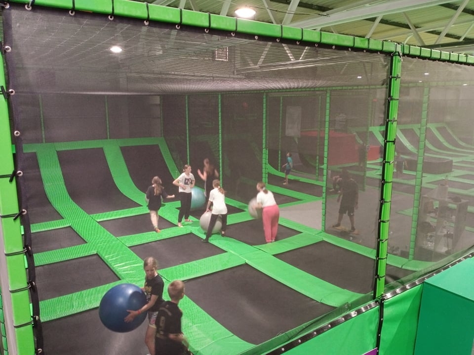W strojach sportowych uzupełnionych o specjalne skarpetki po profesjonalnej rozgrzewce z instruktorem rozpoczęło się szaleństwo skakania na trampolinach na różne sposoby.