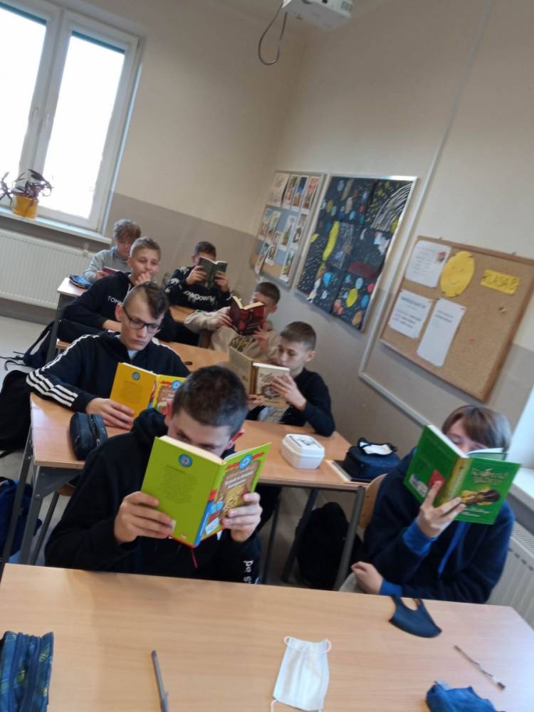 Uczniowie klasy VIII w ramach wyznaczonego czasu na bicie rekordu w liczbie osób czytających na przerwie zgromadzili się też w swojej sali, aby poczytać lektury wypożyczone z biblioteki szkolnej.