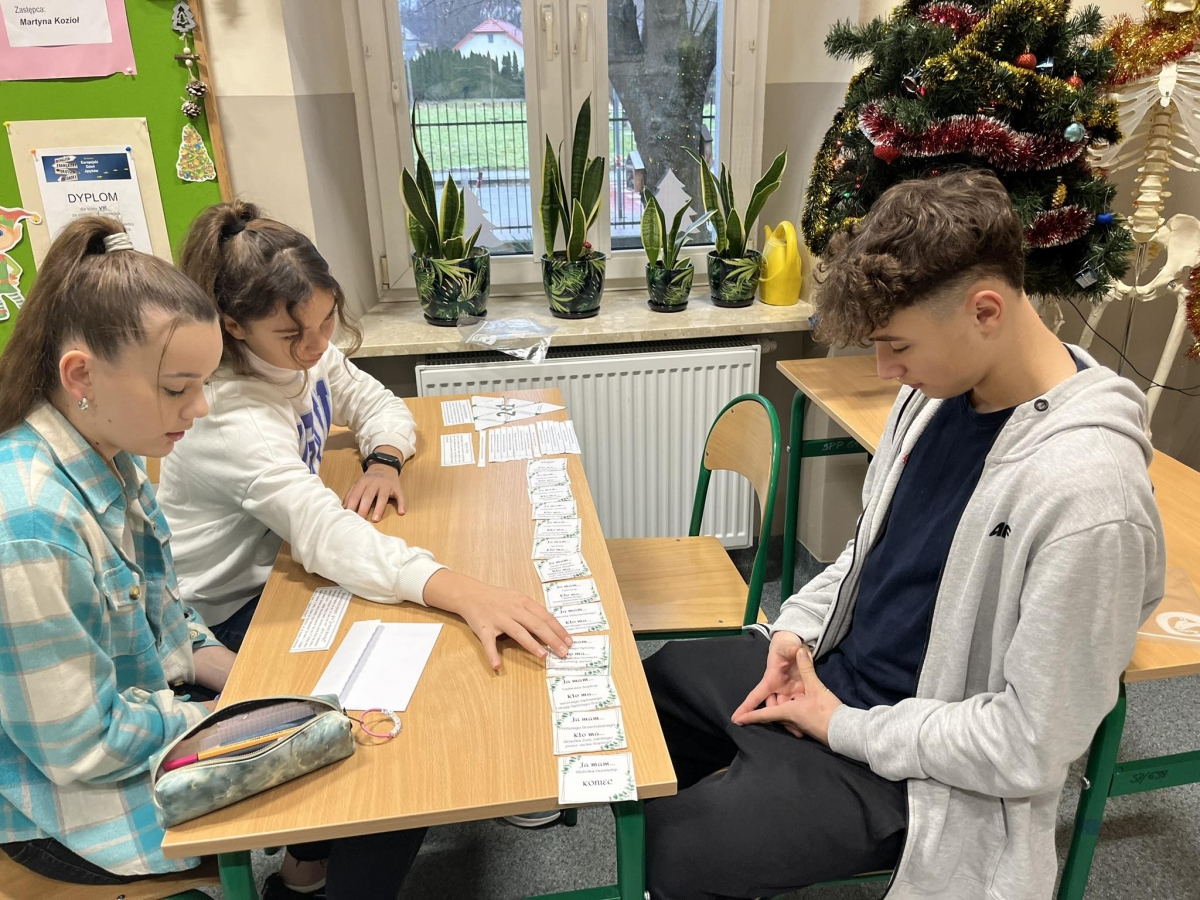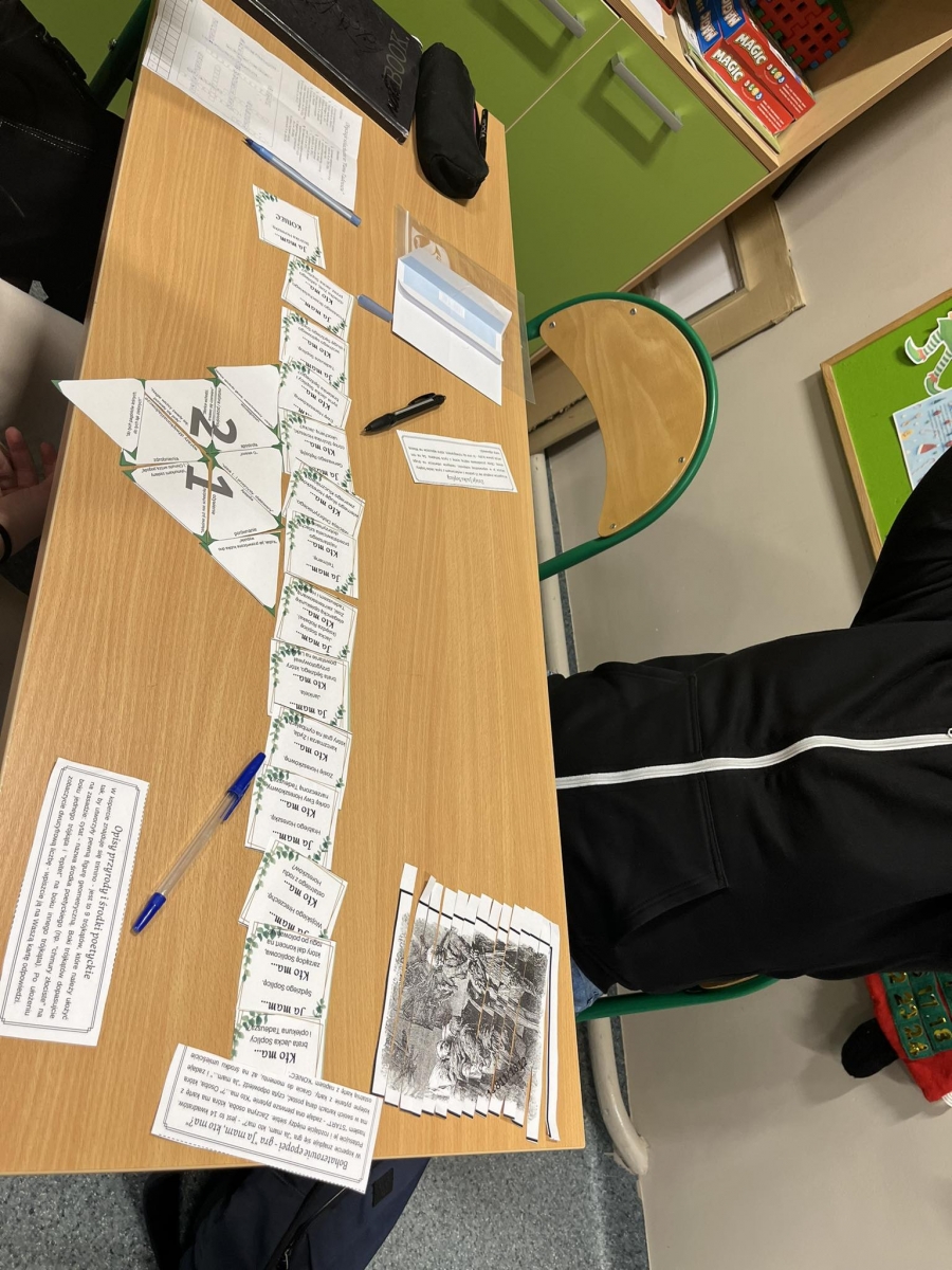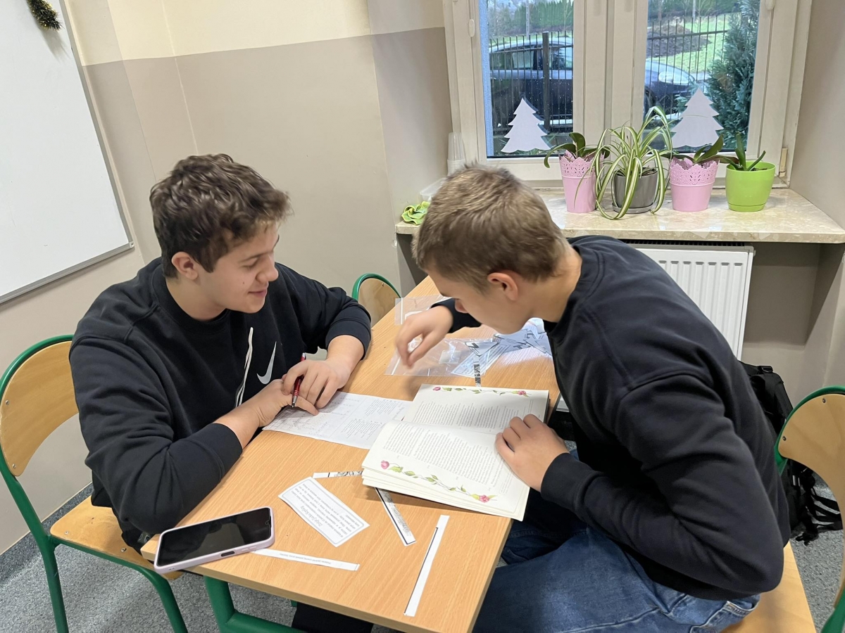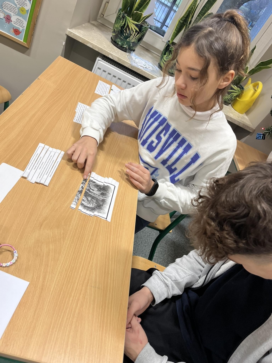 Na lekcji poświęconej podsumowaniu wiadomości z lektury „Pan Tadeusz” Adama Mickiewicza młodzi ludzie w ten odmienny od tradycyjnego sprawdzianu sposób sprawdzali swoją wiedzę, rozwiązując ćwiczenia – zagadki.