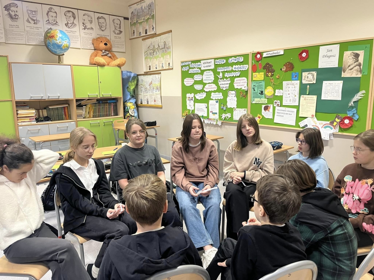 Spotkanie rozpoczęło się od ćwiczenia grupowego Głuchy telefon - plotka, które pozwoliło dzieciom w sposób praktyczny zrozumieć zniekształcenia pojawiające się w codziennej komunikacji. Zabawa zobrazowała uczestnikom zajęć, w jaki sposób rodzą się plotki. Nie zawsze osoba, która ,,rozsiewa wieści” ma złe intencje.