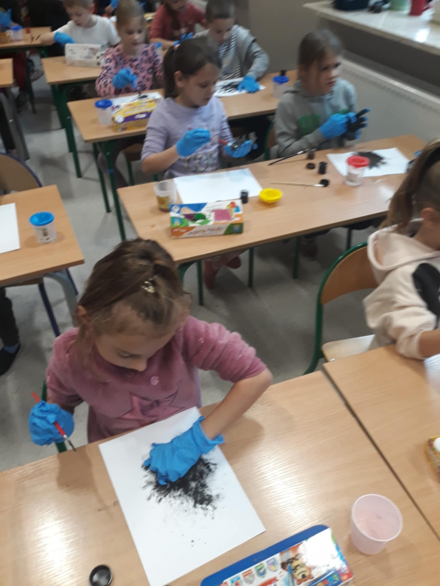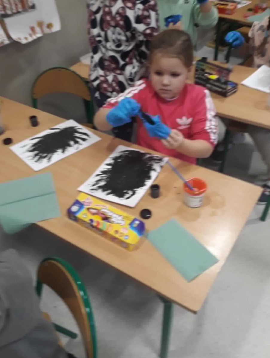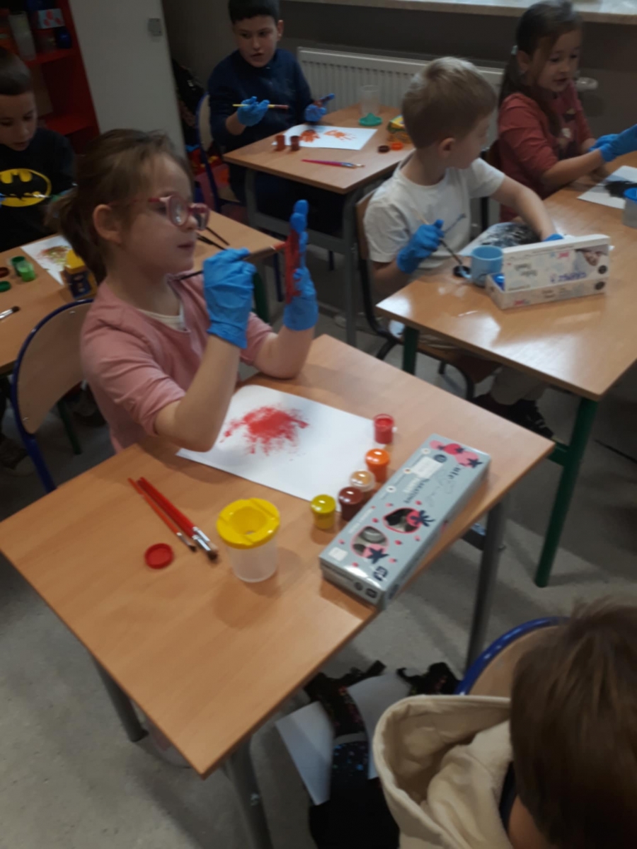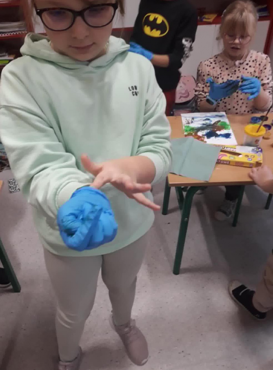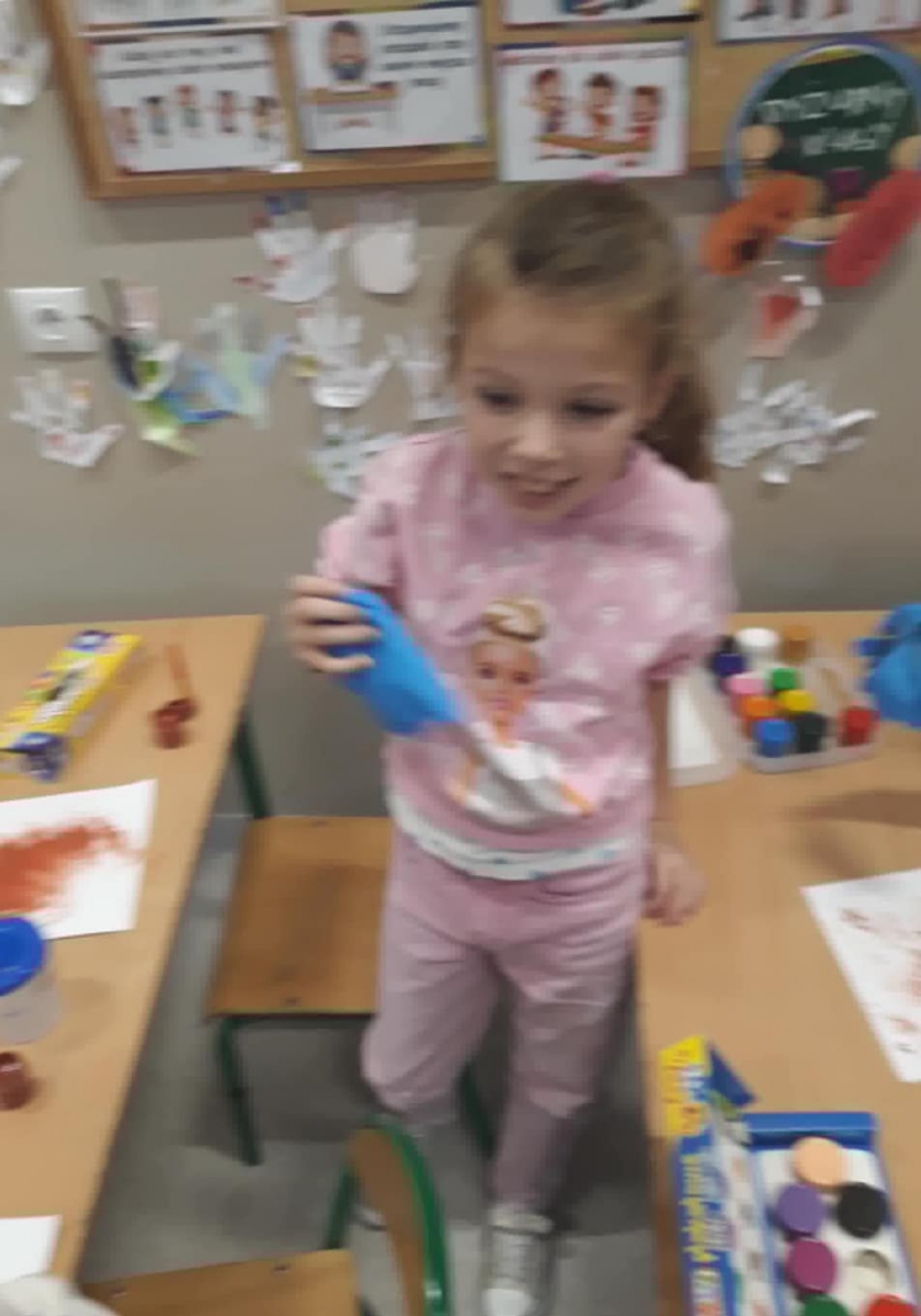 Dzisiejsze zajęcia plastyczne, malowanie farbami, były niekonwencjonalną formą do oswajania się z zabezpieczeniem w postaci rękawiczek. Dzieci rękami malowały obrazy, a następnie zdejmowały rękawiczki tak, aby się nie pobrudzić.