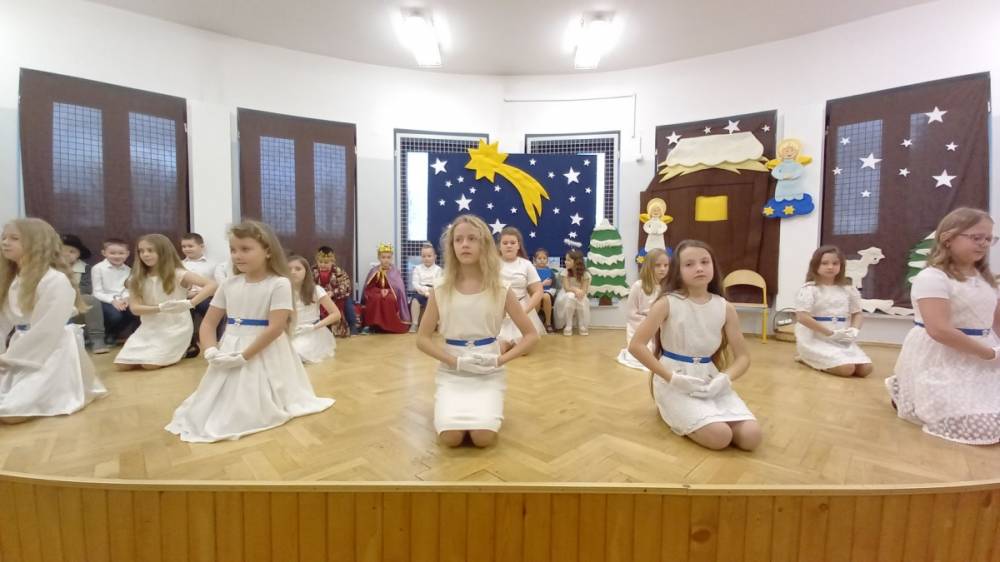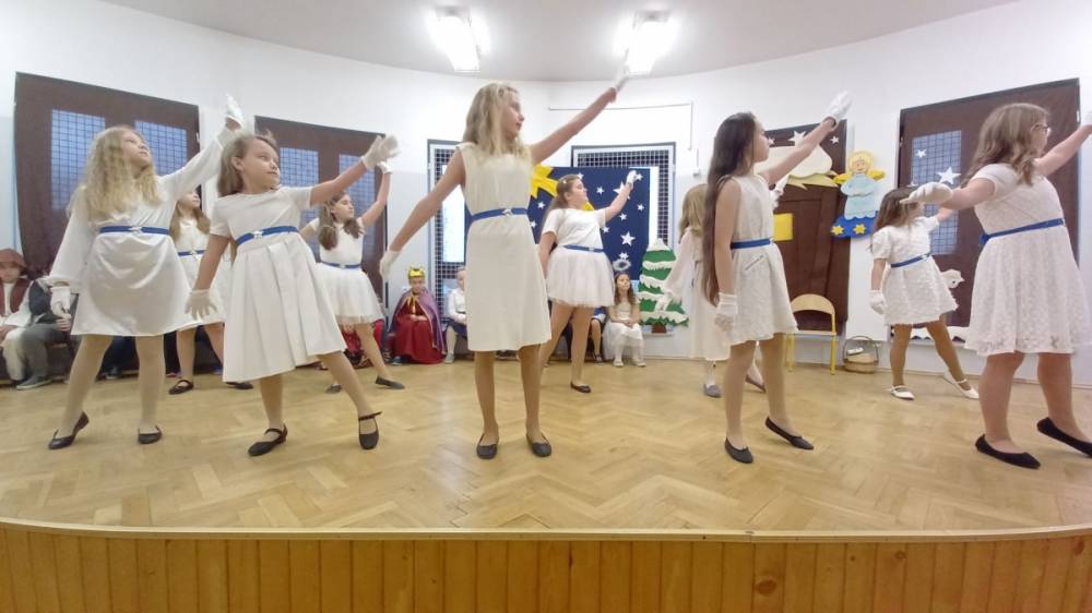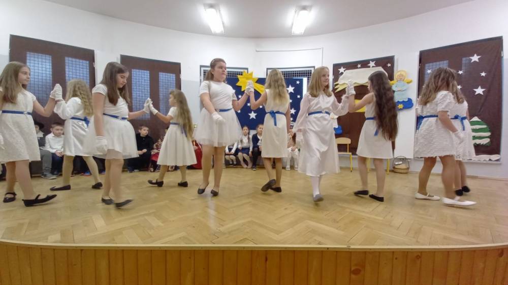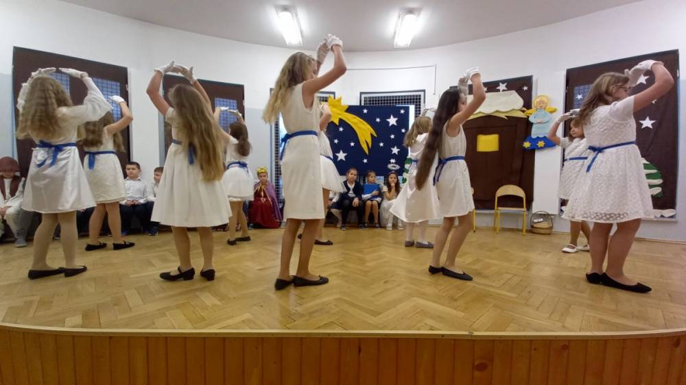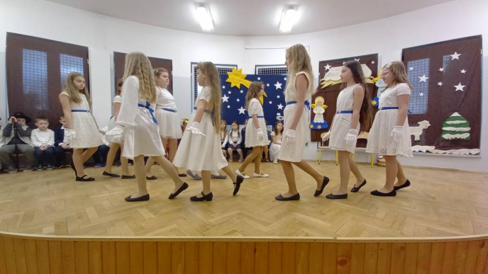 Po przedstawieniu jasełkowym dziewczynki z klasy III pod kierunkiem Pani Elżbiety Nęckiej zatańczyły taniec śnieżynek . Był to pełen wdzięku i uroku taniec na cześć Jezusa, który przyszedł na świat, aby dać nam wieczne zbawienie. Uczennice klasy III wprowadziły nas w świąteczny nastrój wdzięczności i piękna.