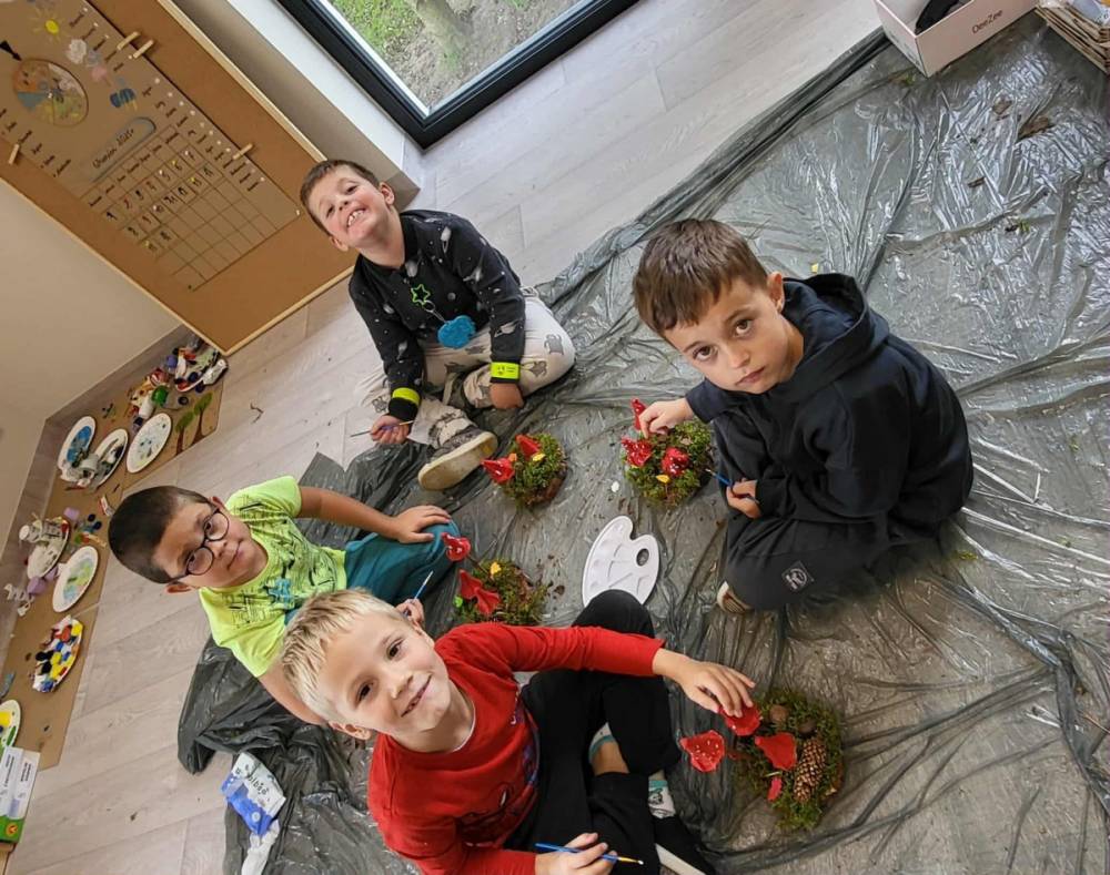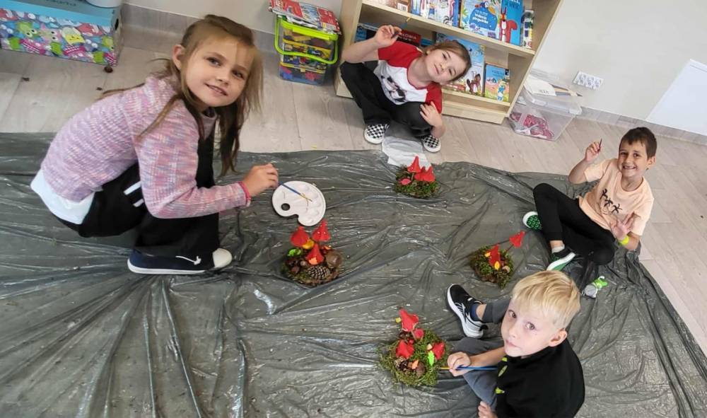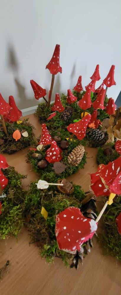 Klasa 1b stworzyła dziś jesienne stroiki – urocze domki muchomorowe z darów lasu.
