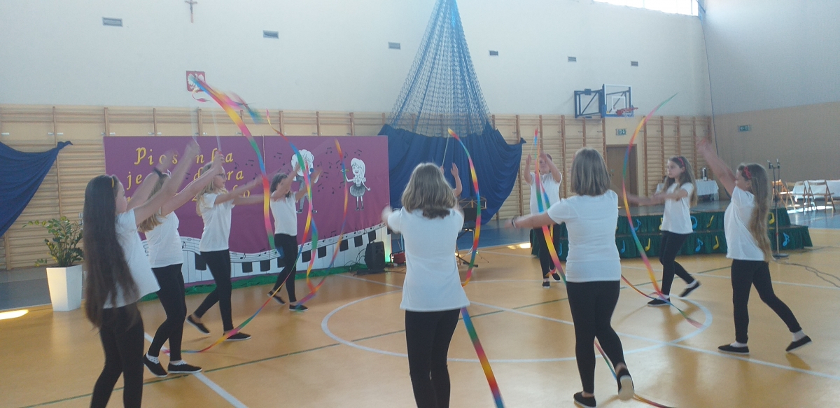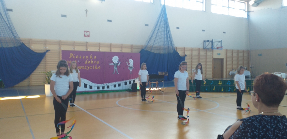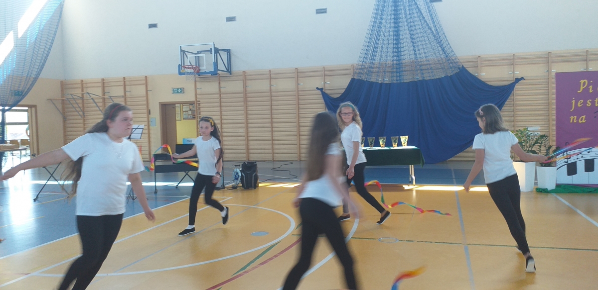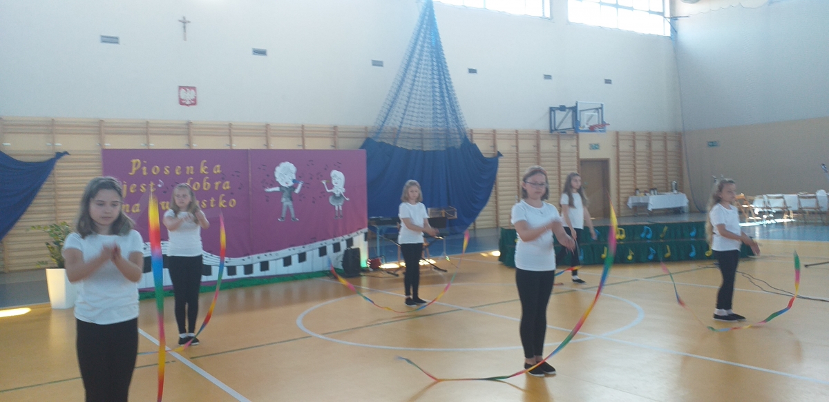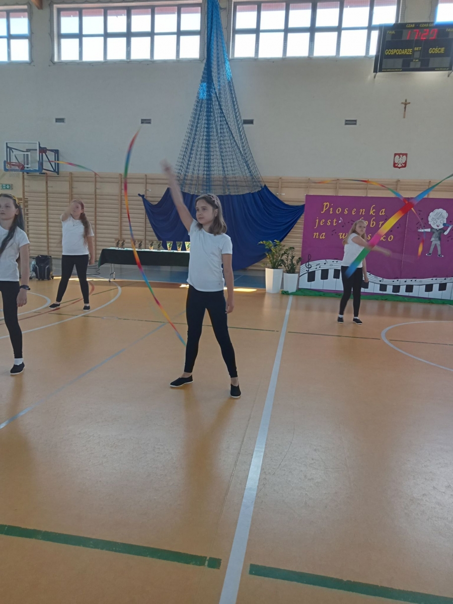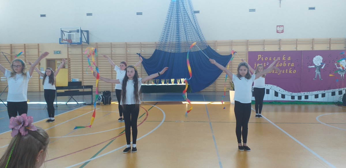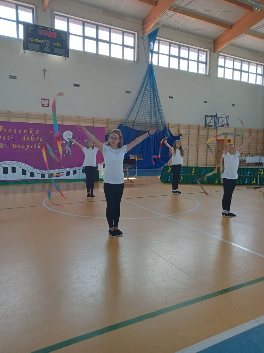 Reprezentantki naszej szkoły - uczennice z klasy trzeciej zaśpiewały piosenkę o tematyce patriotycznej oraz wykonały układ taneczny ze wstążką gimnastyczną.