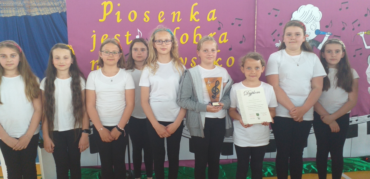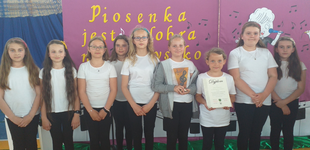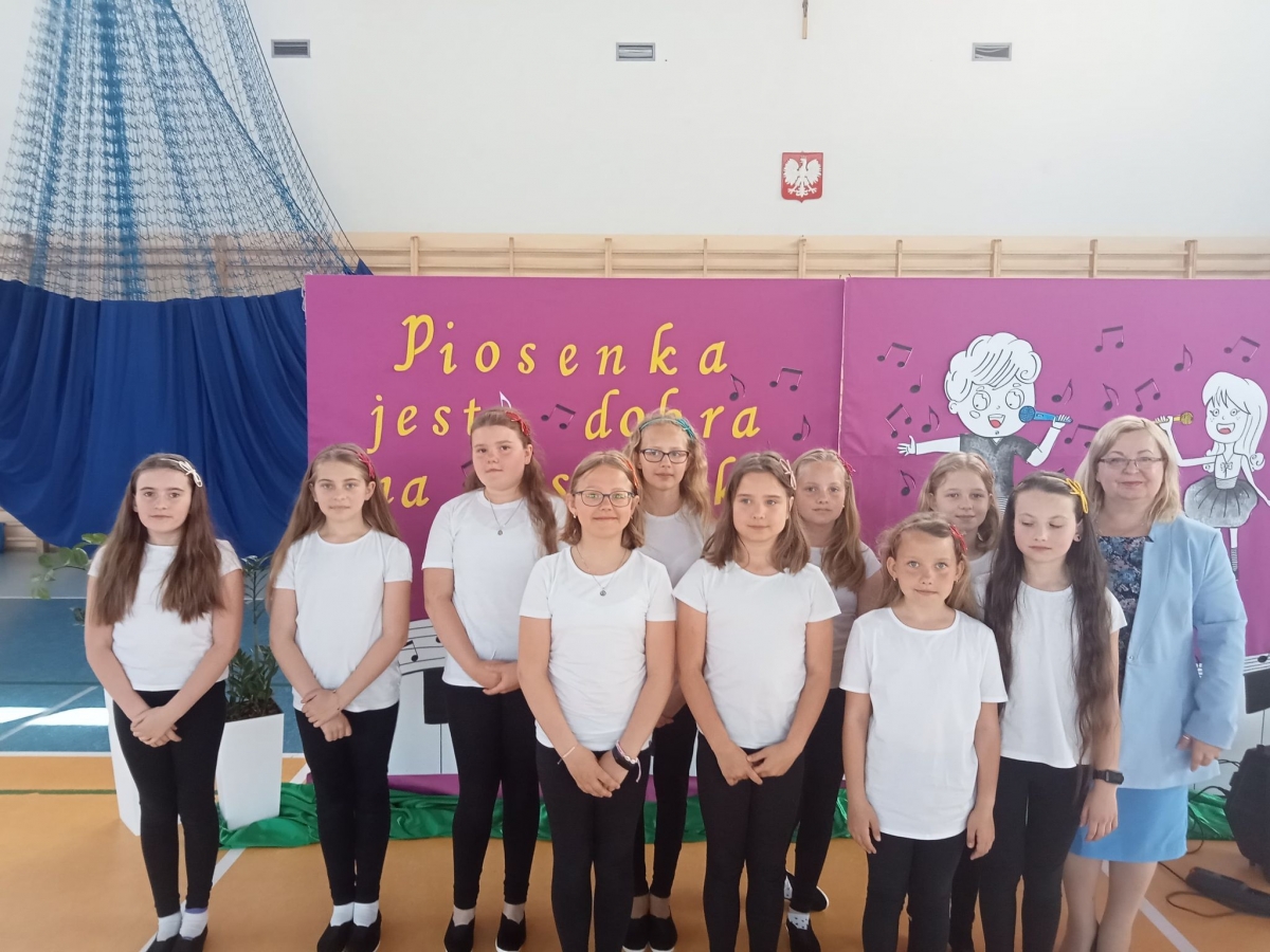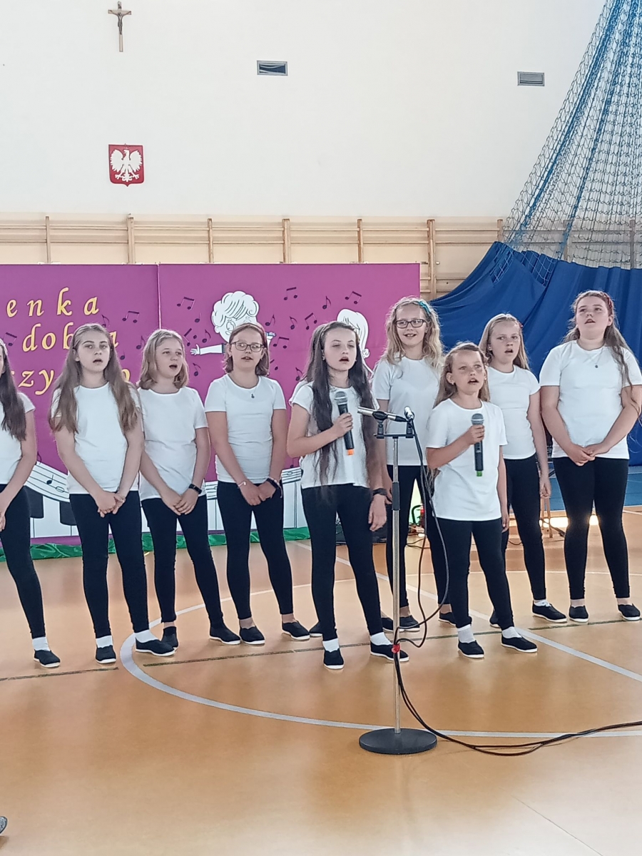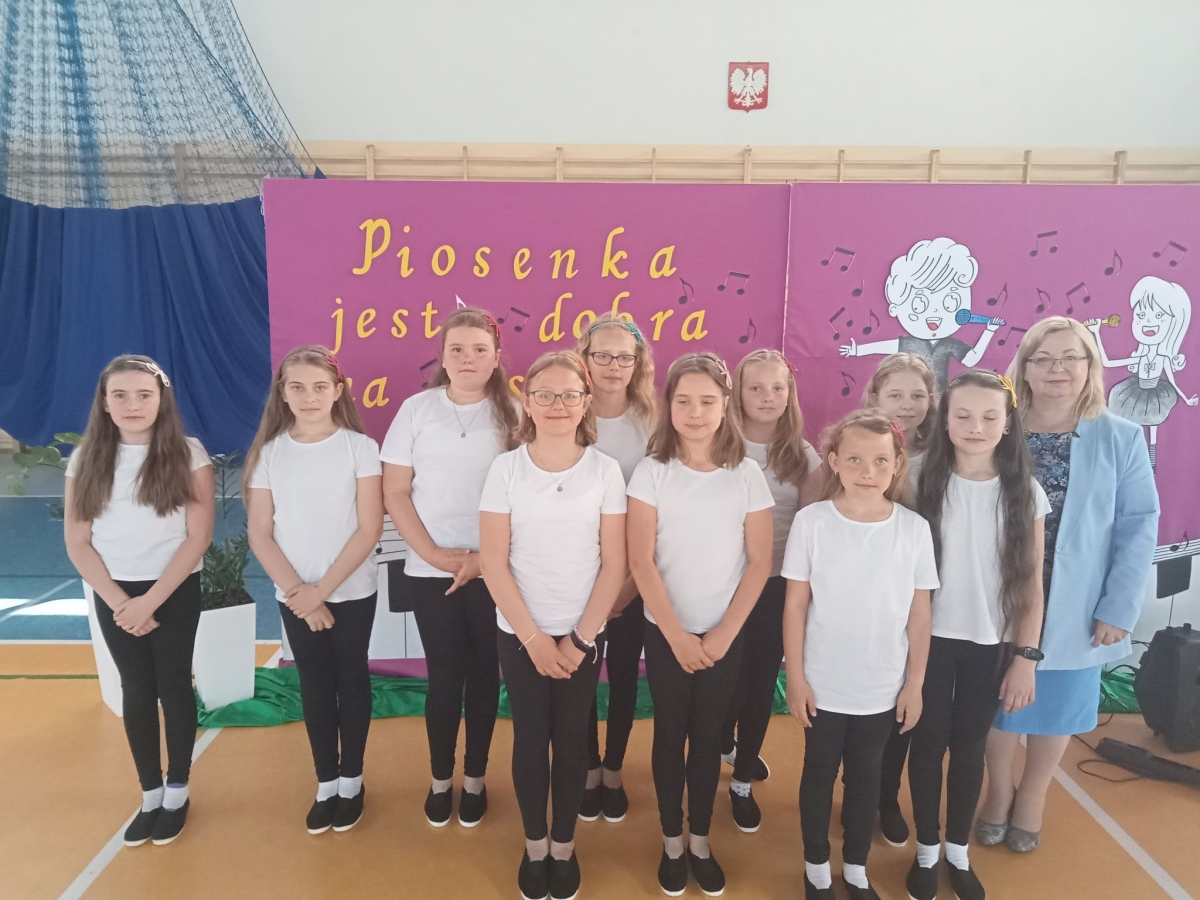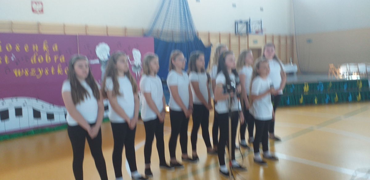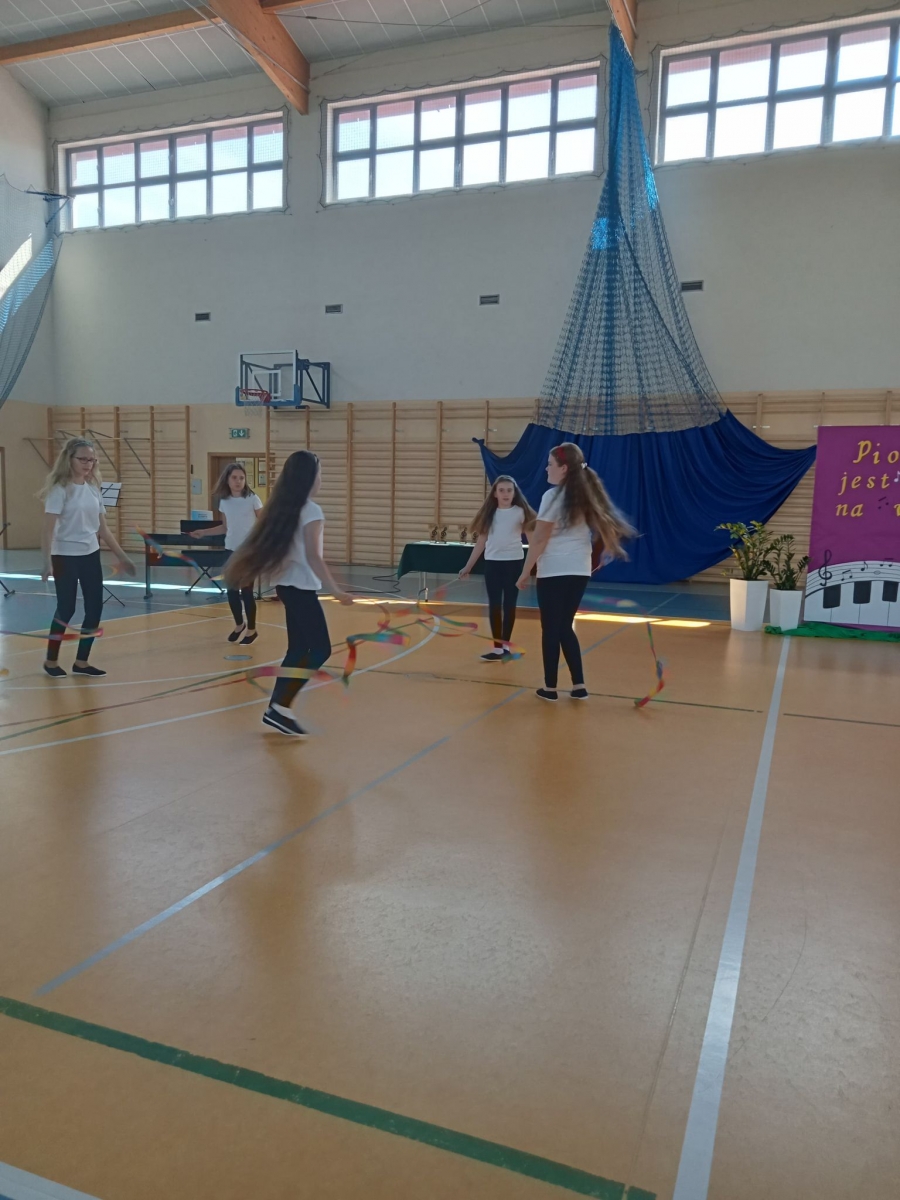 Reprezentantki naszej szkoły - uczennice z klasy trzeciej zaśpiewały piosenkę o tematyce patriotycznej oraz wykonały układ taneczny ze wstążką gimnastyczną.