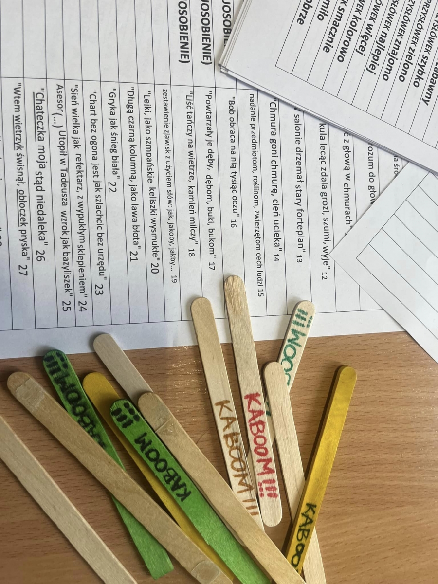 Na patyczkach laryngologicznych wypisane były przykłady i zadanie uczestnikw gry polegało na odpowiedzi, jaka to część mowy. Uczniowie losowali z kubeczka pytanie i mogli zyskać punkt za dobrą odpowiedź. W momencie, gdy gracz wylosował patyczek z napisem Kaboom! - tracił wszystkie punkty.