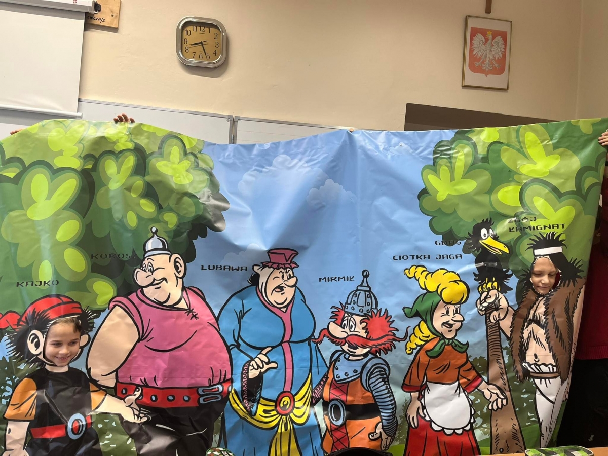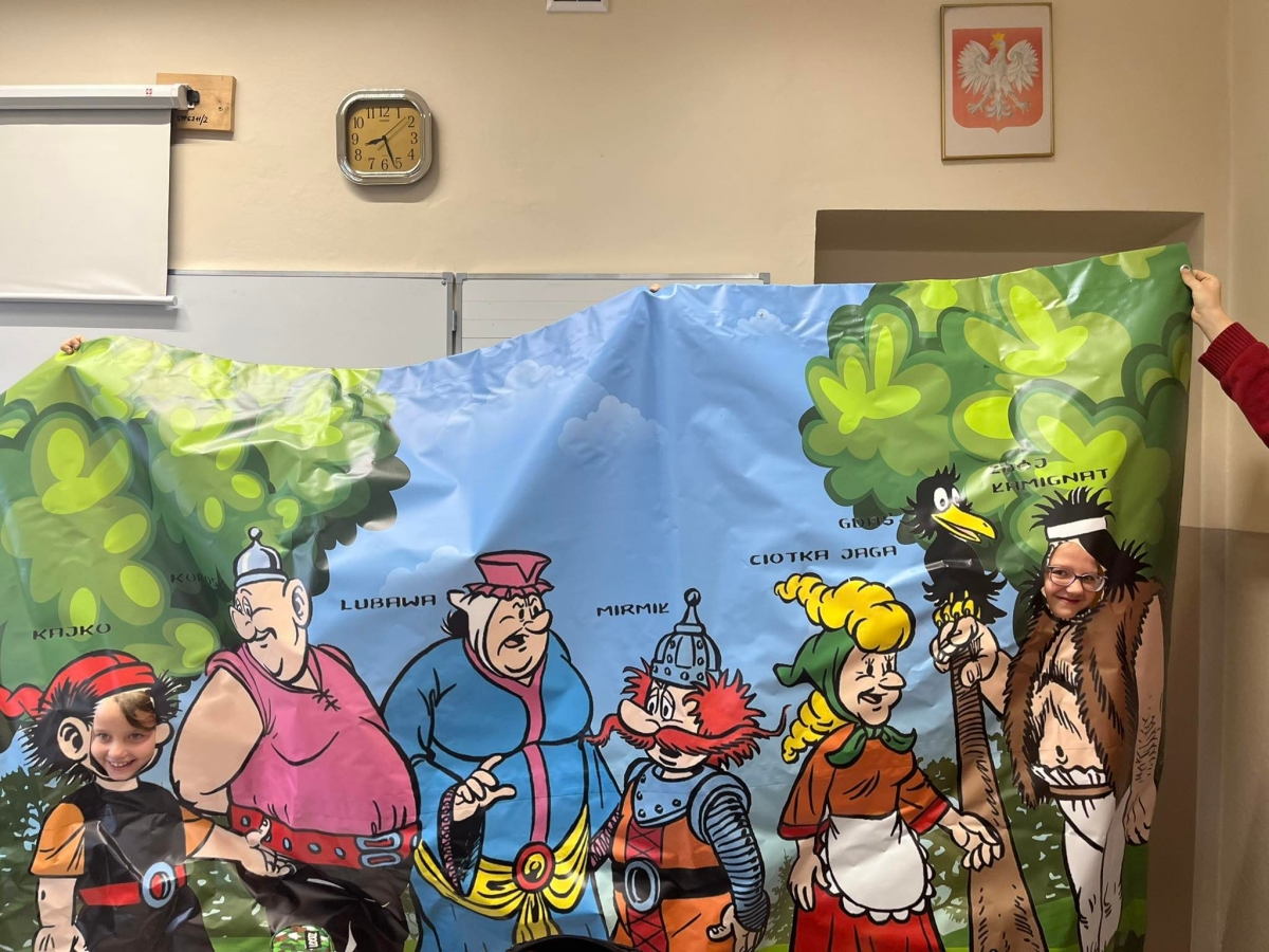 Na zakończenie zajęć uczniów czekała miła niespodzianka – mogli zobaczyć swoich bohaterów w powiększeniu na ogromnym plakacie i wcielić się w wybraną postać.