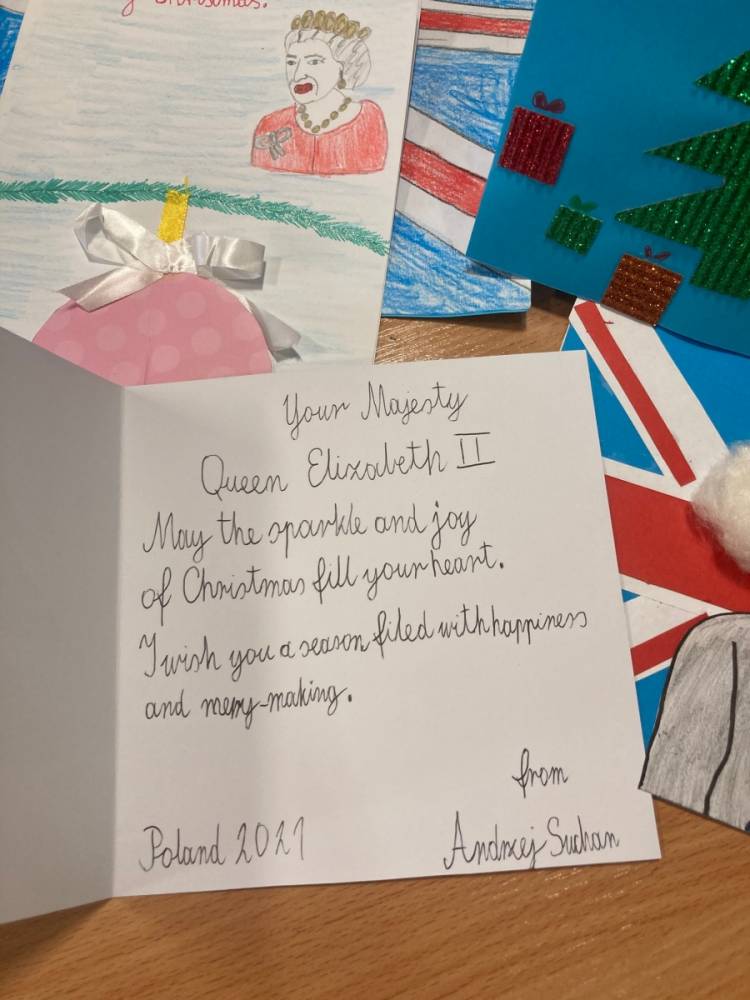 Okres przedświąteczny to czas na przygotowanie i wysyłanie kartek z życzeniami. W tym roku uczniowie naszej szkoły przygotowali kartki z życzeniami w języku angielskim, które zostały wysłane do Wielkiej Brytanii do królowej Elżbiety.