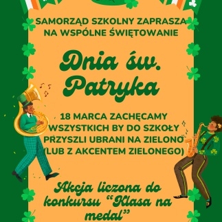 Zapraszamy do kolejnej akcji Samorządu Uczniowskiego, która liczy się do trwającego konkursu "Klasa na medal". SU policzy ilość osób w poszczególnych klasach, które będą brały udział w Dniu św. Patryka.