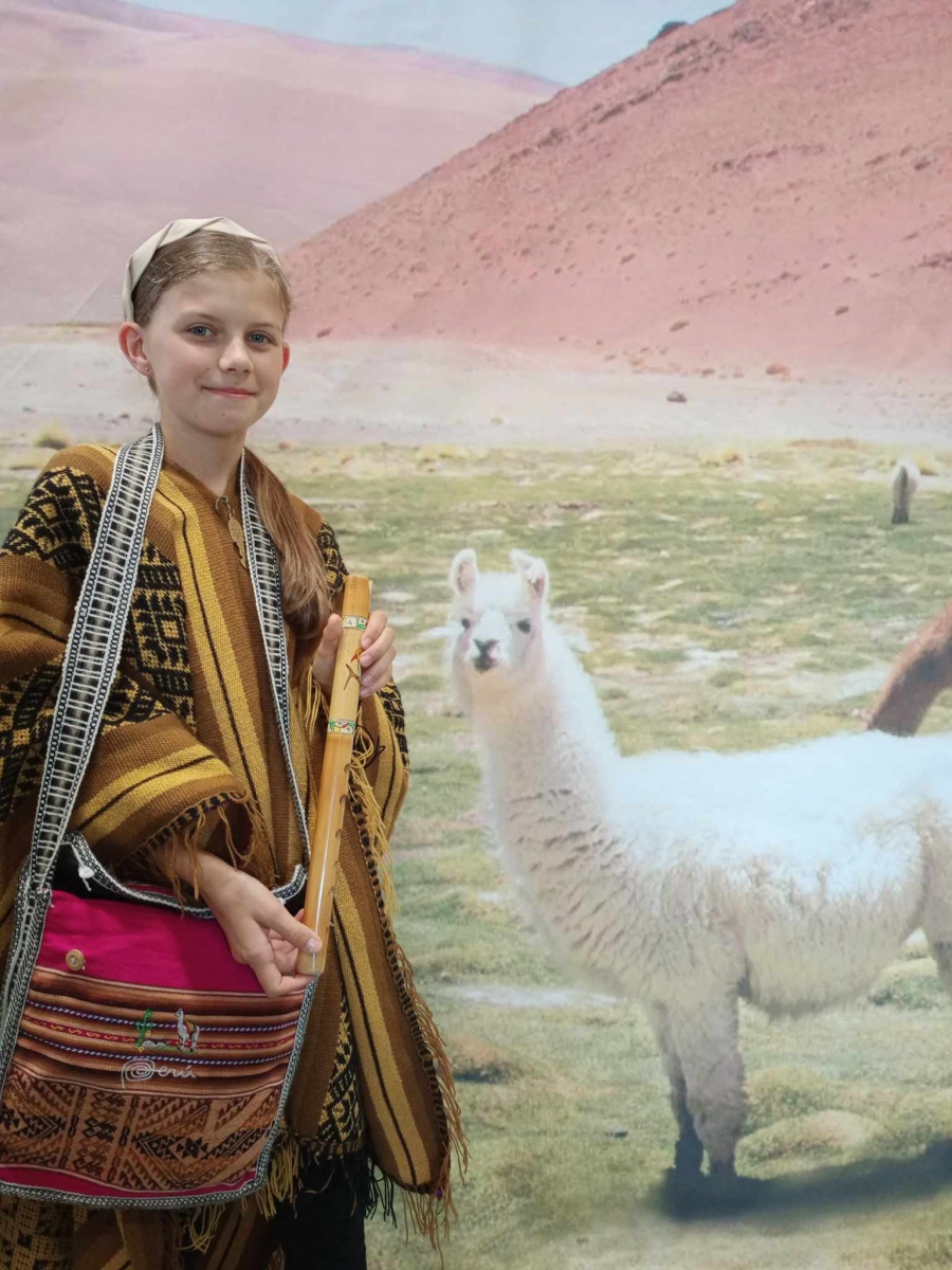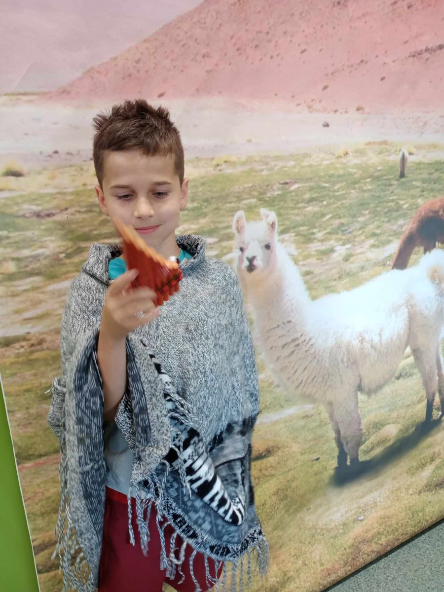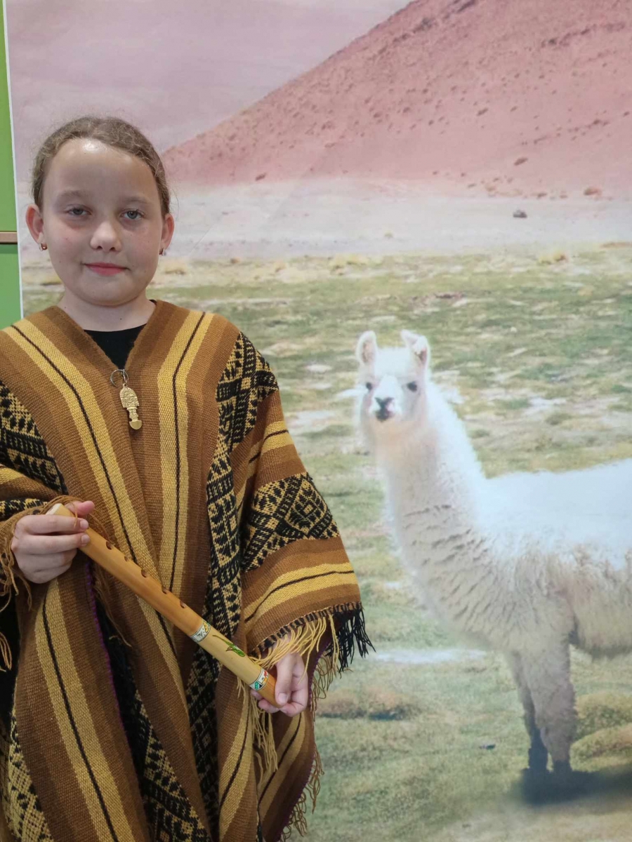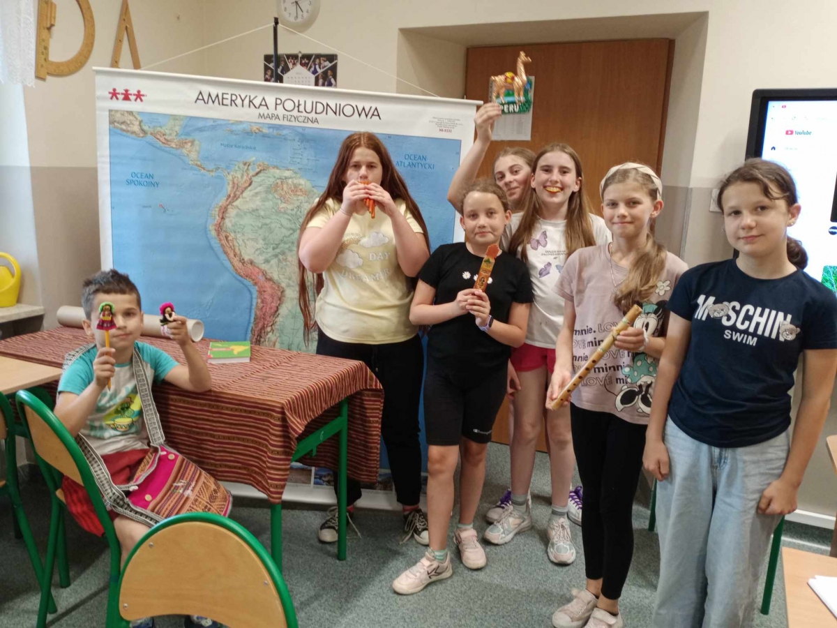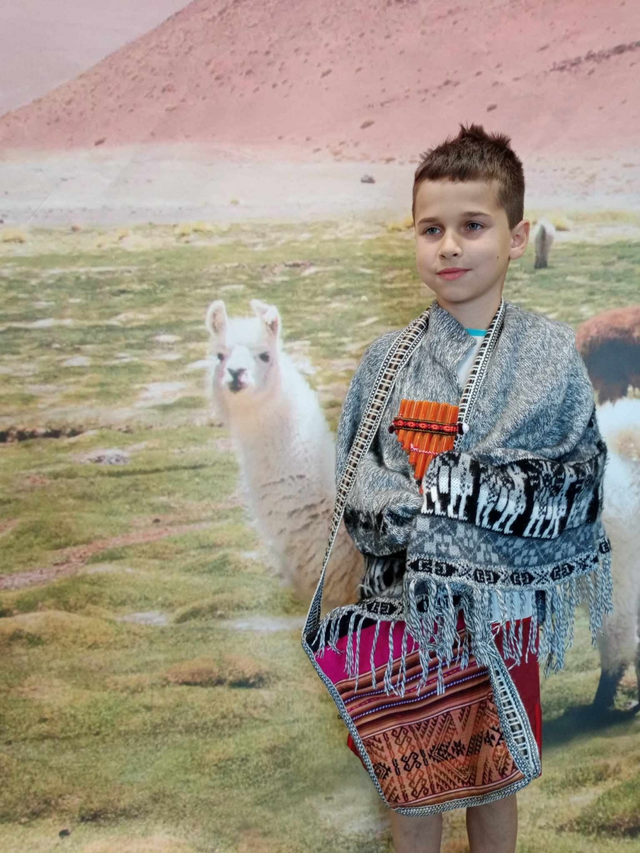 Tym razem uczestnicy zajęć gościli w Peru. Pani Basia najpierw przedstawiła krótki rys geograficzny, w czasie którego uczniowie pracowali z mapą, potem przyszedł czas na przebieranki i pozowanie z lamą. Były też tradycyjne poncha i instrumenty. Na zakończenie spotkania wszyscy uczestniczy grali w grę o Peru wymyśloną i zrobioną przez benedyktyna o. Andrzeja, który był w Peru na misjach. W trakcie oglądania filmiku o Peru dzieci dowiedziały się, że stamtąd pochodzą ziemniaki i kukurydza, więc na stole nie mogło zabraknąć prażynek i chrupek kukurydzianych do degustacji.